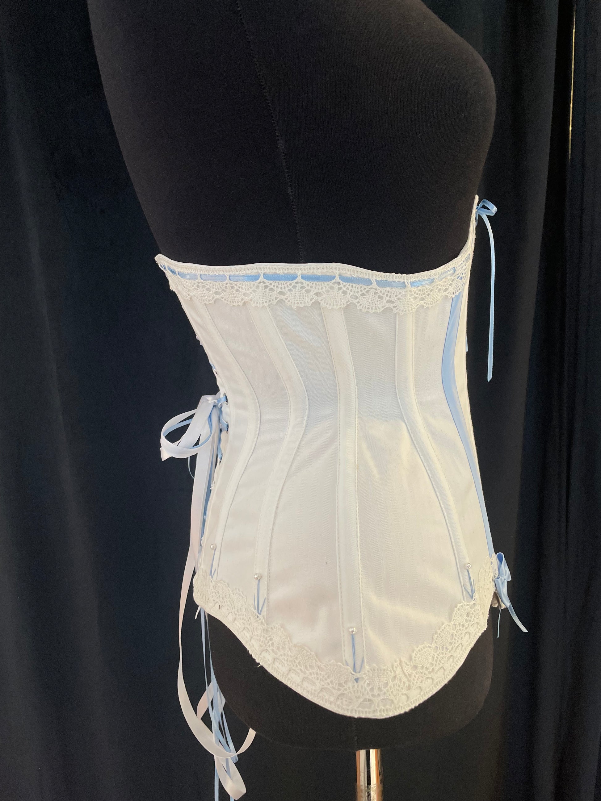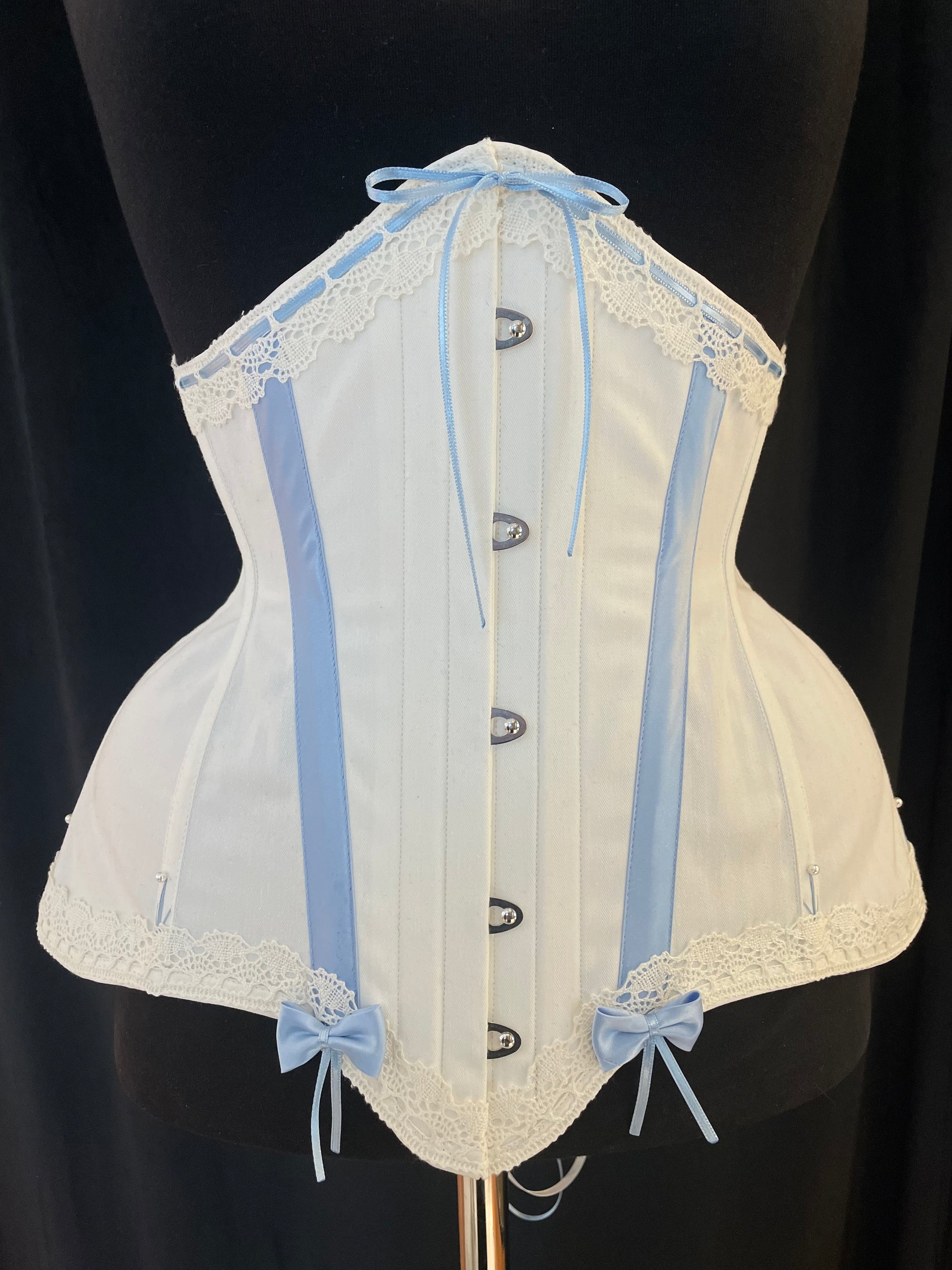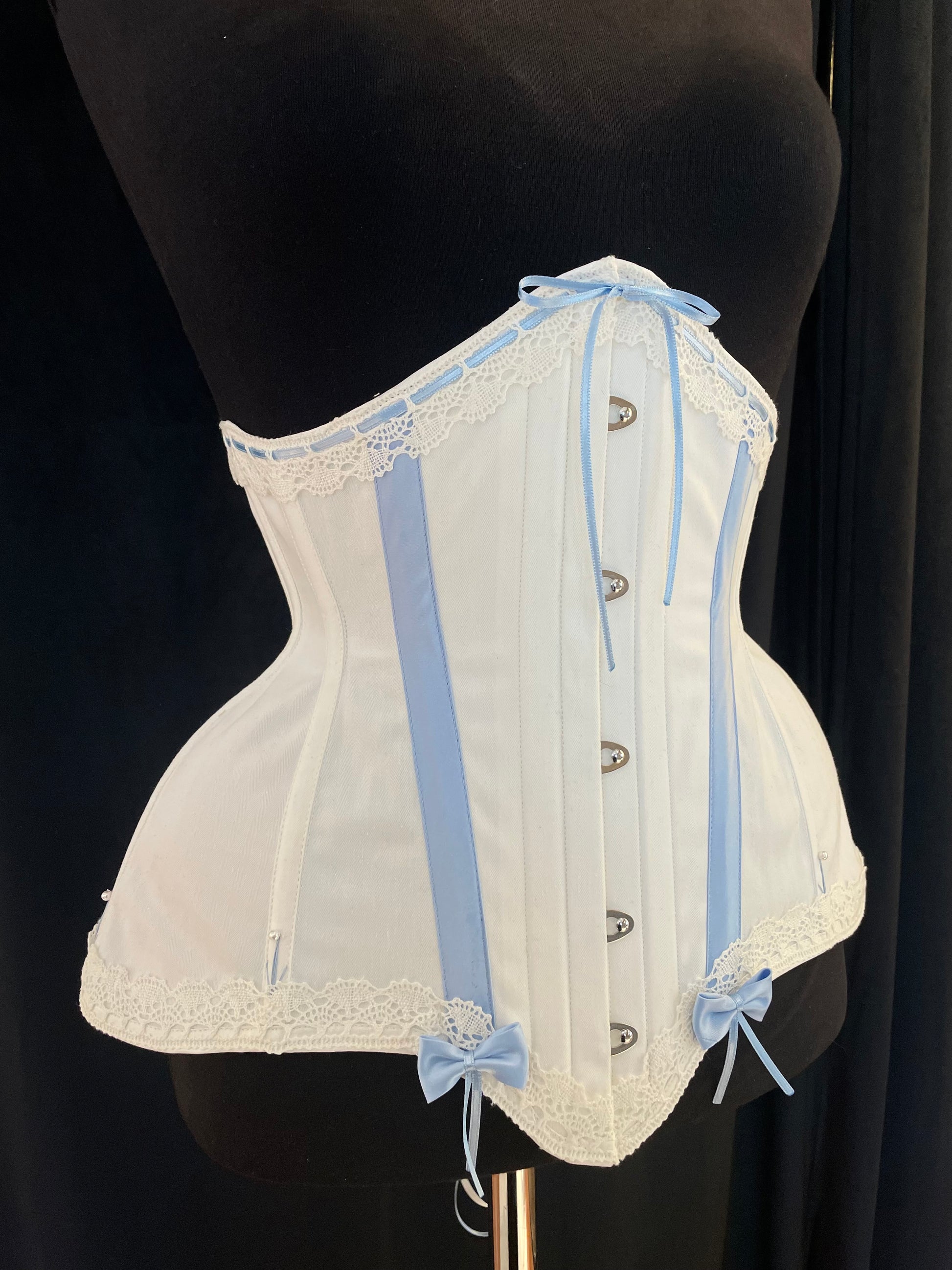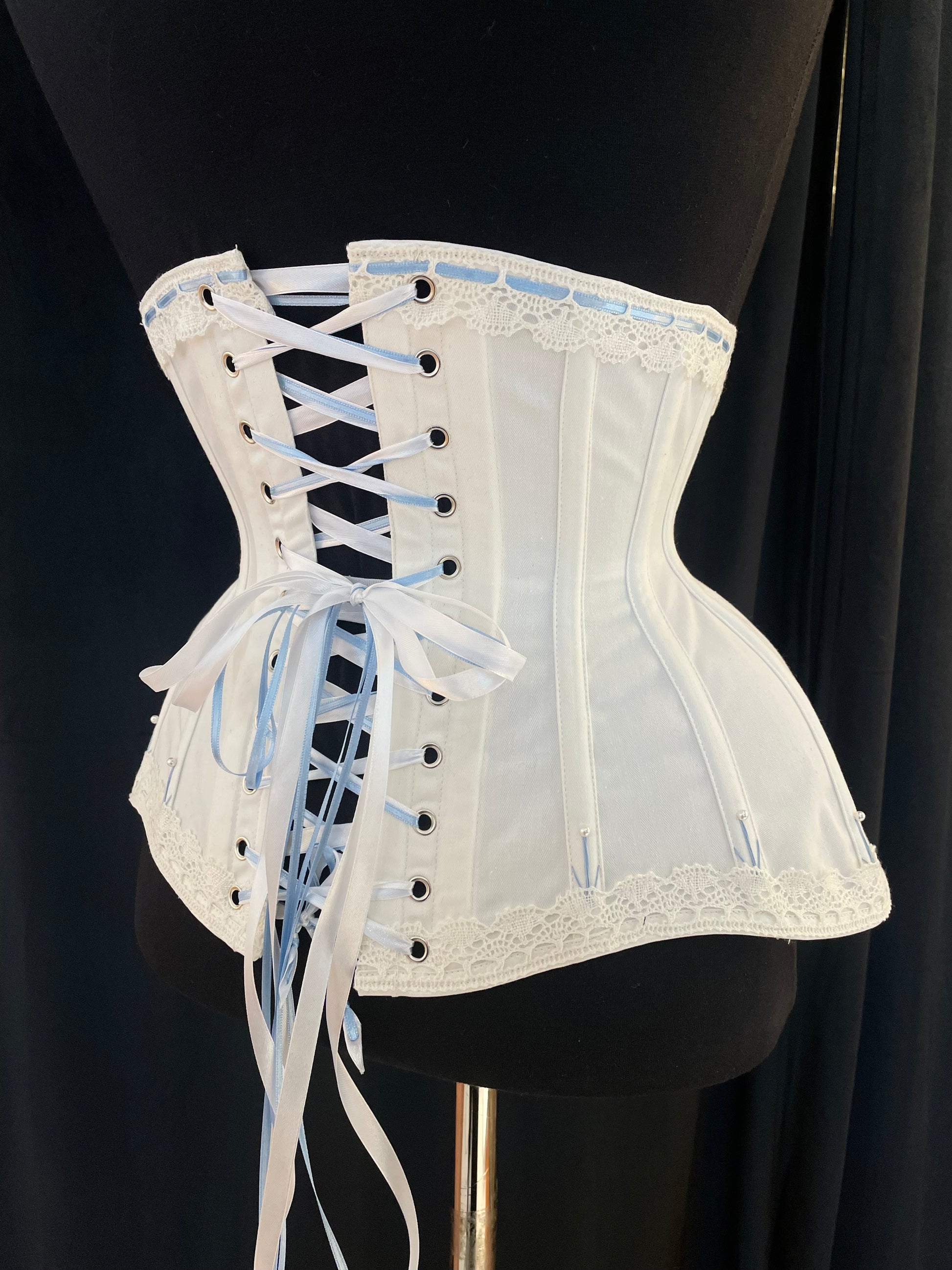 Korsetin muoto on todella radikaali, joten voit laittaa sen alle lantiolle toppausta, jotta muoto asettuu kauniisti. Todella harva edes kokenut korsetin käyttäjä pystyisi tämän muotoista korsettia täyttämään vain omalla varustuksellaan. Korsettien toppaus oli historiassa todella yleistä. Korsetilla ja muotoa tuovilla rakenteilla haettiin trendikästä siluettia ja ylävartalon, erityisesti rintojen tukea. Siluettia haettiin monella eri tavalla, kuten korseteilla vannehameilla ja luutetuilla rakenteilla rinnan päälle. Tapa oli vapaa kunhan lopputulos on hyvä. Korsetin toppaaminen oli siis täysin sosiaalisesti hyväksytty keino. Vanhan ajan ihmiset leikittelivät paljon eri muodoilla ja silueteilla, mutta meille on jäänyt heidän käytöksestään ja vaatetuksestaan todella rajattu näkemys, josta vain osa on totta, ja osa tiedosta on ajan saatossa ja vääristynyt ja jopa radikalisoitunut median myötä.