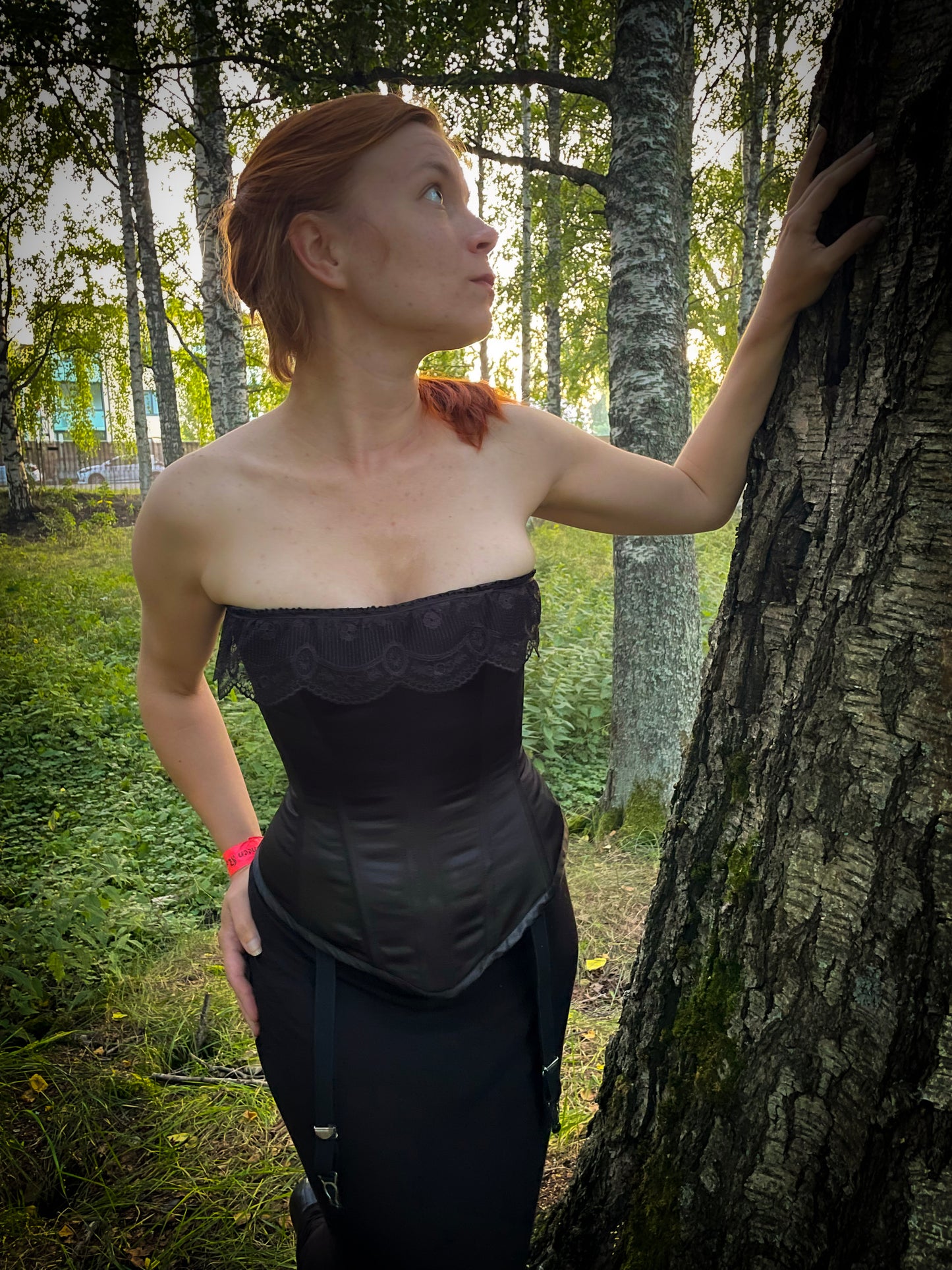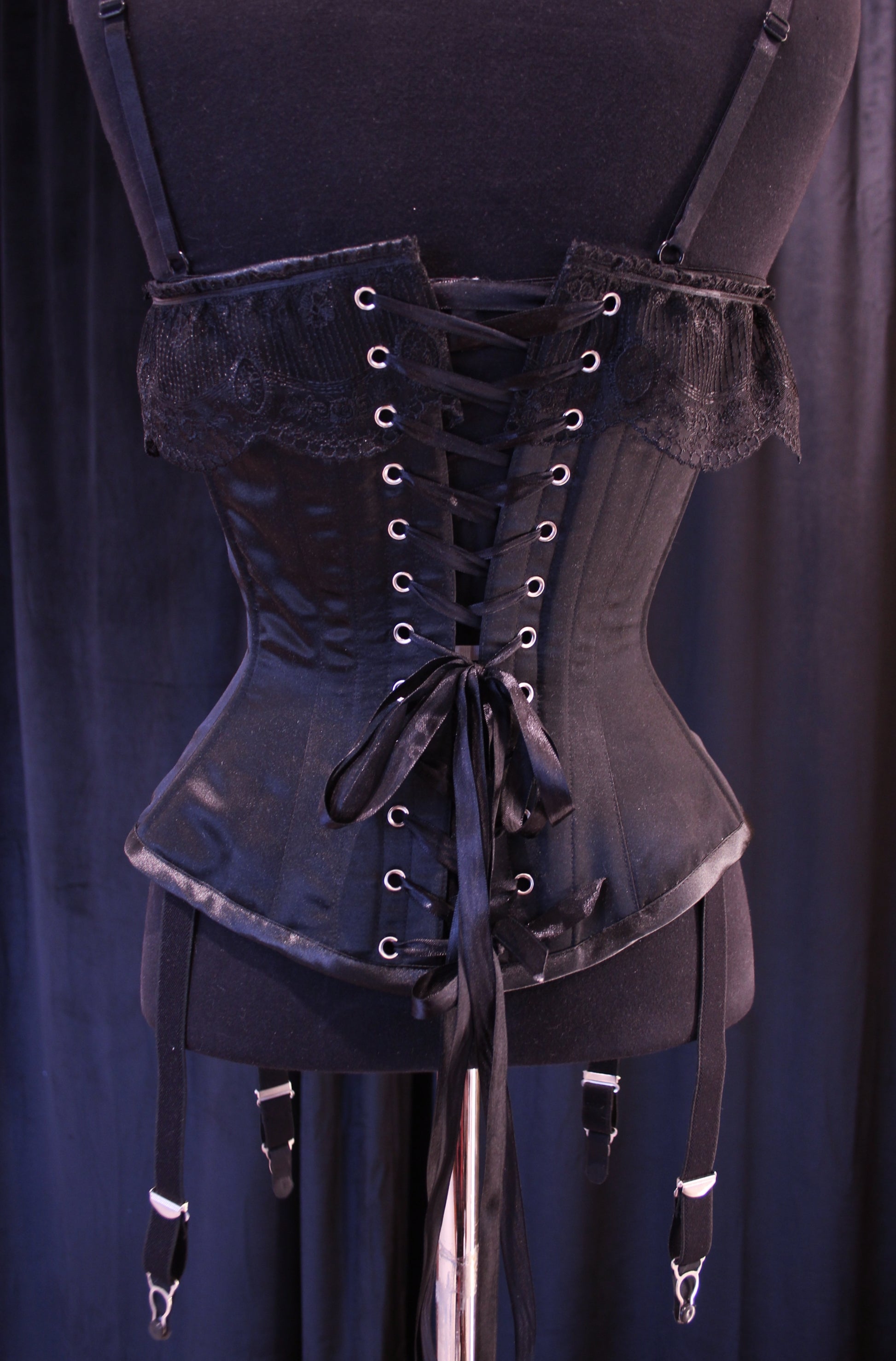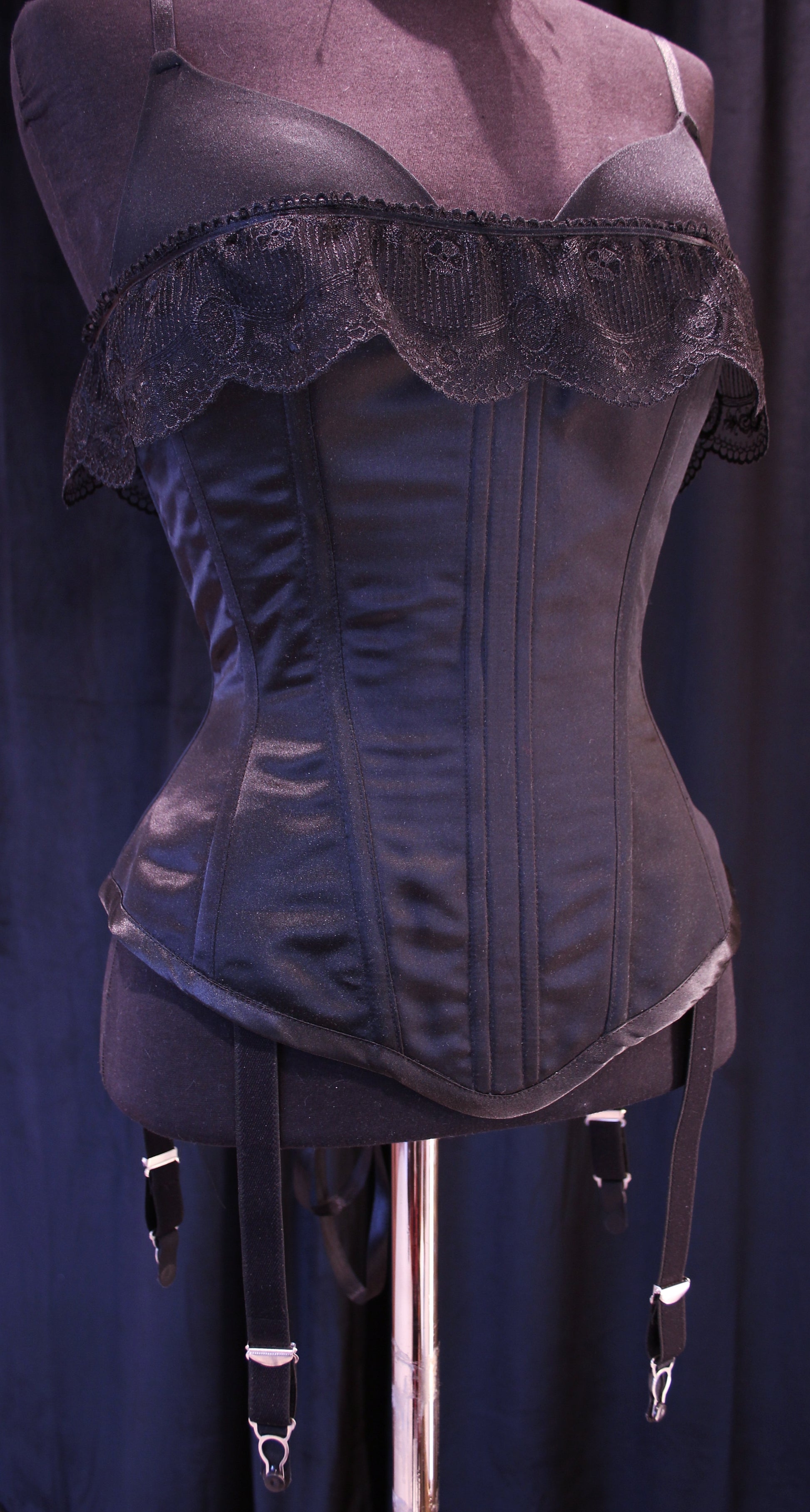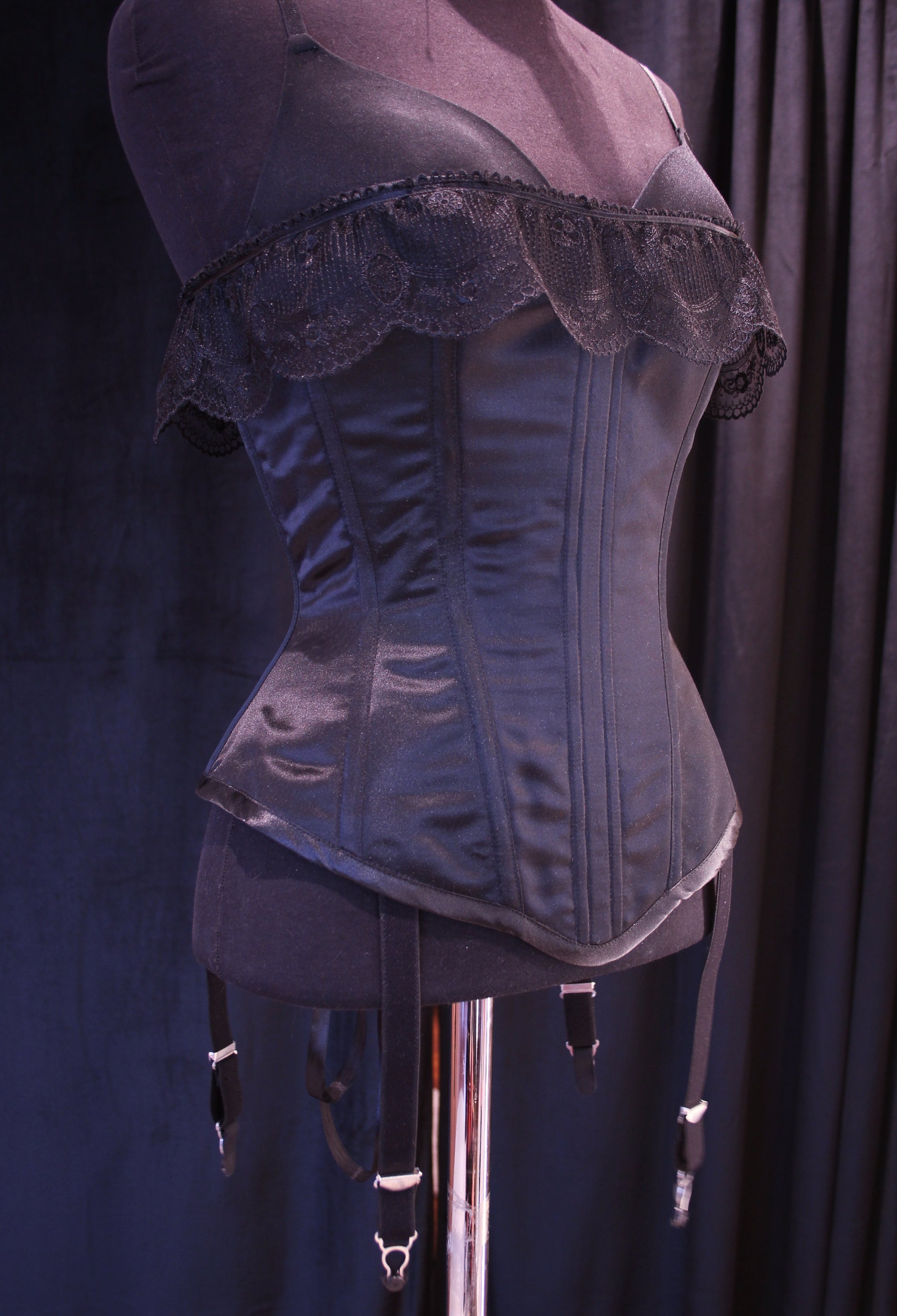 Seksikäs ja halaava korsetti sukkanauhapidikkeillä. Malli on balconette eli ylettyy rinnan puoleen väliin, tätä havainnollistaa rintaliivit. Päällikerros polyesterisatiinia, vuori puuvilladenimiä. Korsetti on tukeva ja mukava päällä! Tuettu synteettisellä valaanluulla.