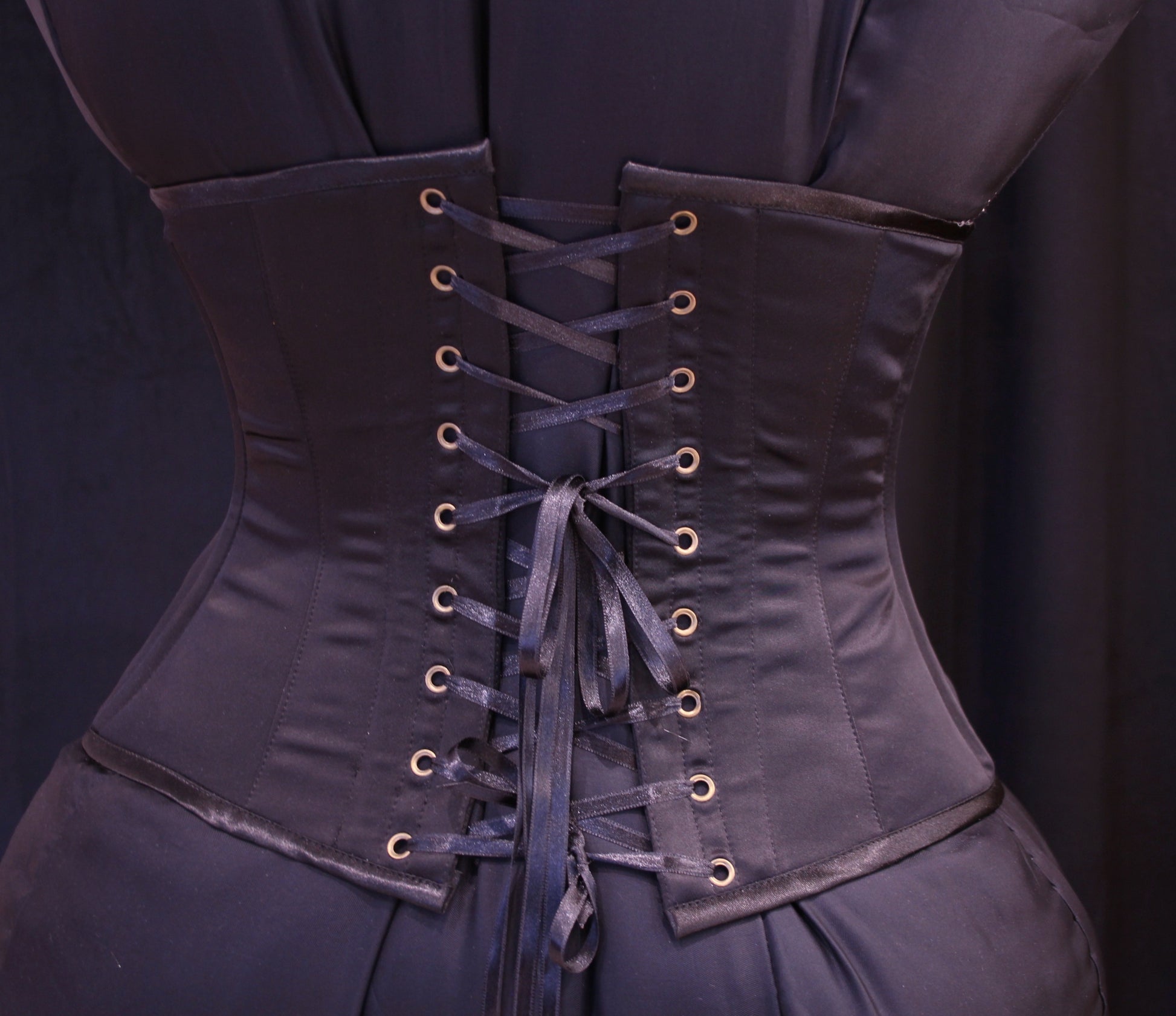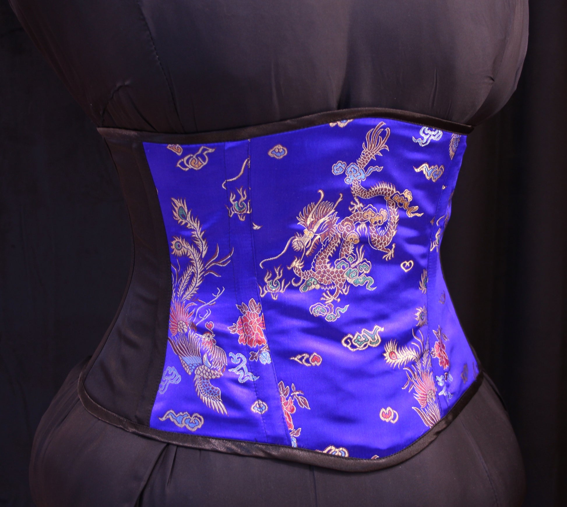 Rakel-kaavalla toteuttu vyötärökorsetti, ylellistä satiinia, vuoritettu denimillä. Synteettinen valaanluutuki. Soveltuu kiristämiseen.