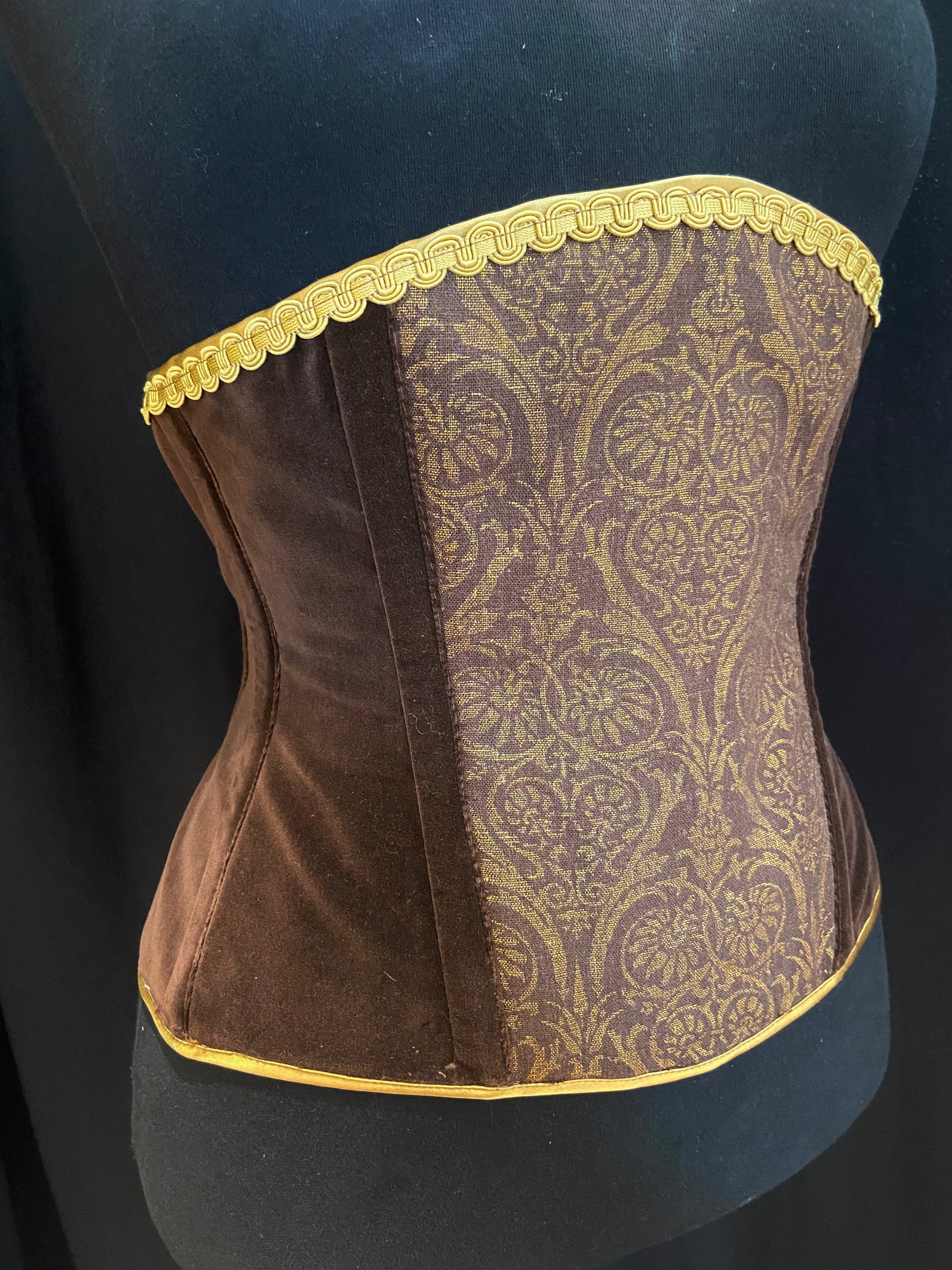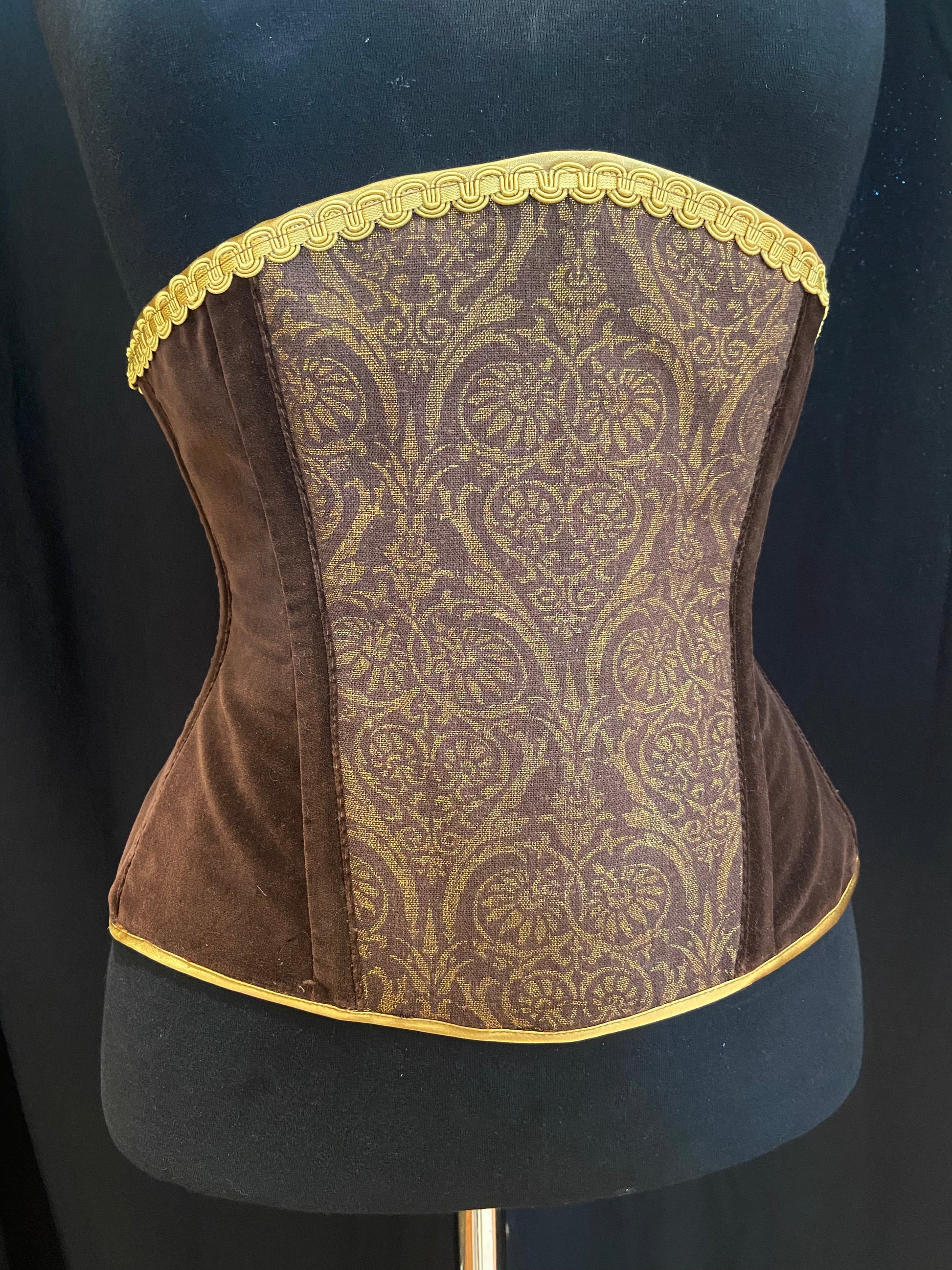 Rinnan alle ylettyvä, tummanruskeaa puuvillasamettia ja pellavasekoitekuviokangas edessä. Vuoritettu puuvillalla.