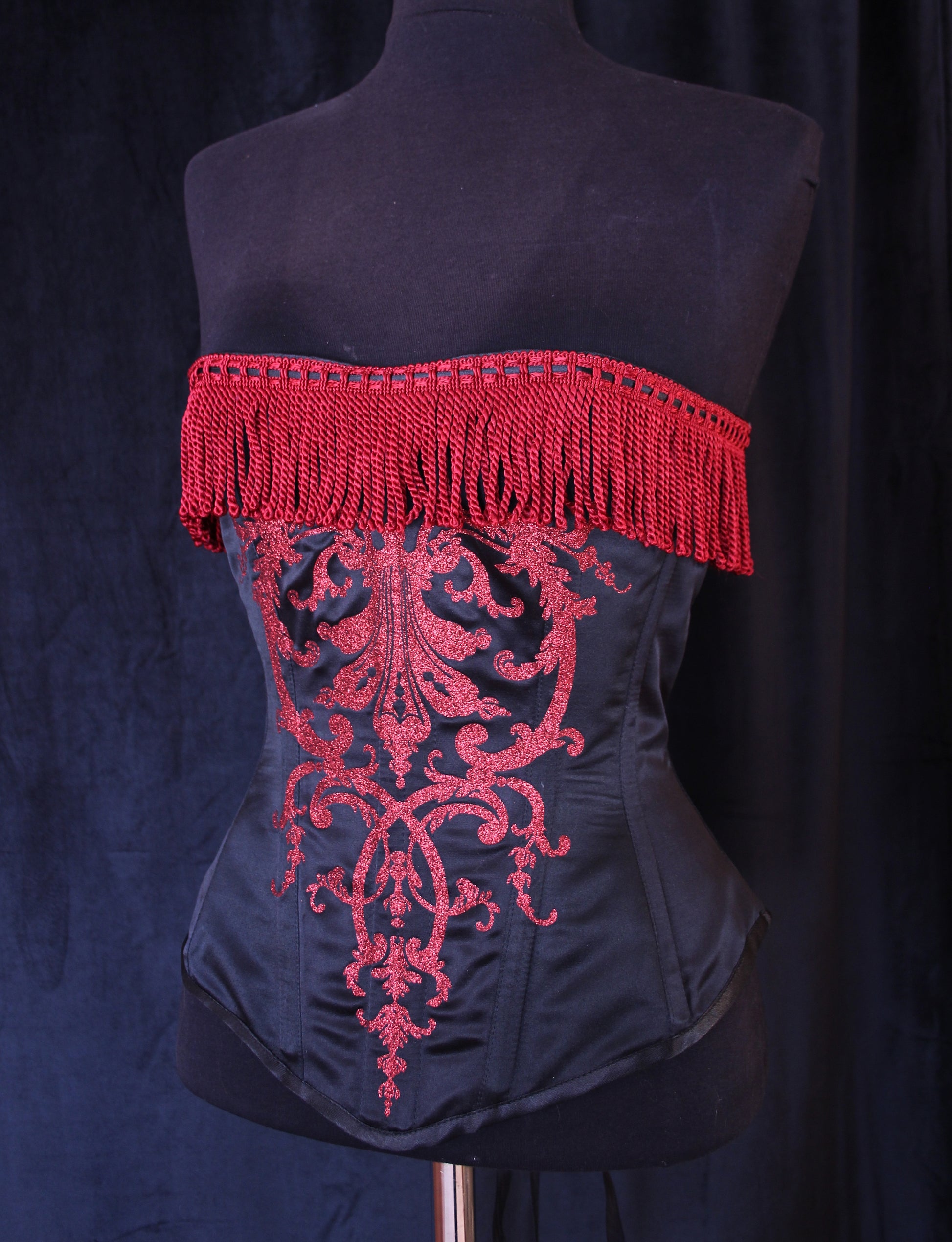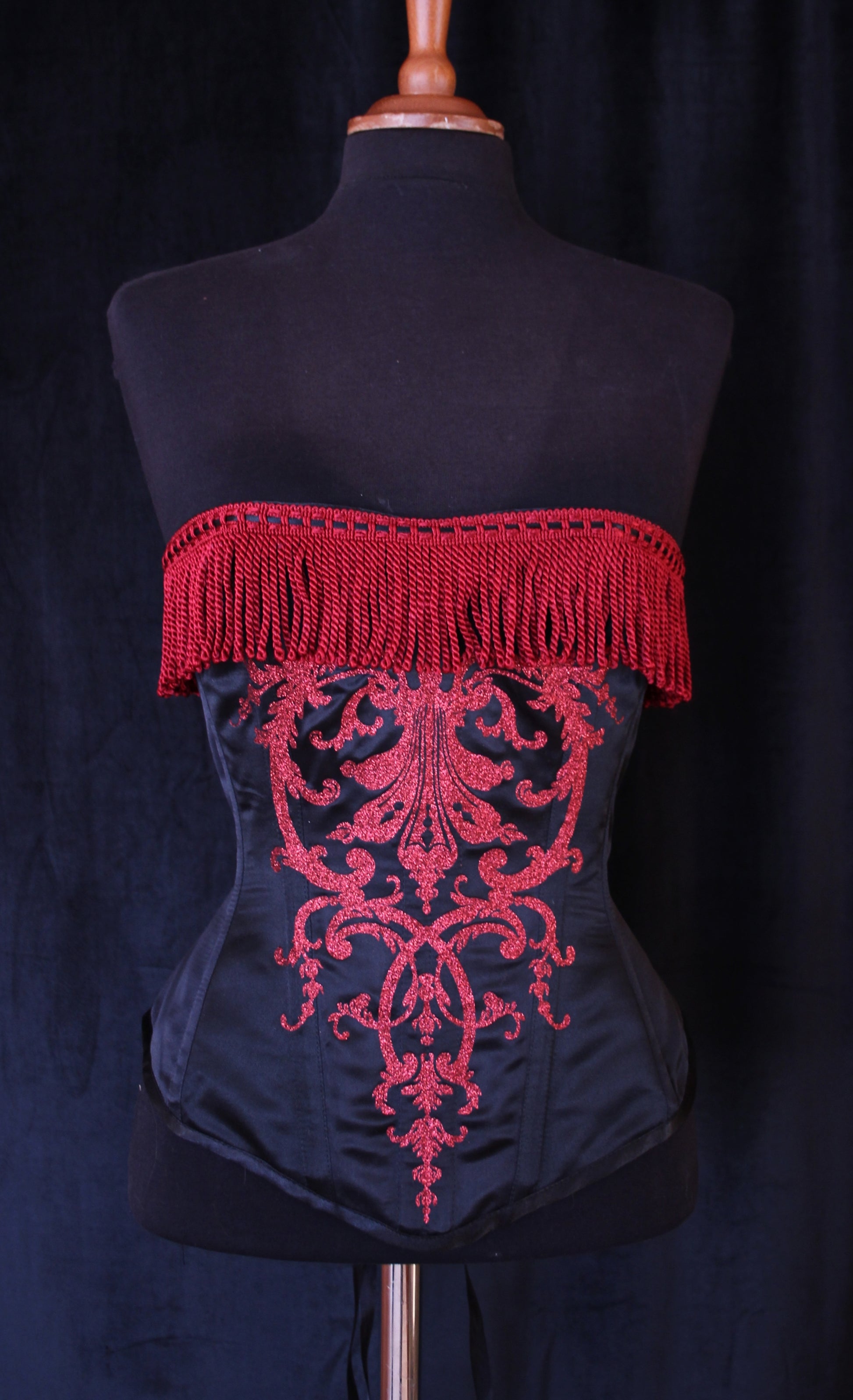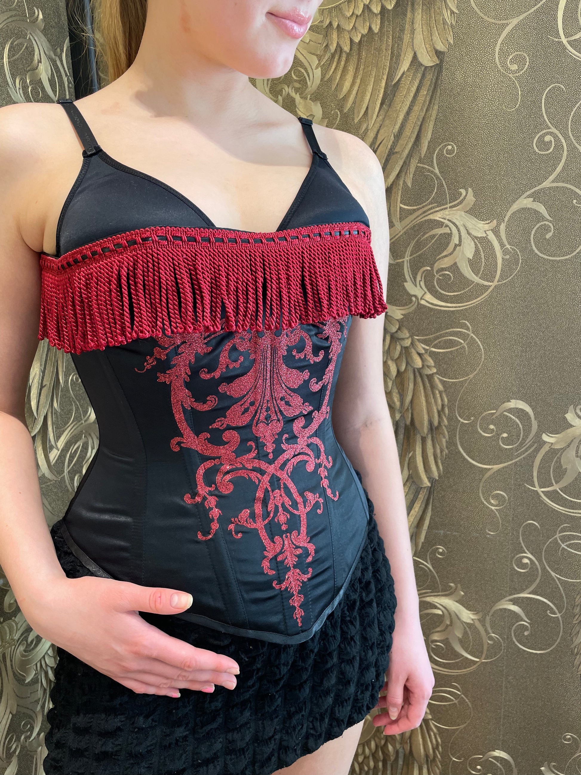 Balconette mallinen korsetti hapsuilla! Etumuksen kuviointi on glitterinen ja kimaltaa valossa. Tästä löytyy rohkeaa burleskihenkeä ja leikkisyyttä! Korsetti ylettyy vähän rinnan puolenvälin yläpuolelle, päällikangas on polyesterisatiinia, vuoritettu puuvillakankaalla.