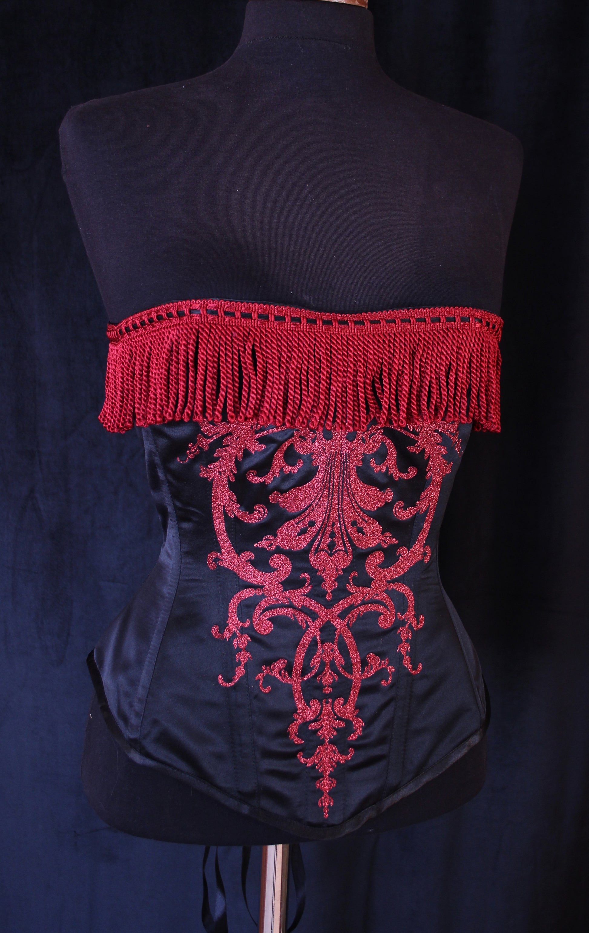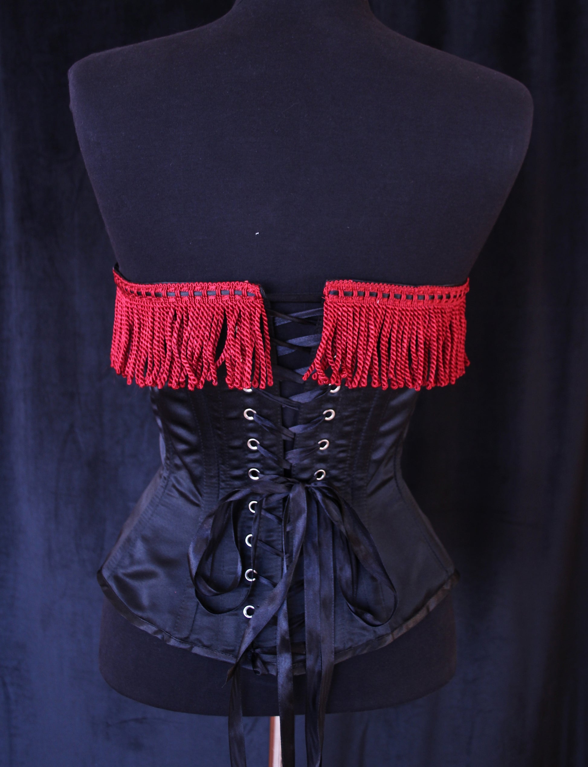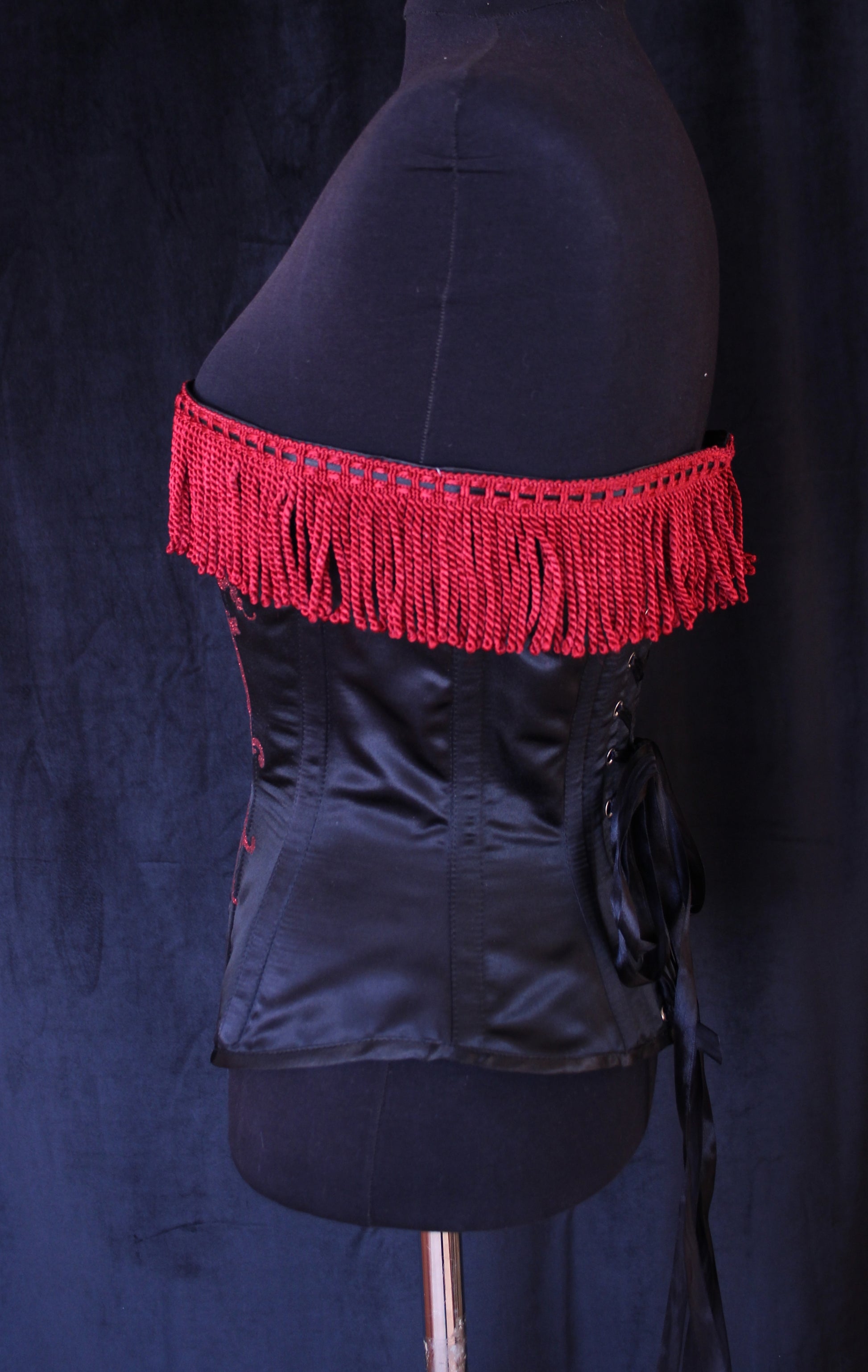 Balconette mallinen korsetti hapsuilla! Etumuksen kuviointi on glitterinen ja kimaltaa valossa. Tästä löytyy rohkeaa burleskihenkeä ja leikkisyyttä! Korsetti ylettyy vähän rinnan puolenvälin yläpuolelle, päällikangas on polyesterisatiinia, vuoritettu puuvillakankaalla.