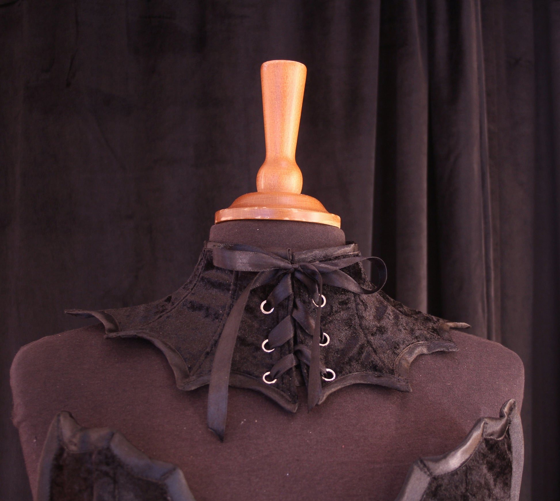 Näyttävä kauluri upealla lepakkoreunalla! Kauluri on mukava päällä ja edestä kiinnittyvä. Oivallinen lisä vampyyrikuningattaren asustevalikoimaan, tai ruokakauppaan päitä kääntämään. Päällikerros loimusamettia, vuorikangas denimiä.
