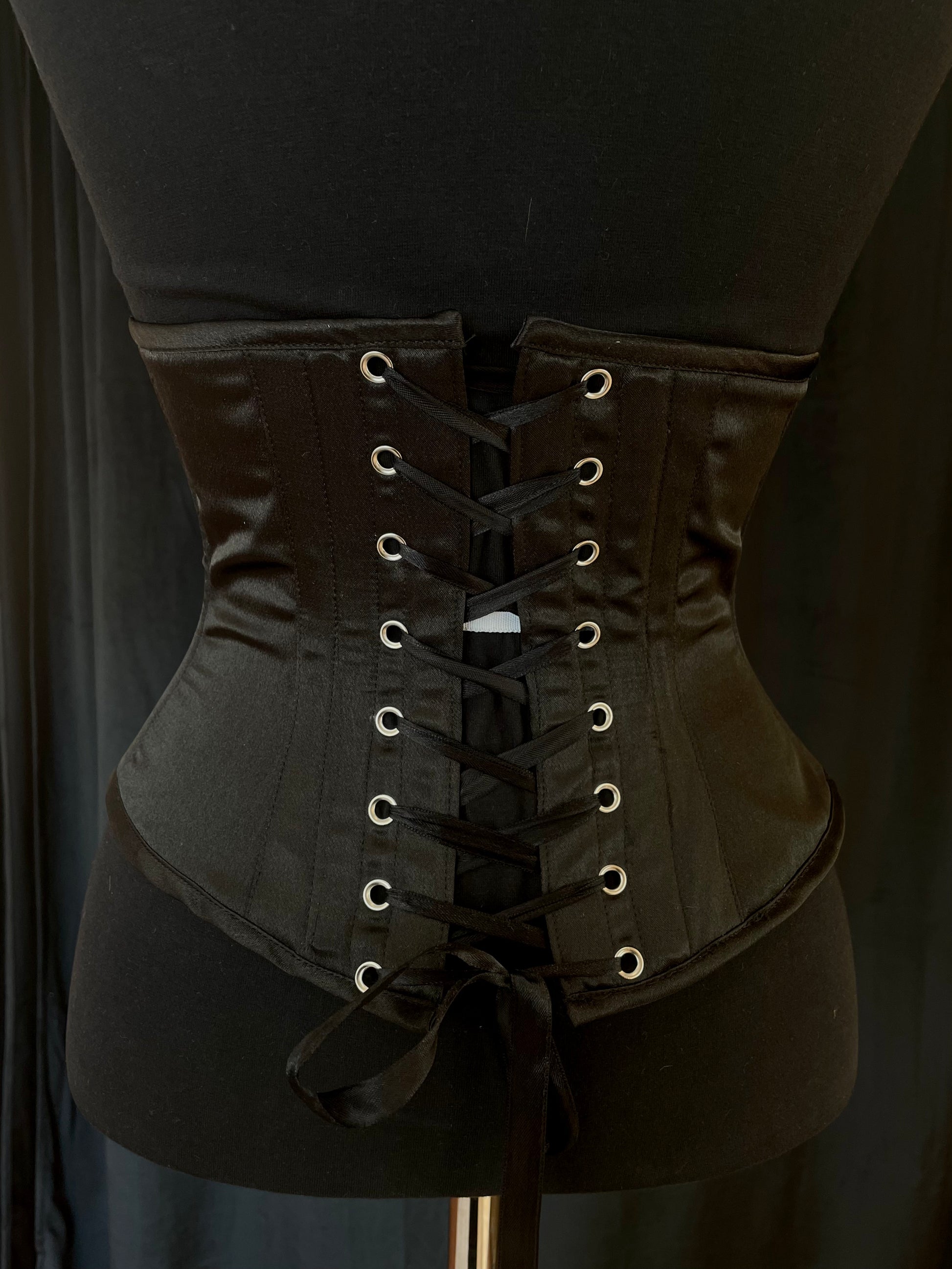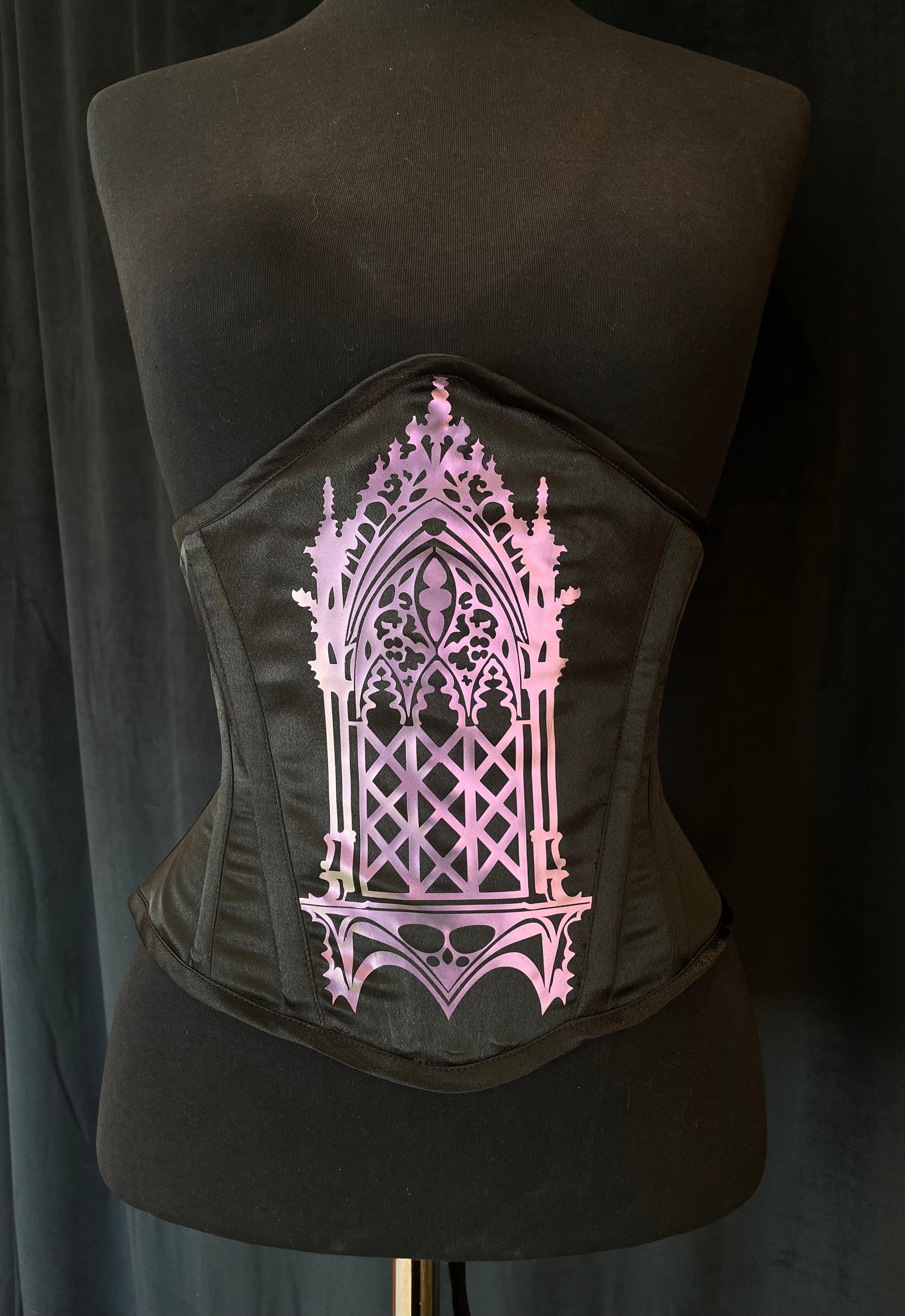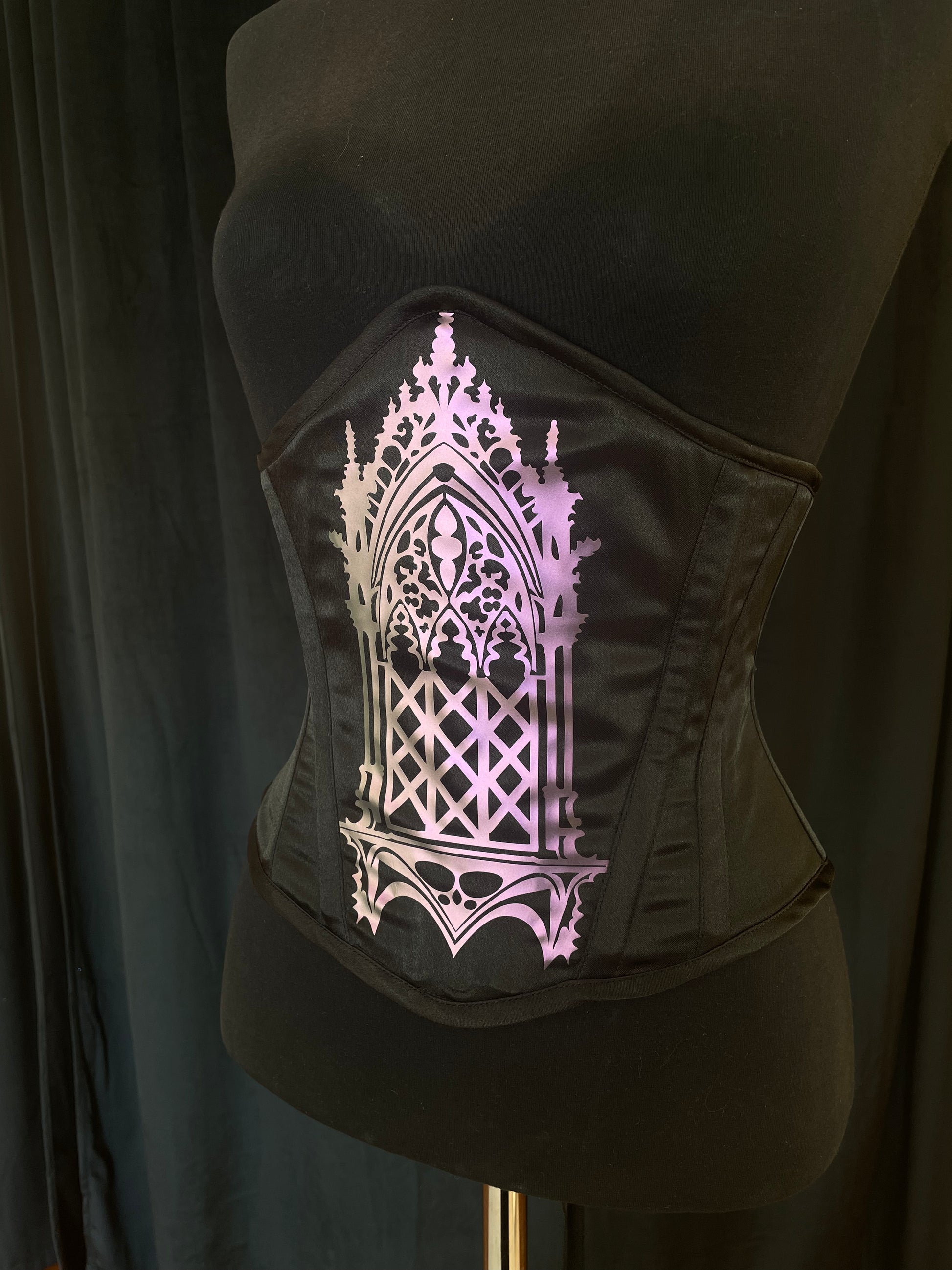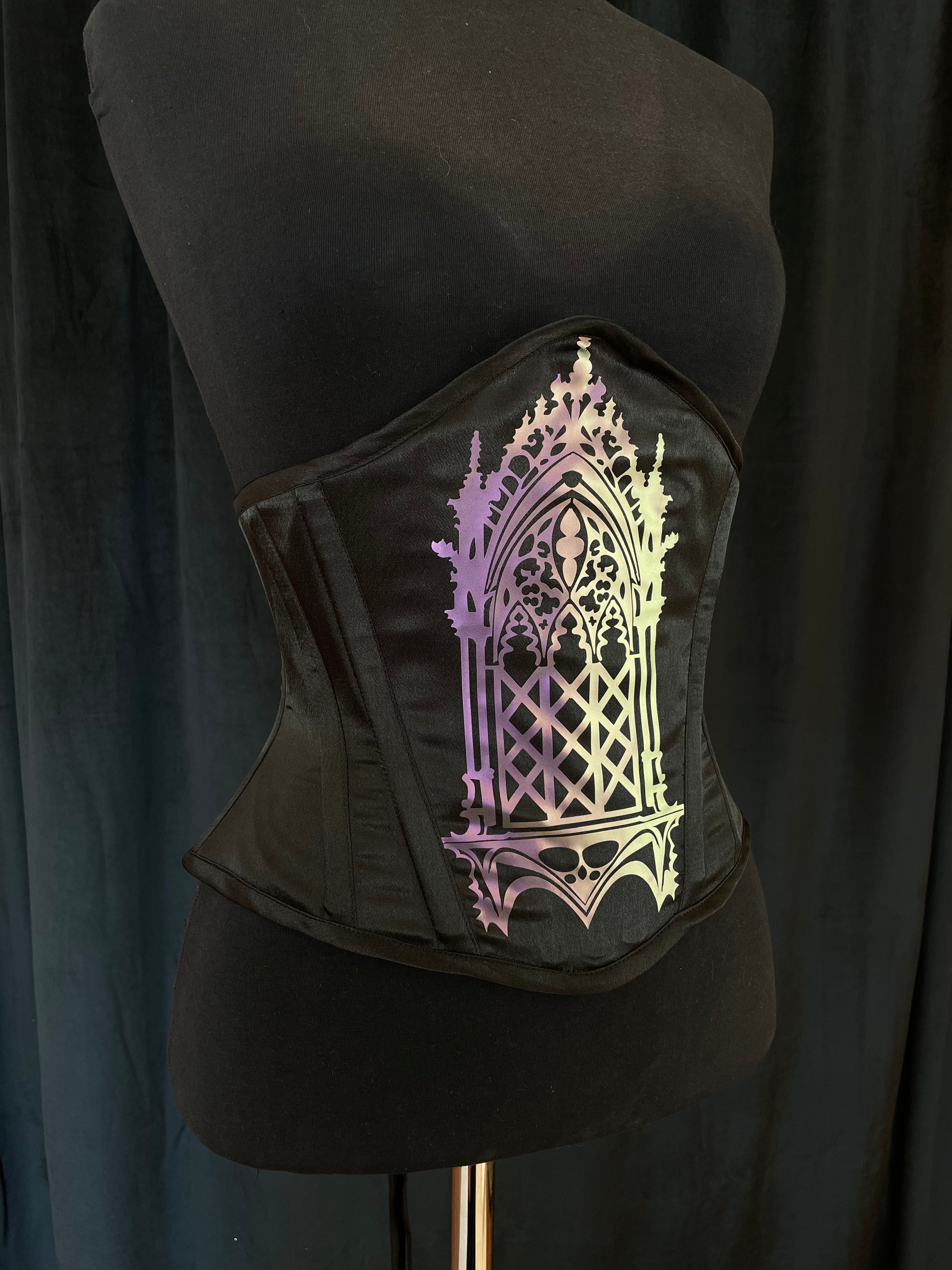 Musta satiinikorsetti hologrammimaisella kuviolla. Kuvion väri violetti joka shiftaa vihreään.