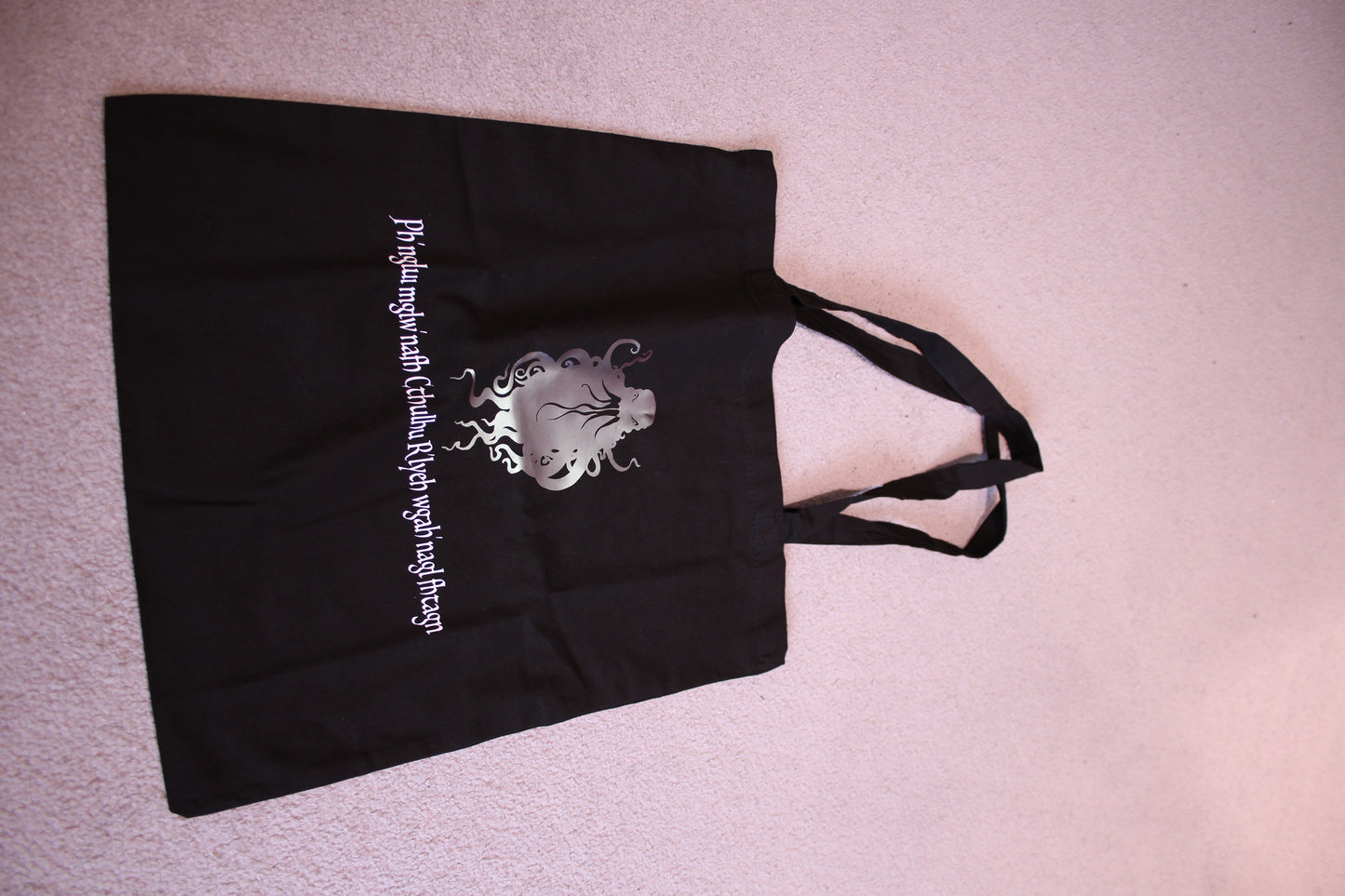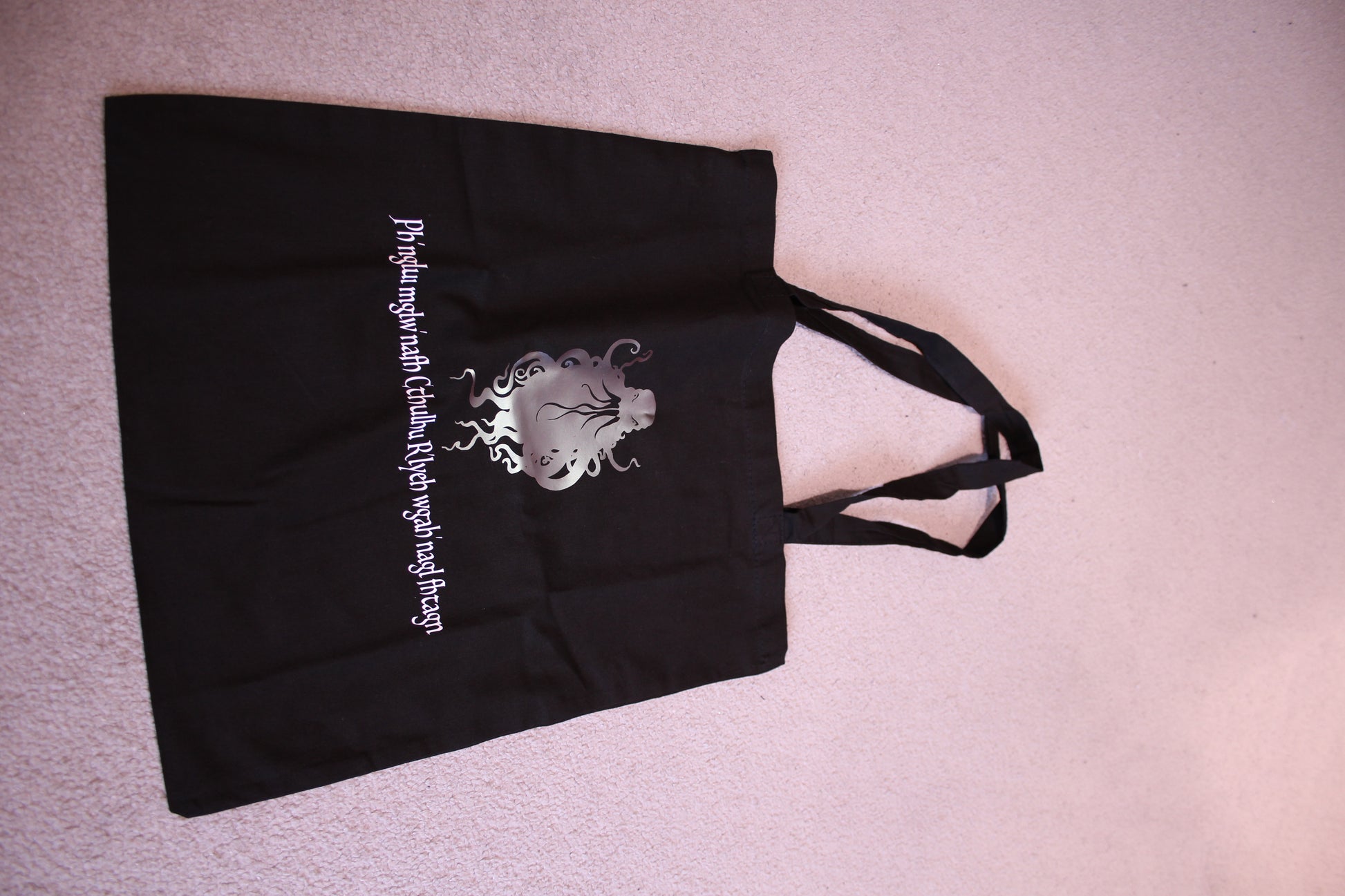 Perinteinen musta kangaskassi moneen menoon. Kuvio hopea glitter. Jollain saattaa olla nuoli polvessa.