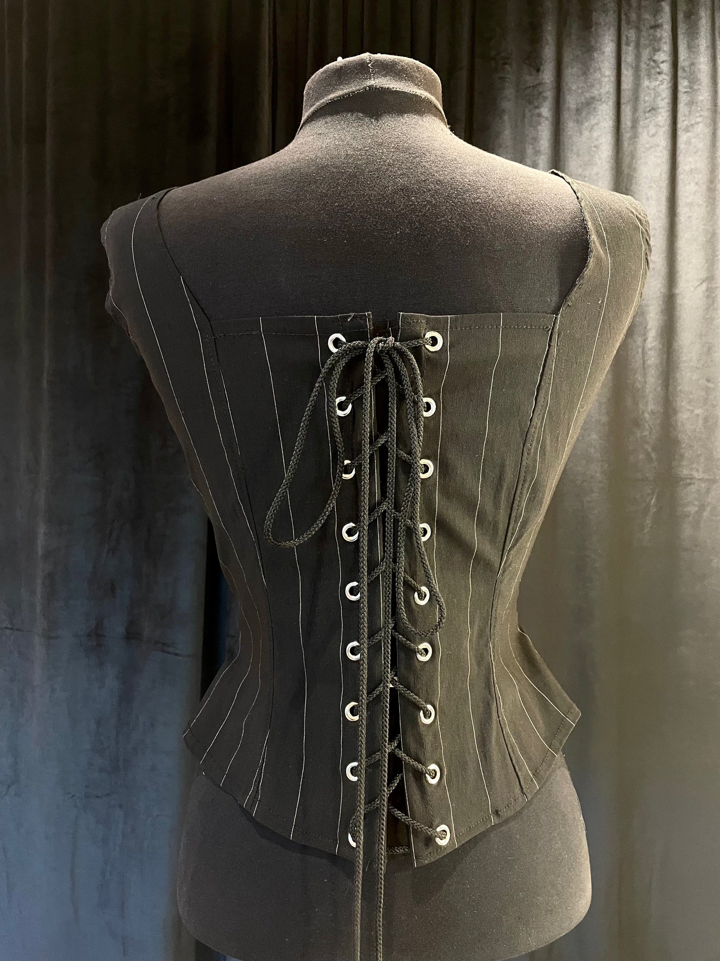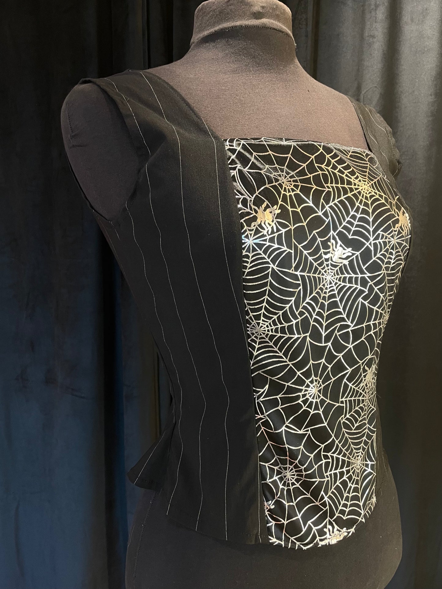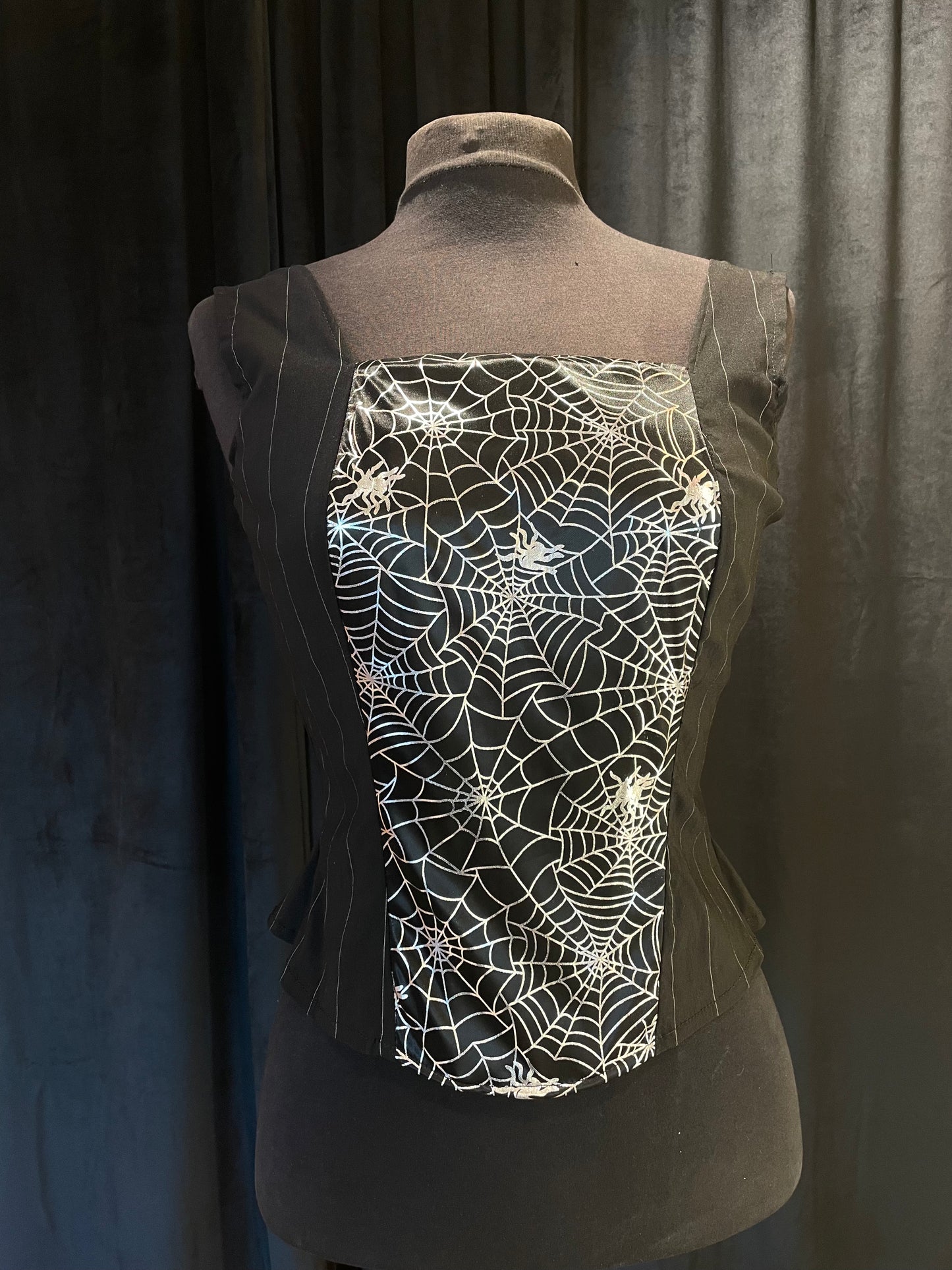 Hämähäkinverkon ja raitojen koristama toppi. Loistava gootin arkivaate! Toppi on luutettu edestä ja takaa, tukien rintaa ja nostaen ryhtiä hieman, mutta tämä vaate ei sovi kovaan kiristämiseen. Toppi on mukava päällä ja helppo yhdistellä eri asukokonaisuuksiin, se sopii niin farkkujen kaveriksi kuin hameen kanssa.