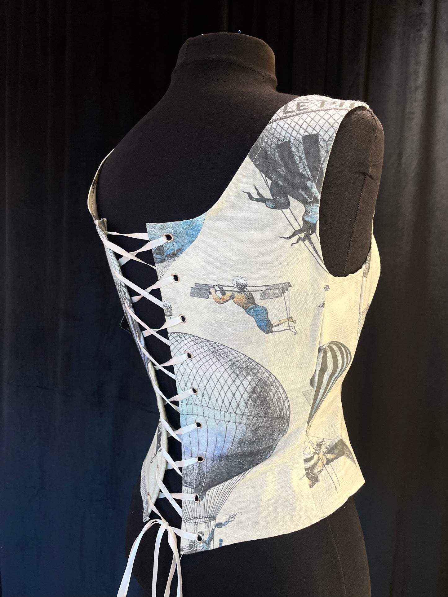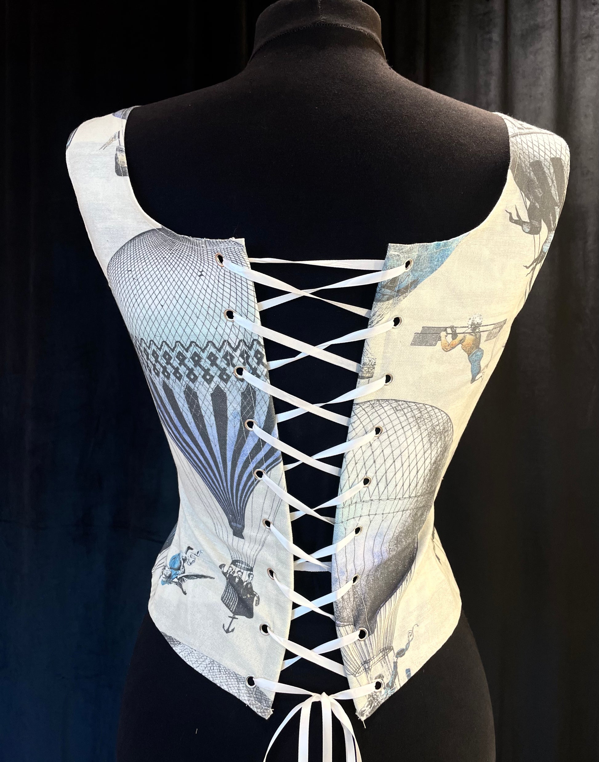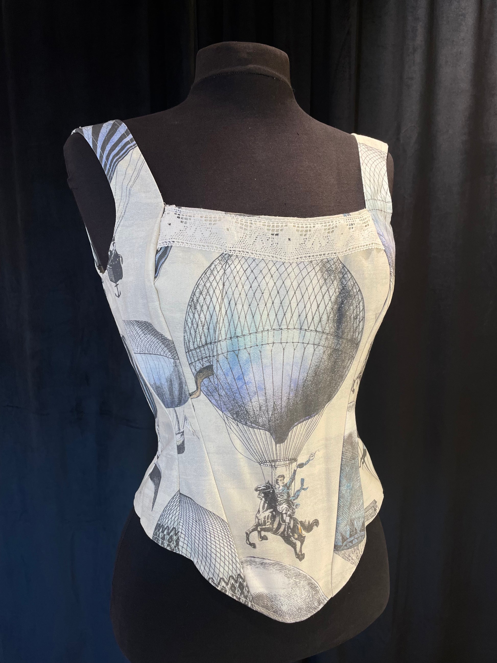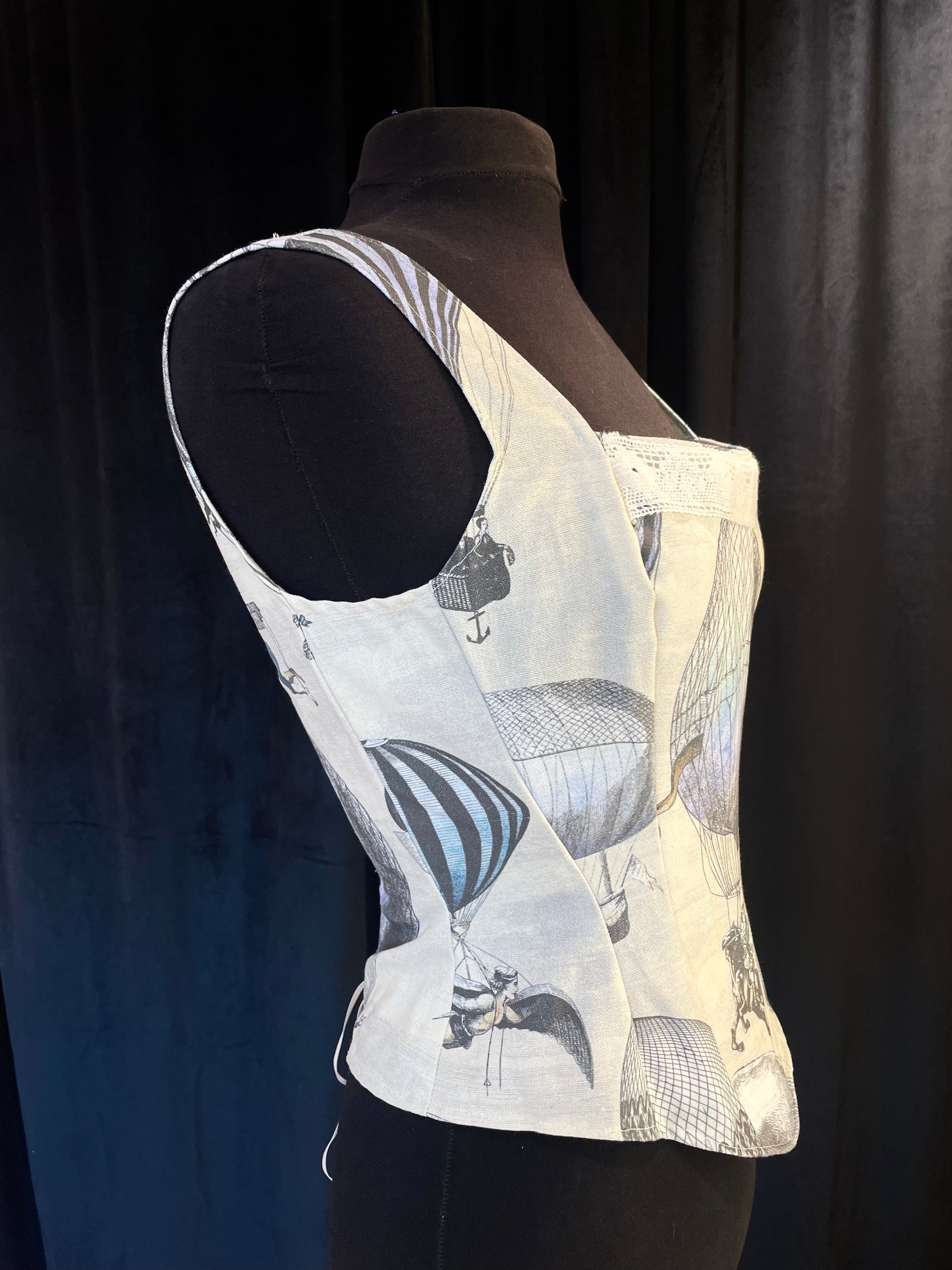 Hauska ja mukava toppikorsetti kuumailmapalloilla! Toppi on luutettu edestä ja takaa tukien rintaa ja nostaen ryhtiä hieman. Ilmiömäinen kuosi on kasuaali ja veikeä, tällä saat käännettyä päitä arjen askareissa. Toppi ei sovellu kovaan kiristämiseen, mutta sen kannattaa olla aavistuksen pienempi kuin oma kokosi, jotta sen saa nyöritettyä napakaksi.
