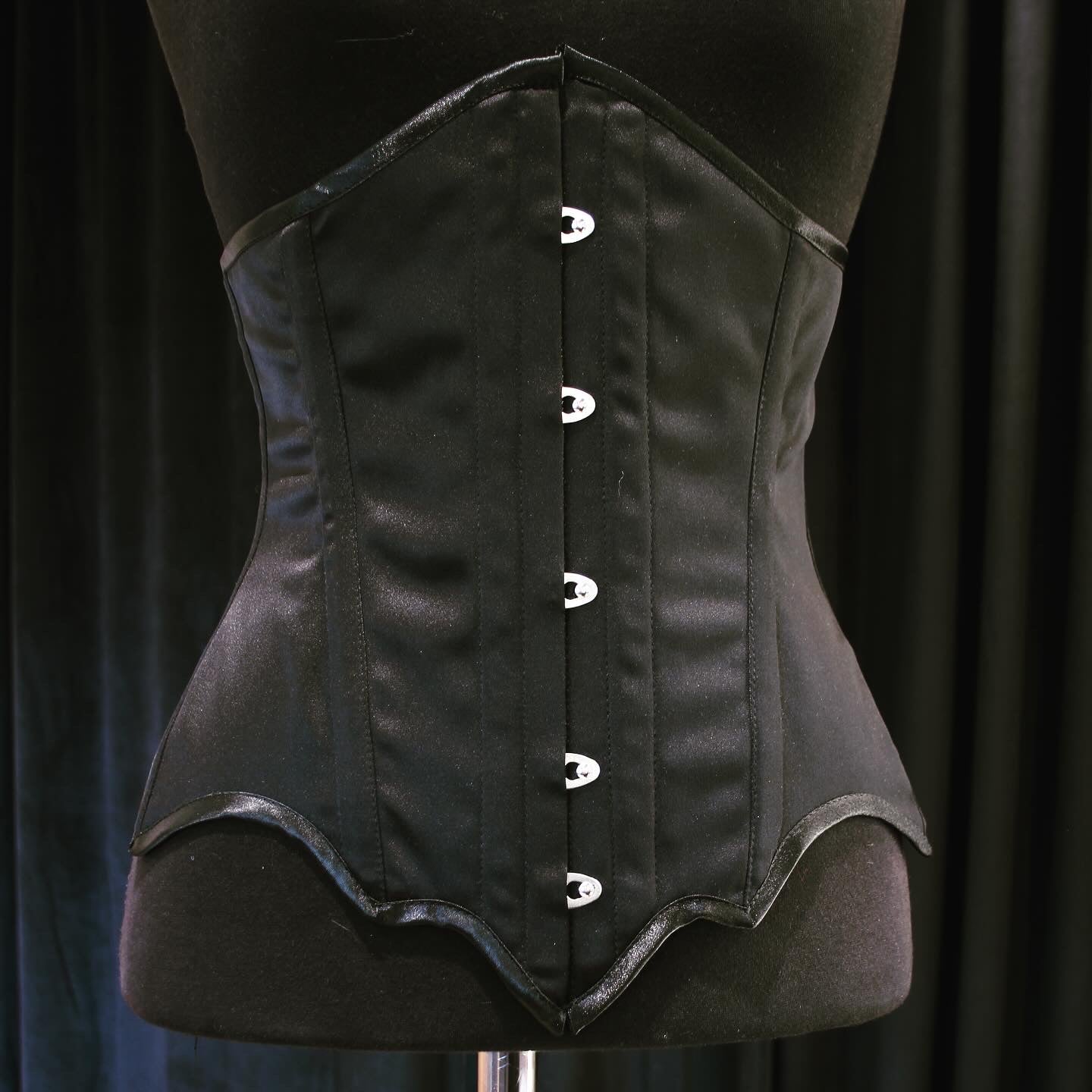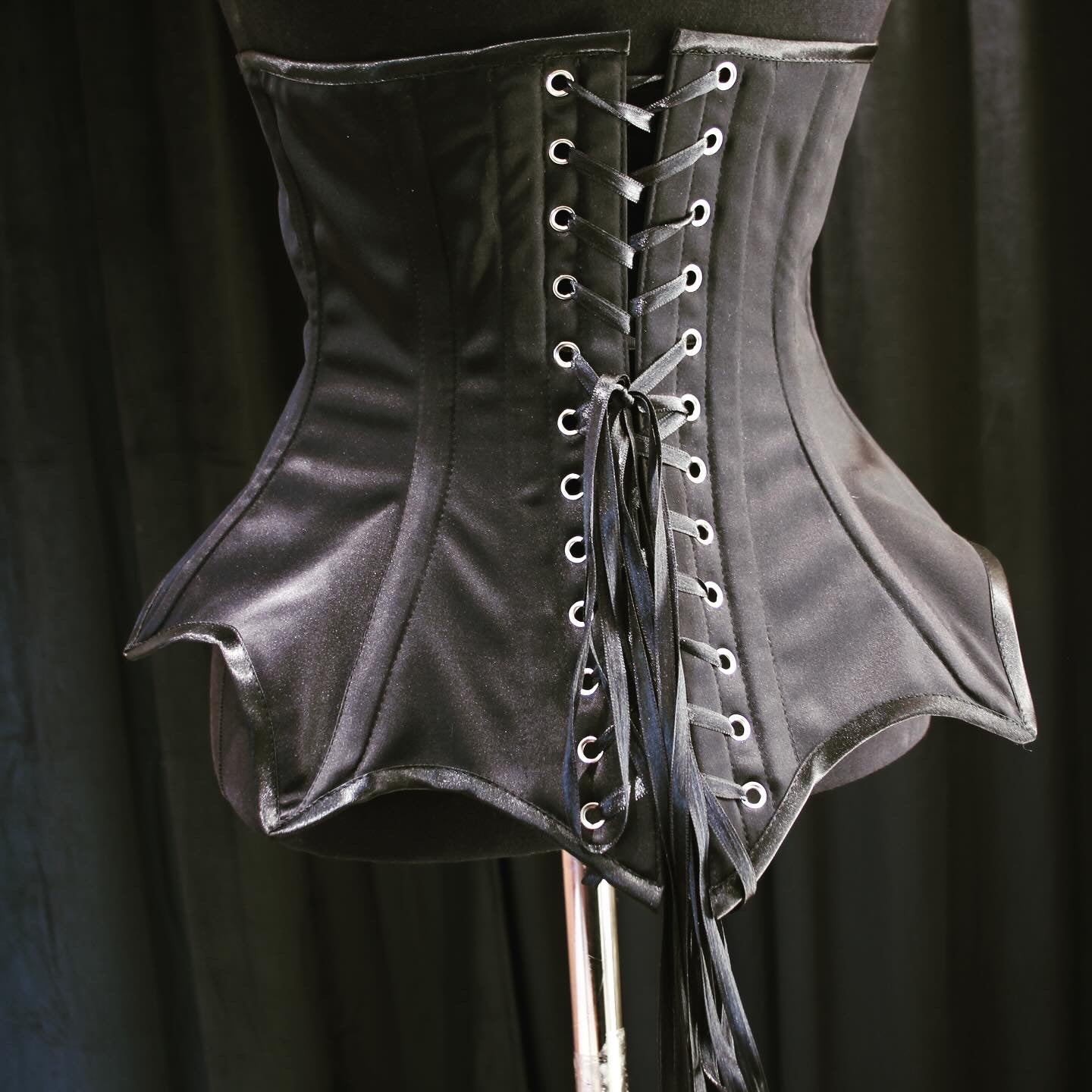 Tässä jokaisen noidan vaatekaappiin kuuluva perusvaruste! Mustaa satiinia oleva vyötärökorsetti, jonka helma on taakse pidentyvä ja levenevä. Sopii hyvin vaikka muhkeamman hameen päälle.