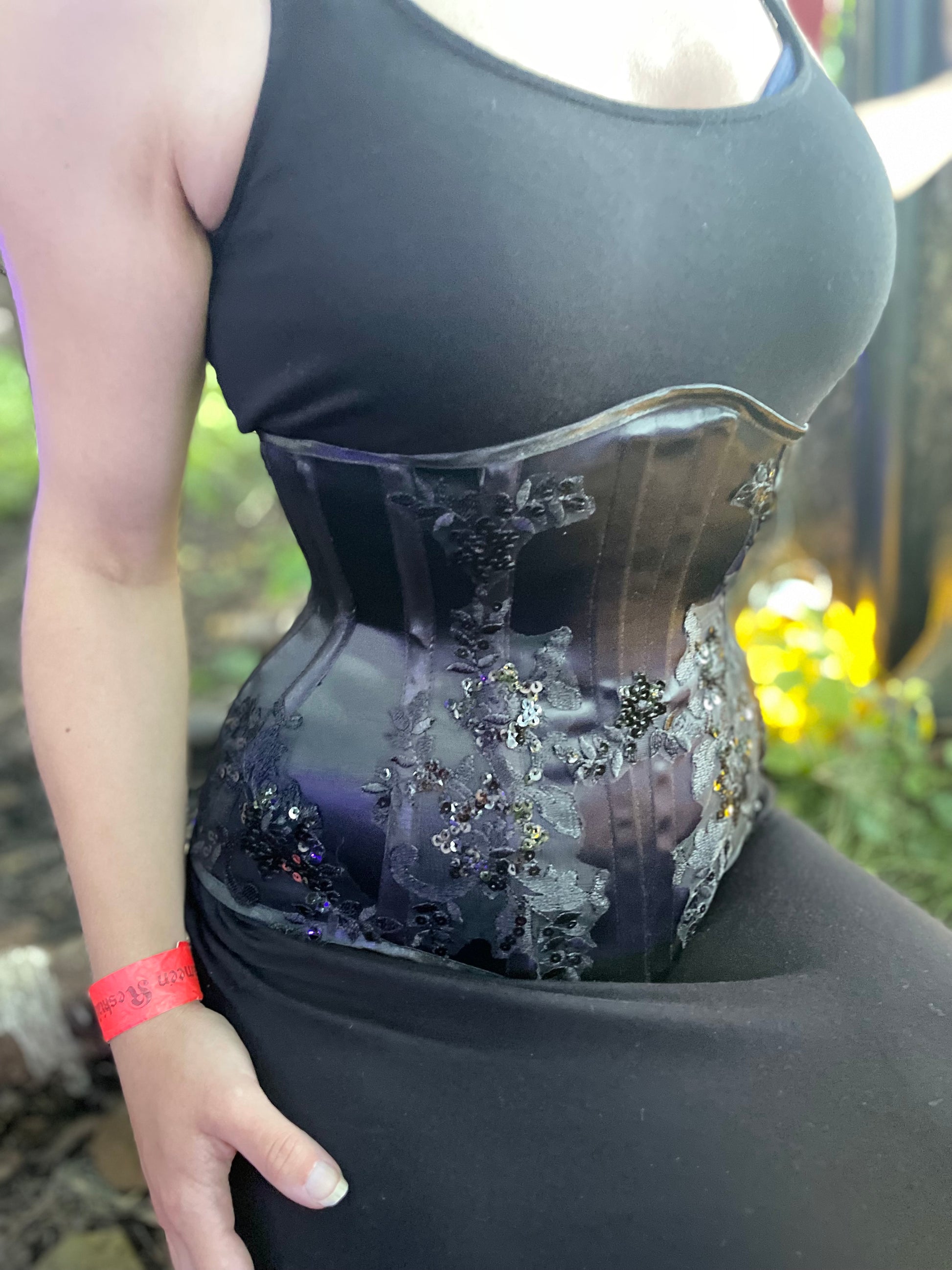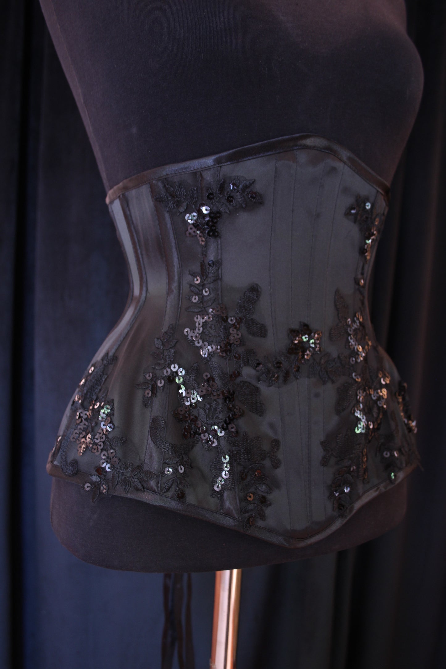 Upea satiinicoutil vyötärökorsetti kauniilla pitsiapliikeilla. Viskoosisekoitetta oleva korsetticoutil on hengittävä ja päälle mukautuva materiaali, joka kestää pitkään.