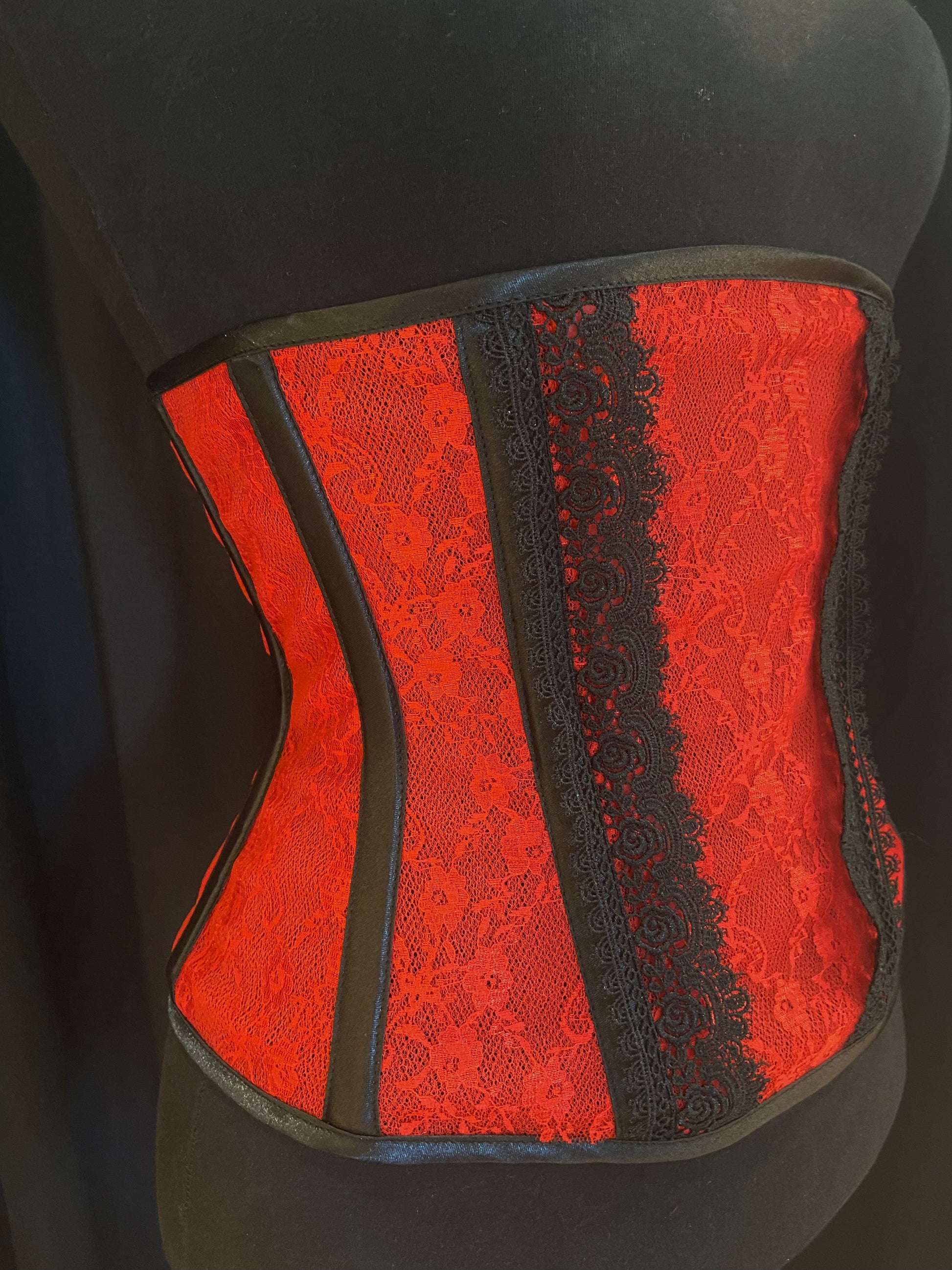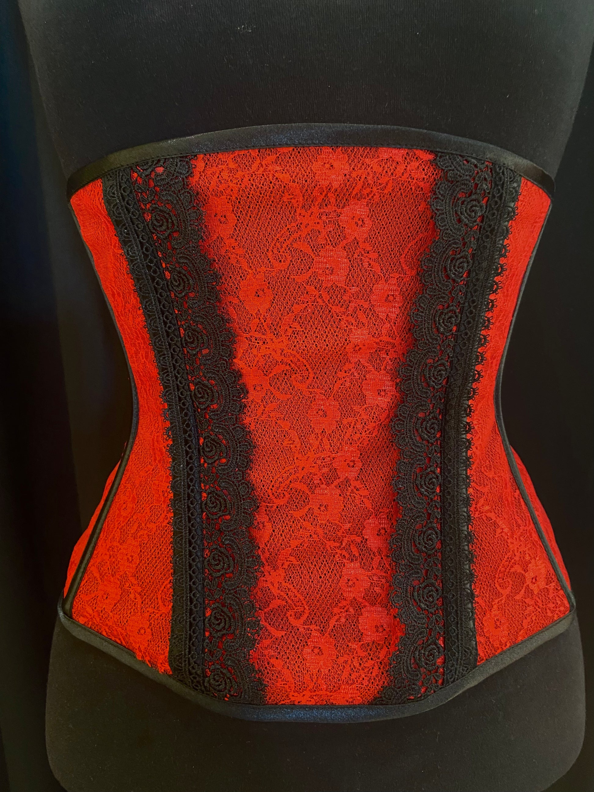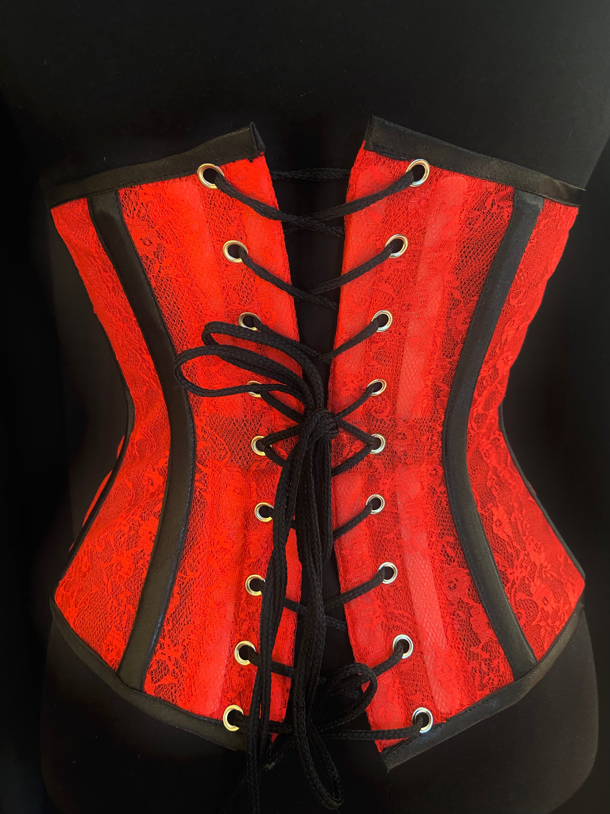 Näyttävä, läpikuultava kirkkaanpunainen vyötärökorsetti. Päällikerros söpöä pitsiä, vuori moninkertainen tylli. Alla joustamaton vyötärönauha. Luutettu kokonaan synteettisellä valaanluulla. Mustat koristelut. Soveltuu kevyeen kiristykseen.