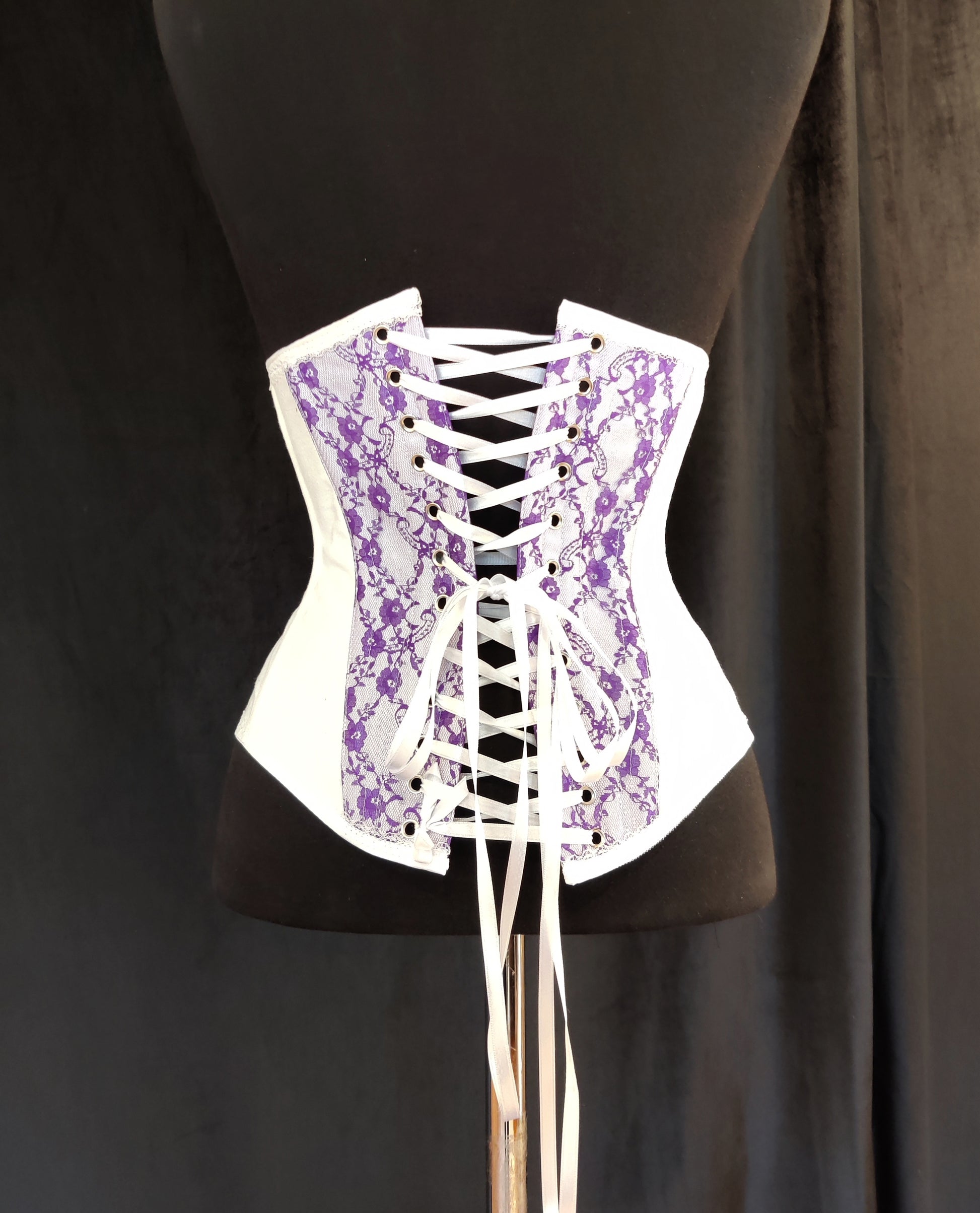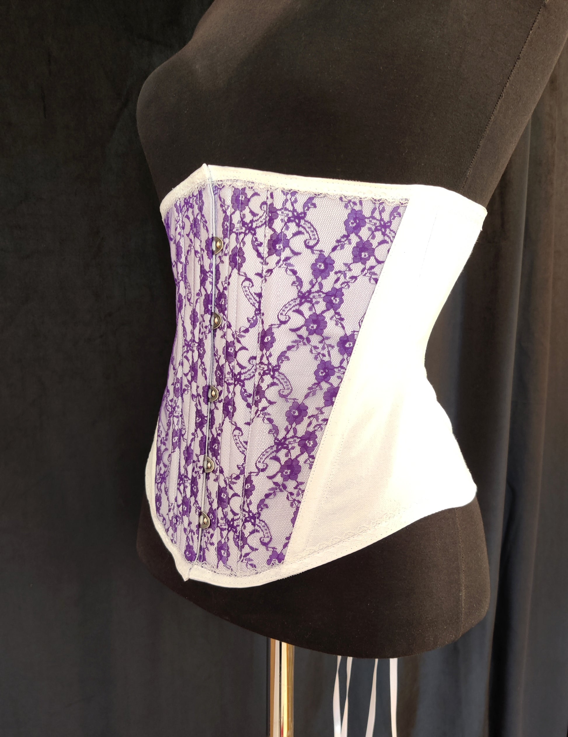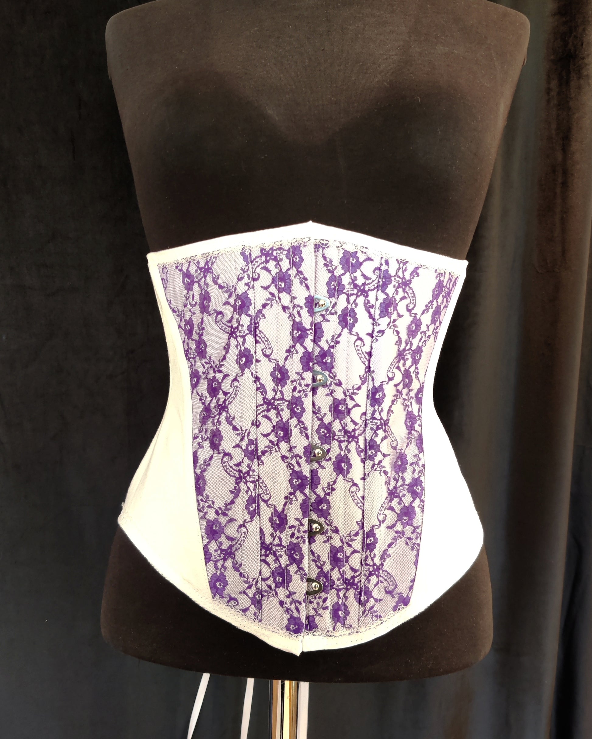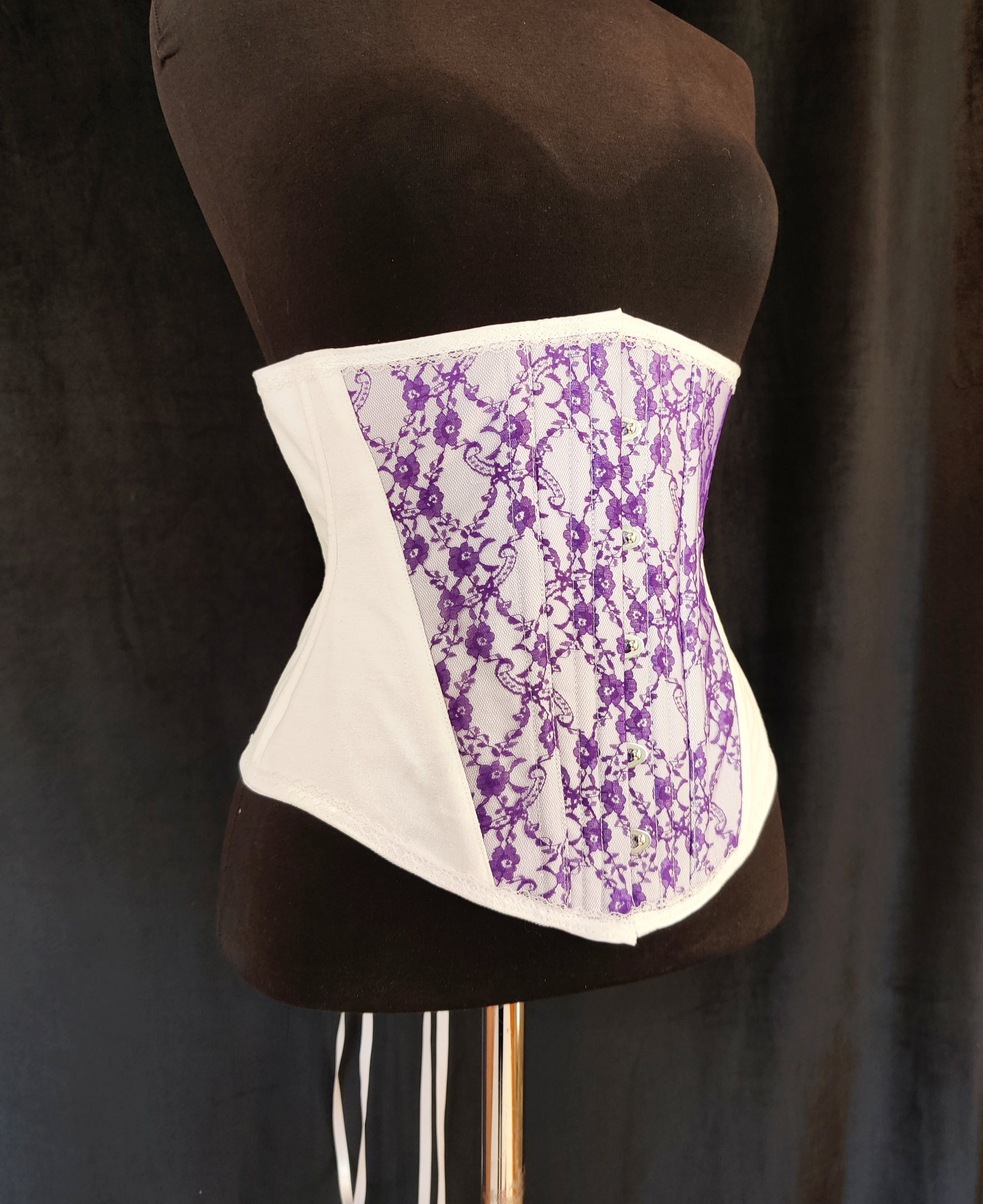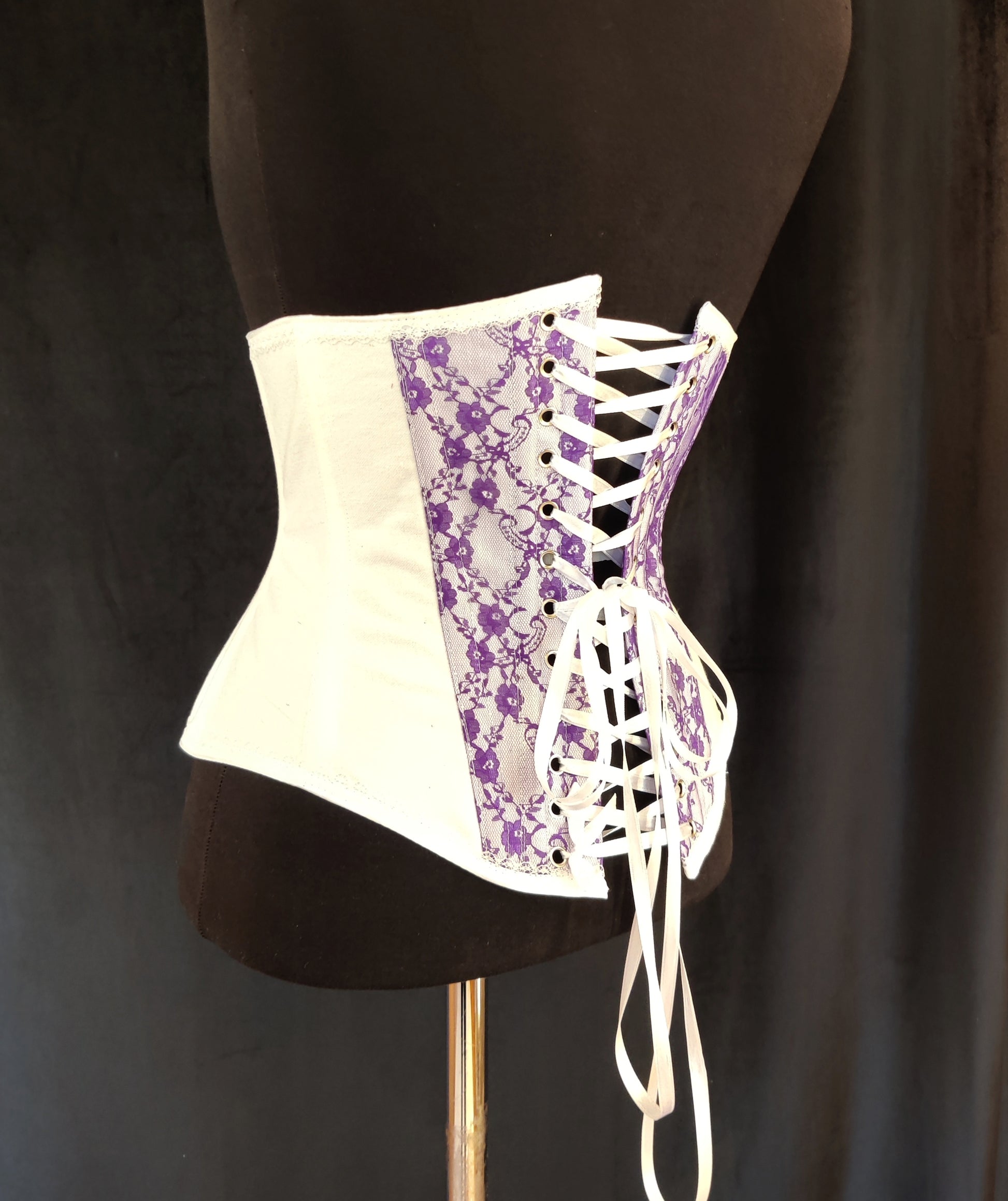 Valkoinen kangas on 100% tukevaa puuvillakangasta, pitsi polyesteria. Puuvilla joustaa aavistuksen joten tämä korsetti ei sovellu kovaan kiristämiseen. Luut ovat synteettistä valaanluuta.