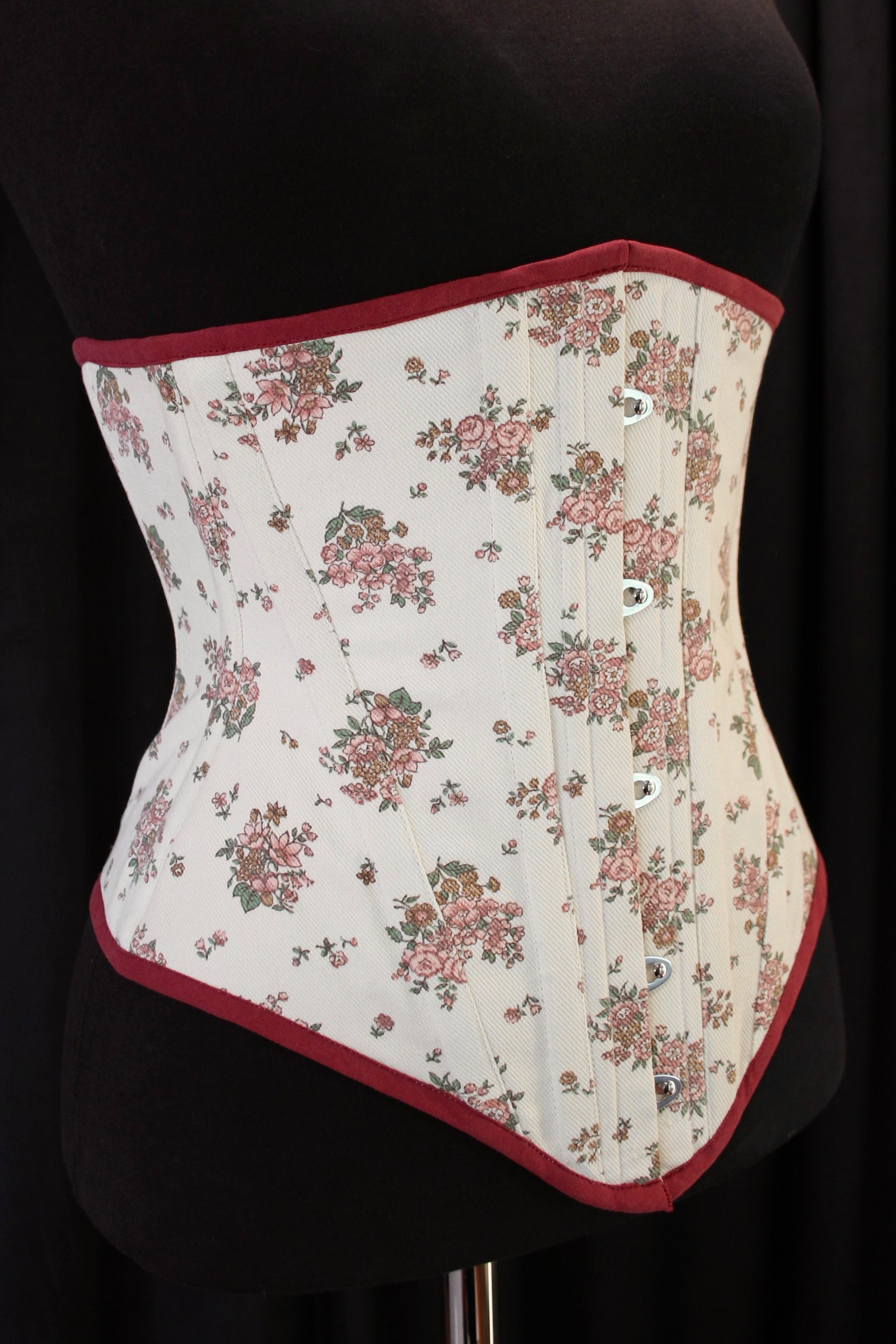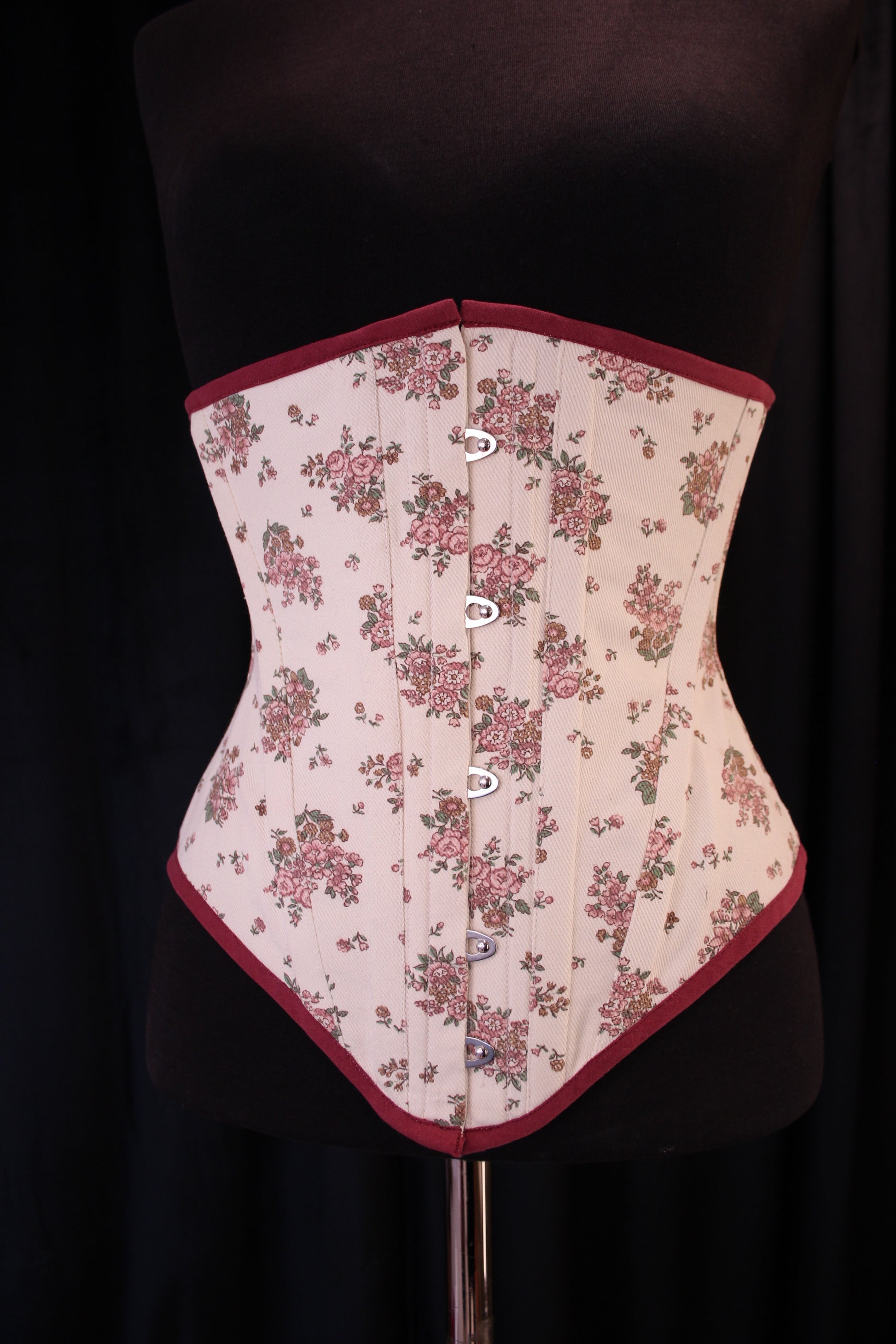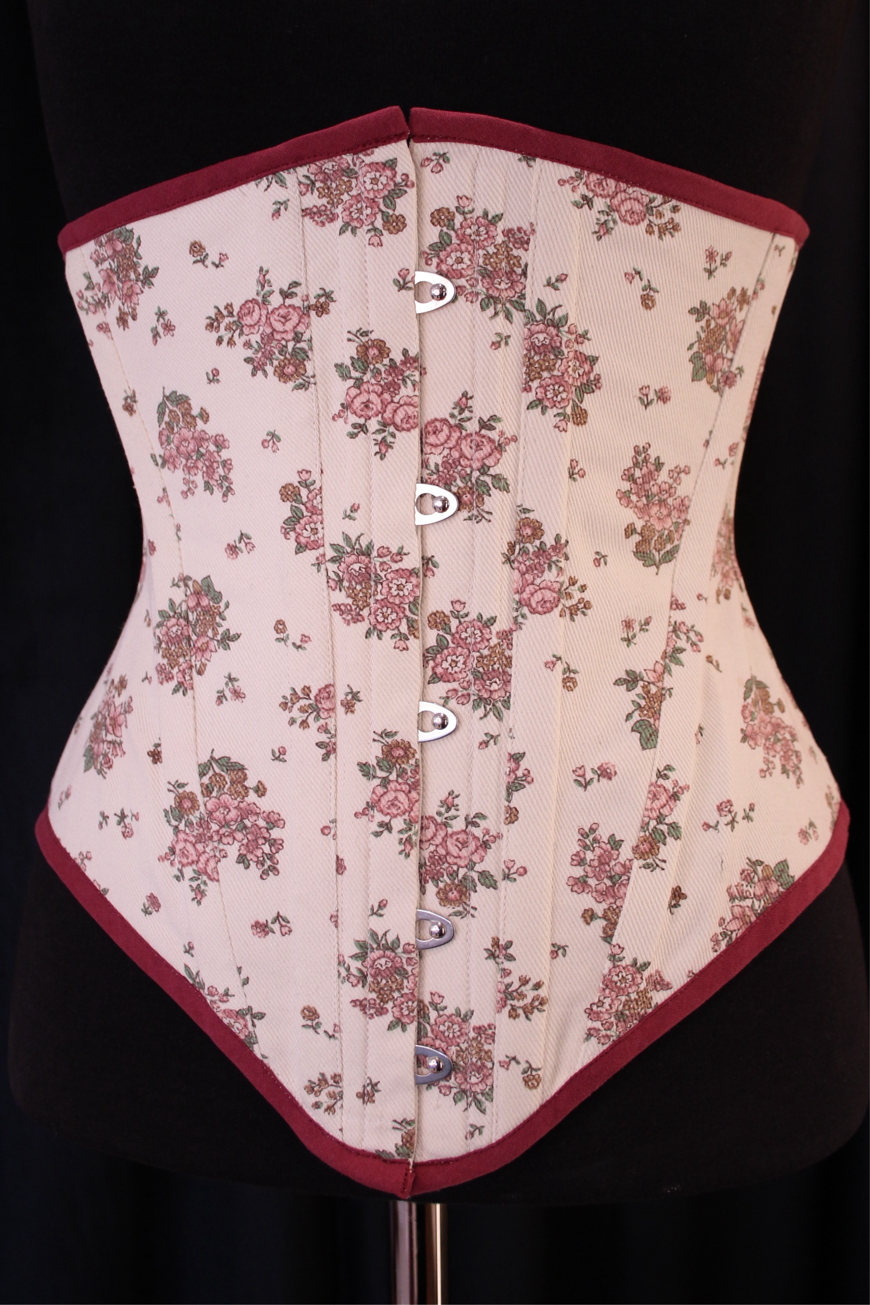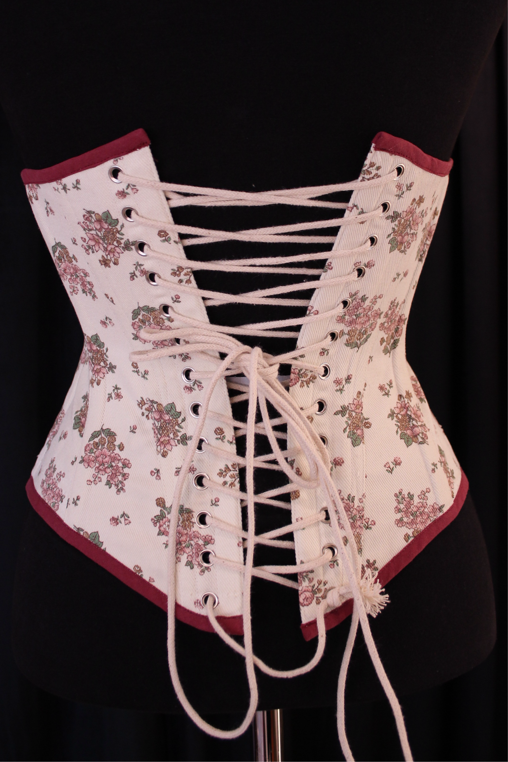 Suloinen kierrätetystä kankaasta valmistettu vyötärökorsetti, päällikangas oli ennen hame! Korsetti on tehty Marianne kaavalla, joka tekee näyttävän tiimalasisiluetin, mutta on kuitenkin mukava. Kankaat 100% puuvillaa, joten korsetti on hengittävä ja todella mukava. Luut ovat synteettistä valaanluuta, joka muokkautuu käytössä käyttäjän muotoiseksi oman kehon lämmön avulla. Edessä oleva plansetti helpottaa korsetin pukemista ja riisumista.
