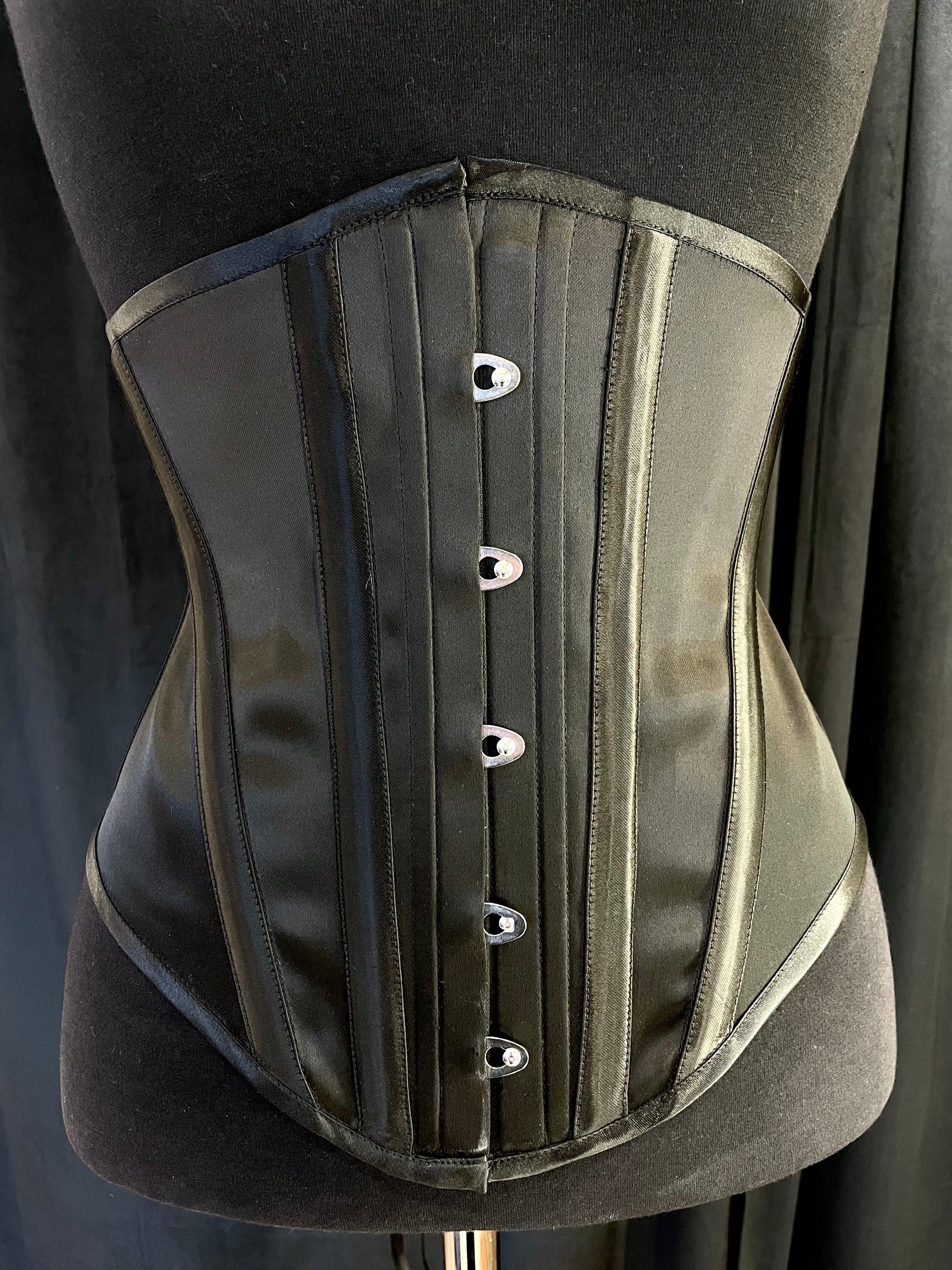 Sleekin maun omaavalle sopiva musta satiinikorsetti käy vaatteiden alle sekä päälle. Se on one layer, eli vain yksikerroksinen puuvillaviskoosicoutil. Korsetti hengittää ja mukautuu vartaloosi. Saat tällä korsetilla tuotua esiin vyötäröä, uhraamatta mukavuutta. Korsetti on luutettu synteettisellä valaanluulla, joka muokkautuu omalle kehollesi käytössä tehden korsetista aina mukavamman mitä enemmän sitä pidät päällä.