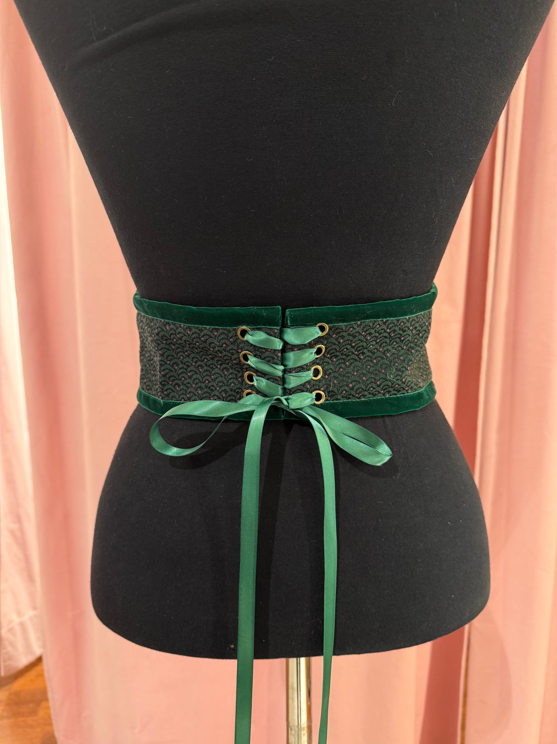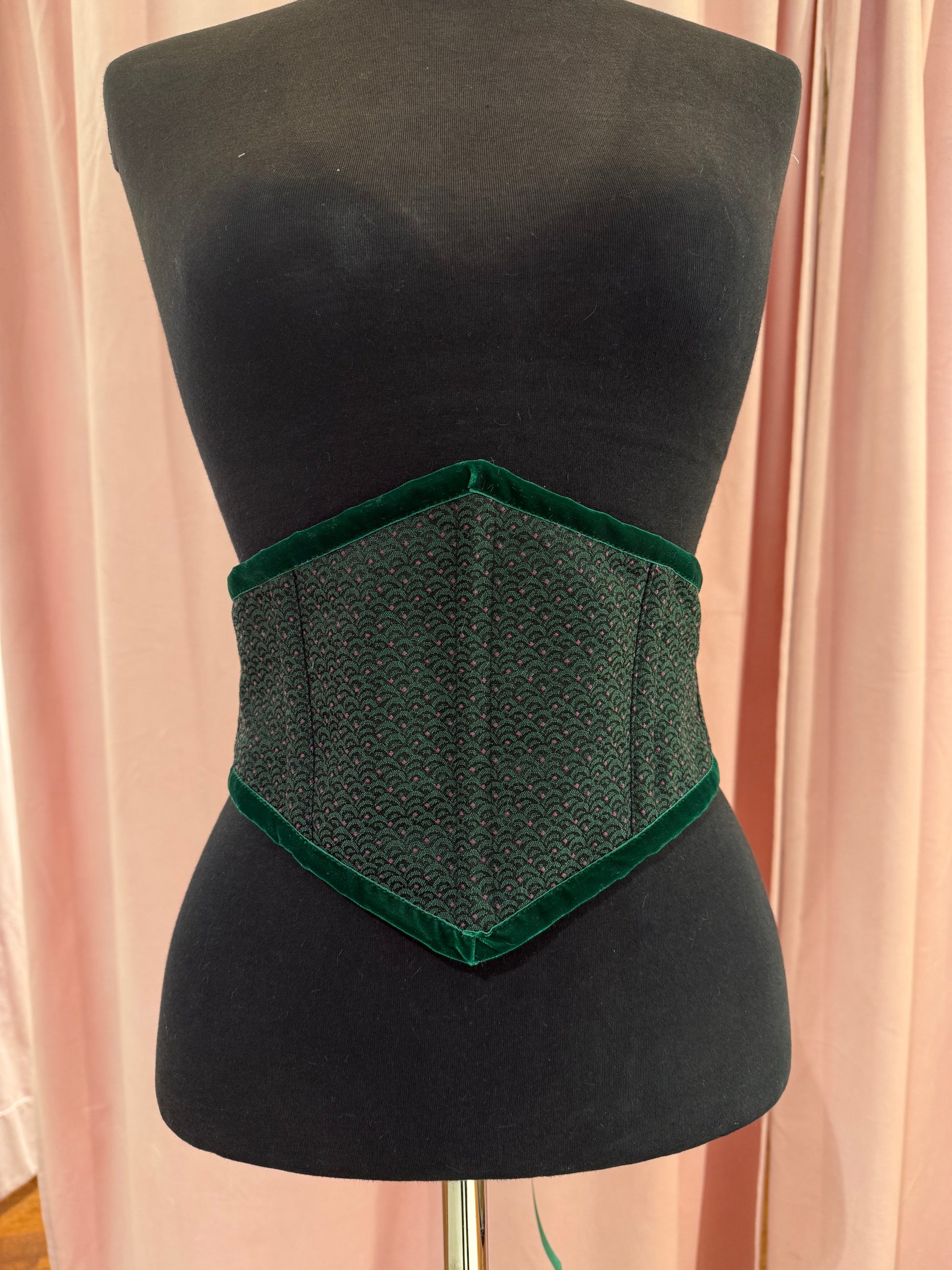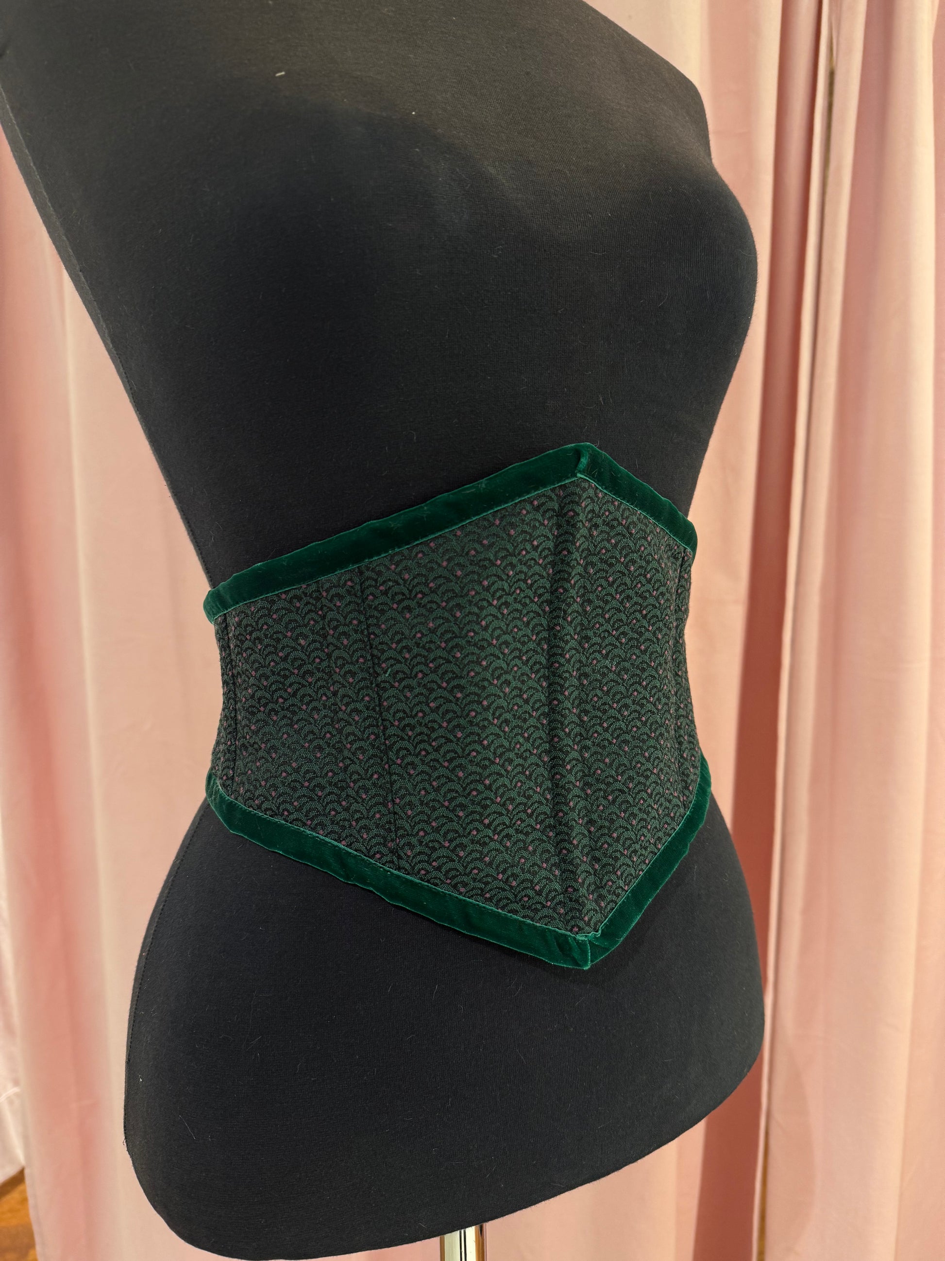 Tummanvihreää brokadityyppistä kangasta, jonka pohjasävy on musta ja lilat pilkut. Vuoritettu. Reunassa tummanvihreä samettinauha.
