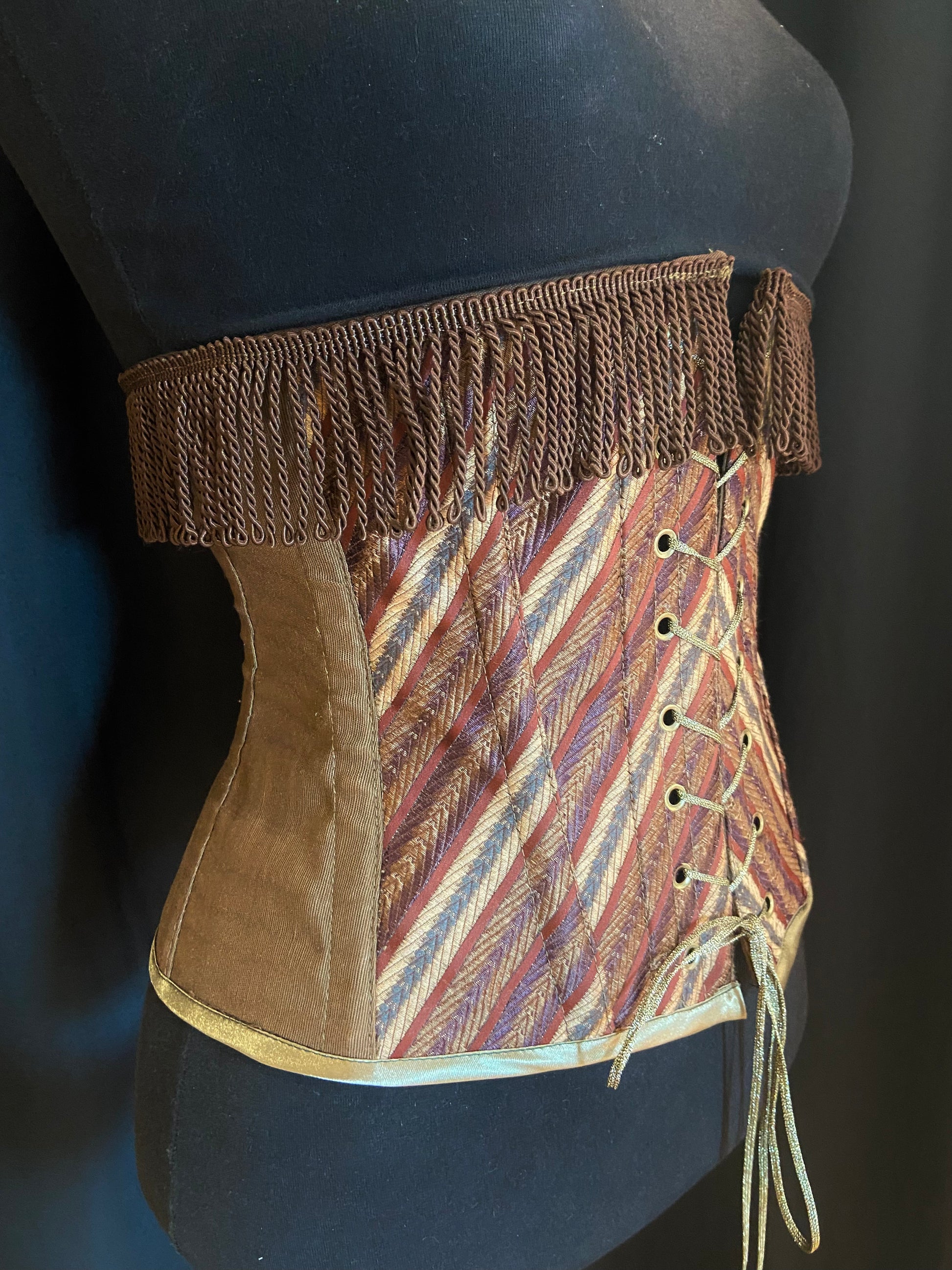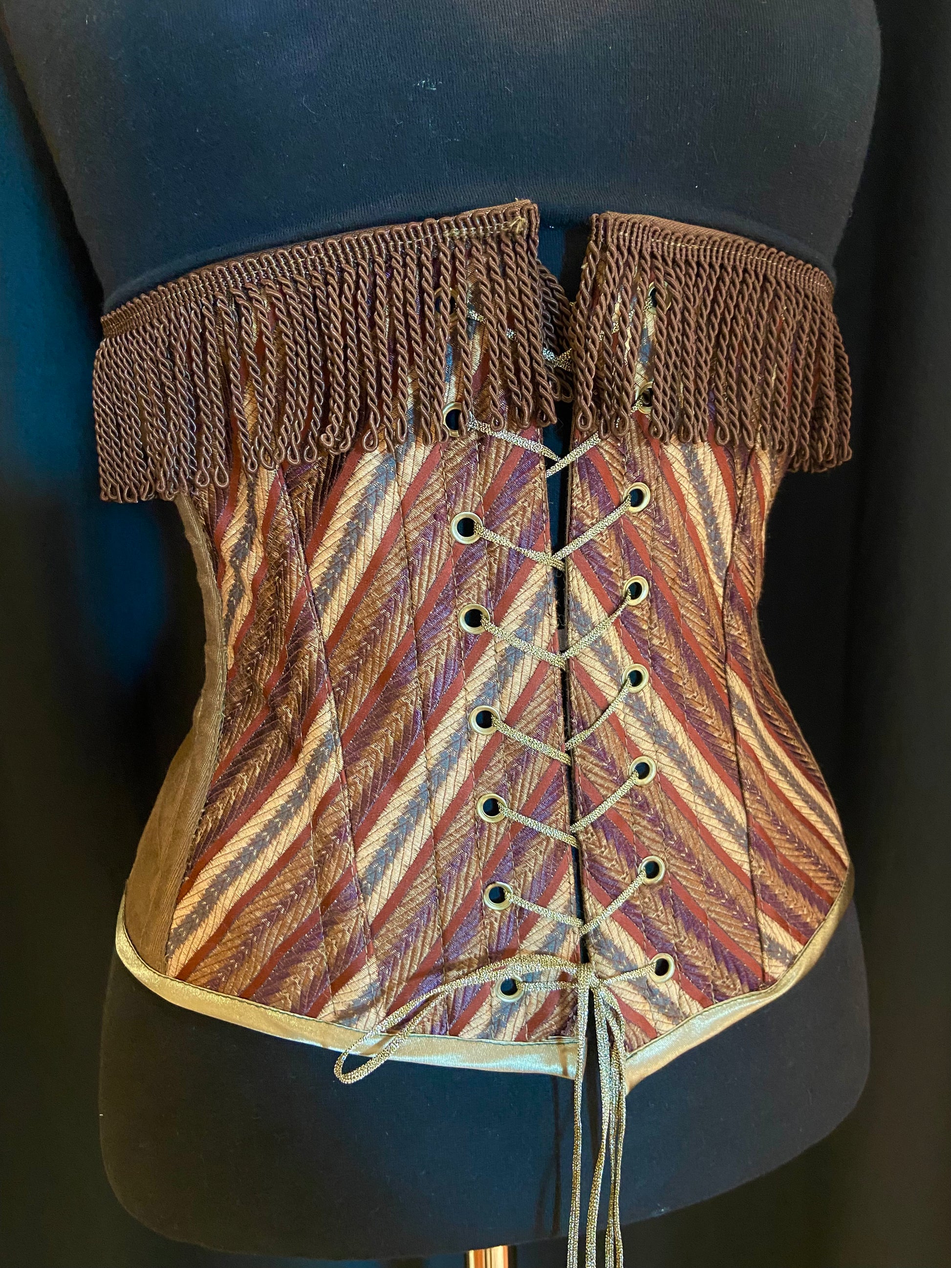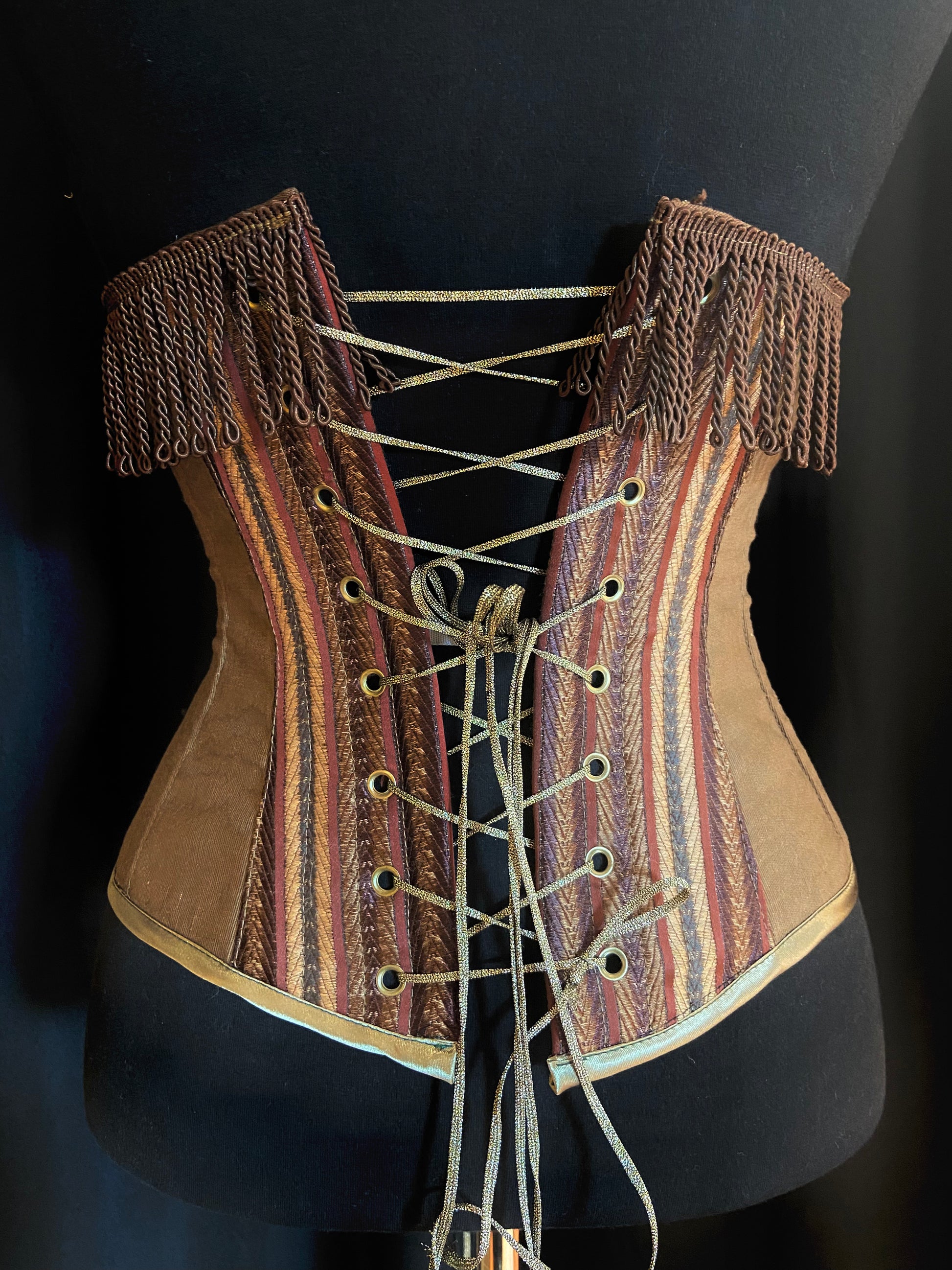 Steampunk- henkeen sopiva vyötärökorsetti hauskoilla hapsuilla. Edessä ja takana raidallista sekoitekangasta, sivuilla ruskea, loimukuvioinen kangas. Vuoritettu puuvillalla.