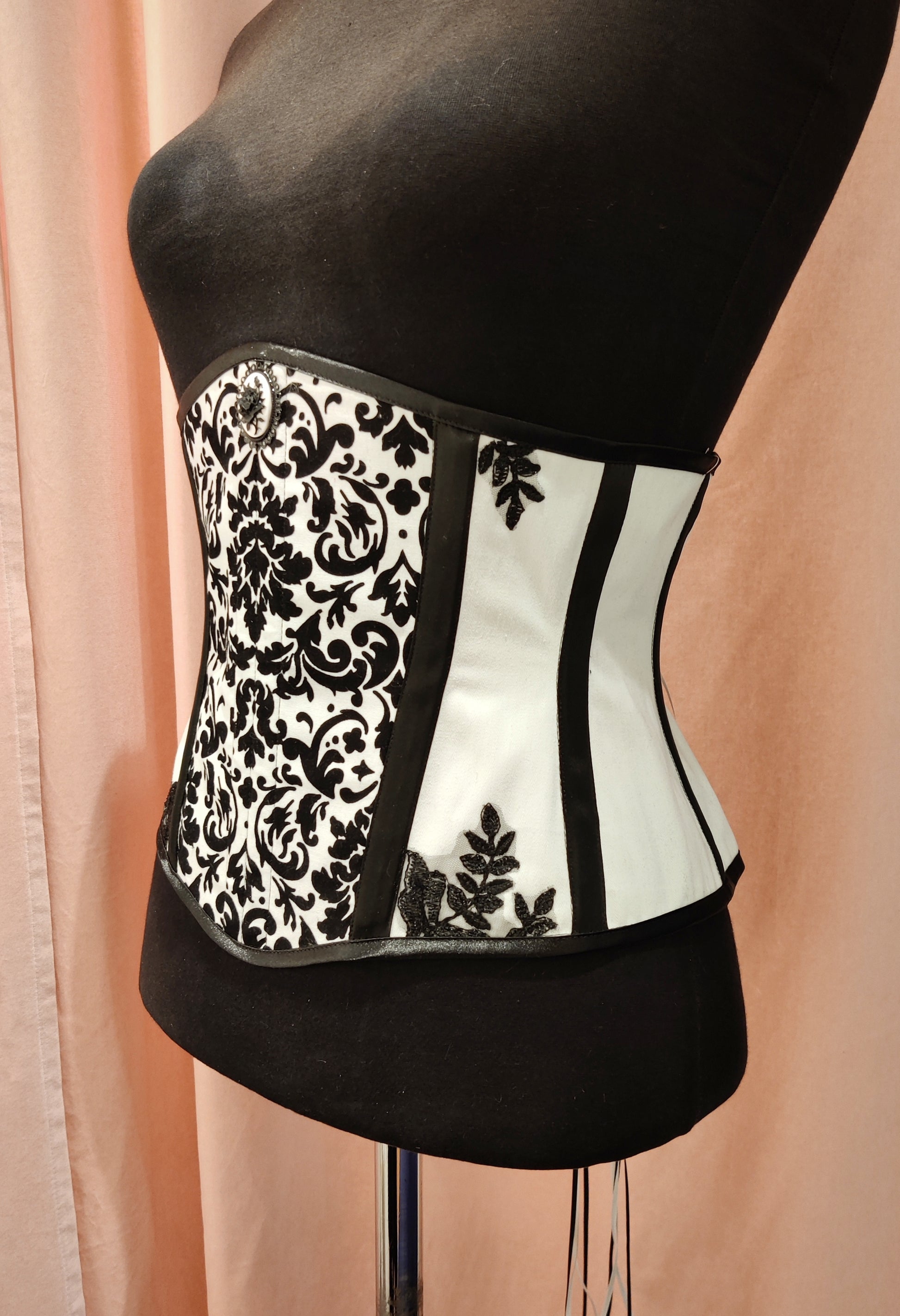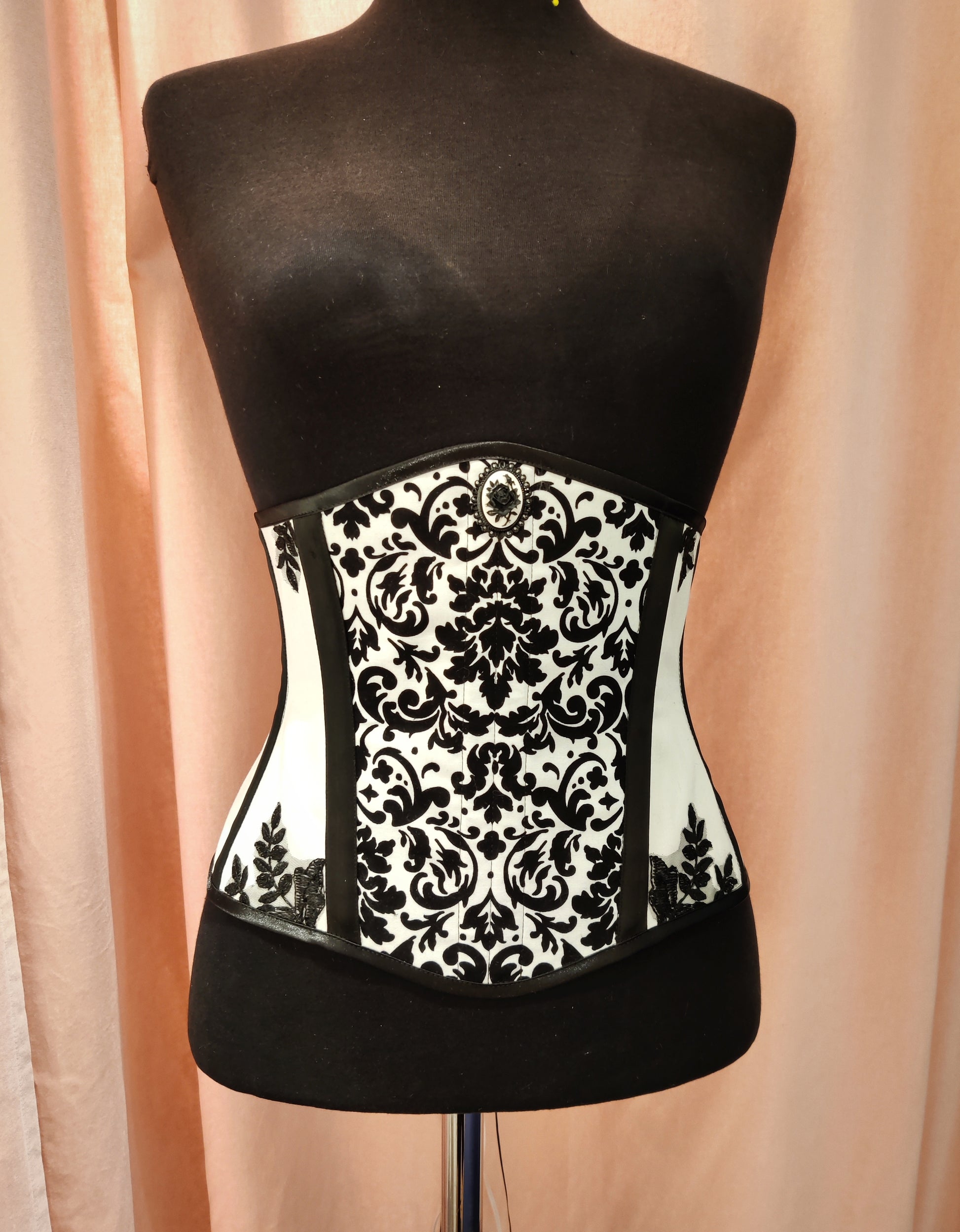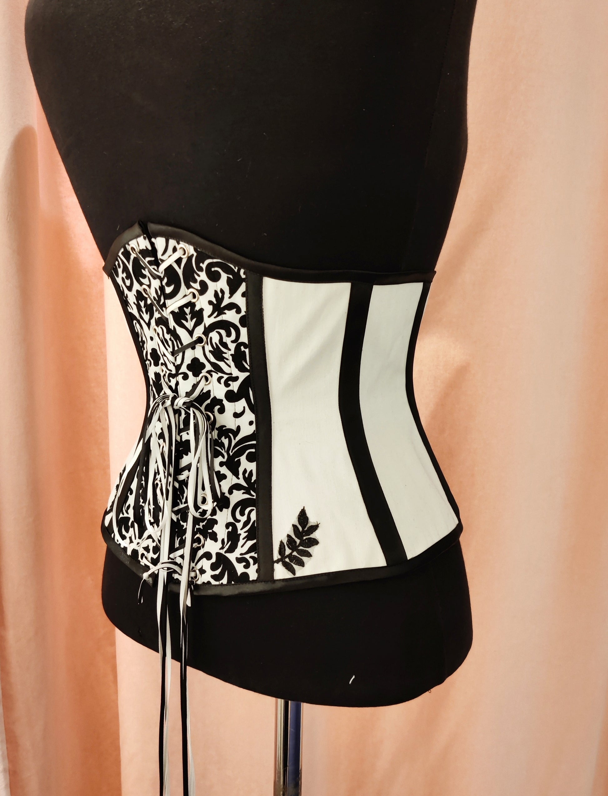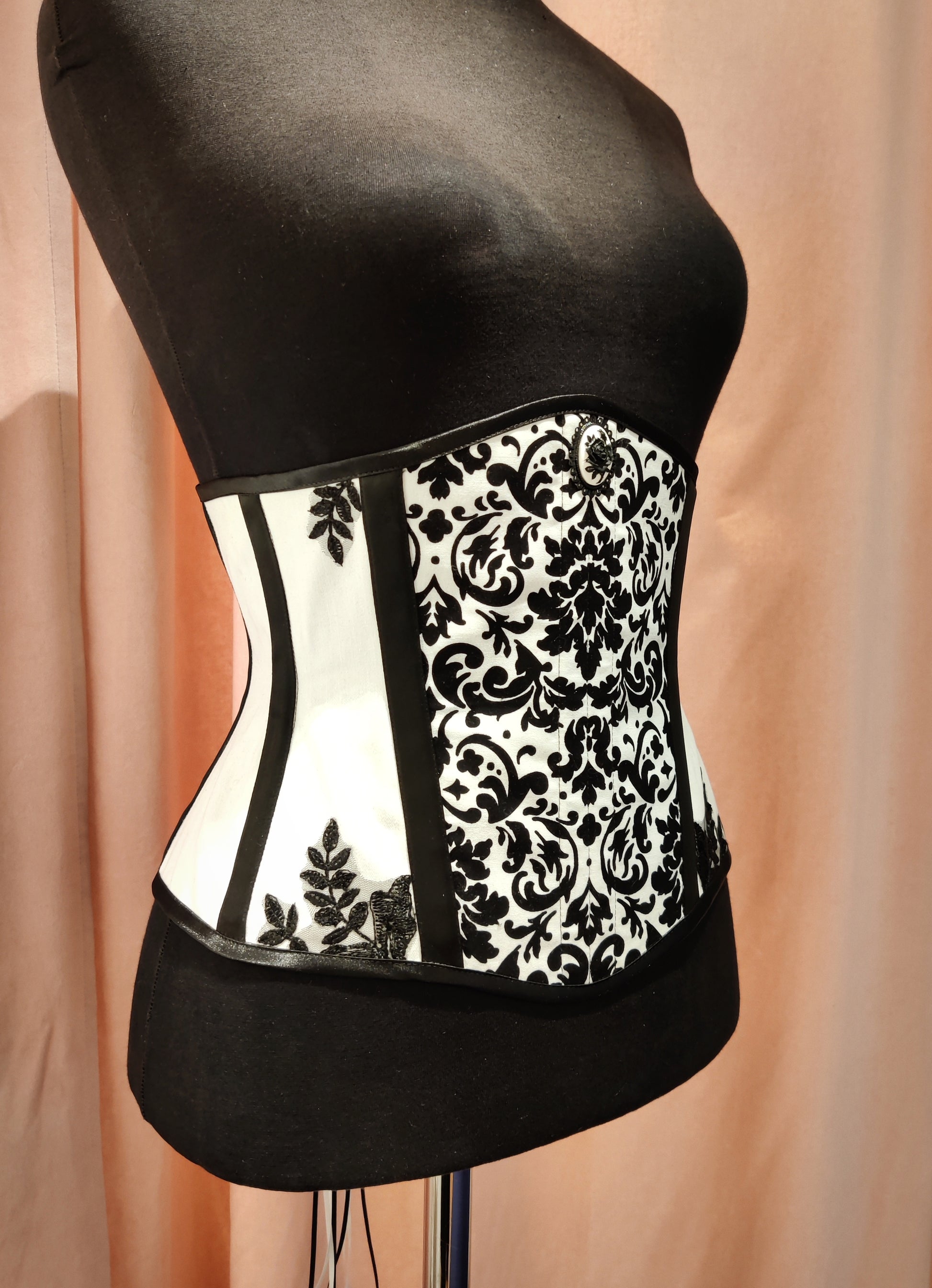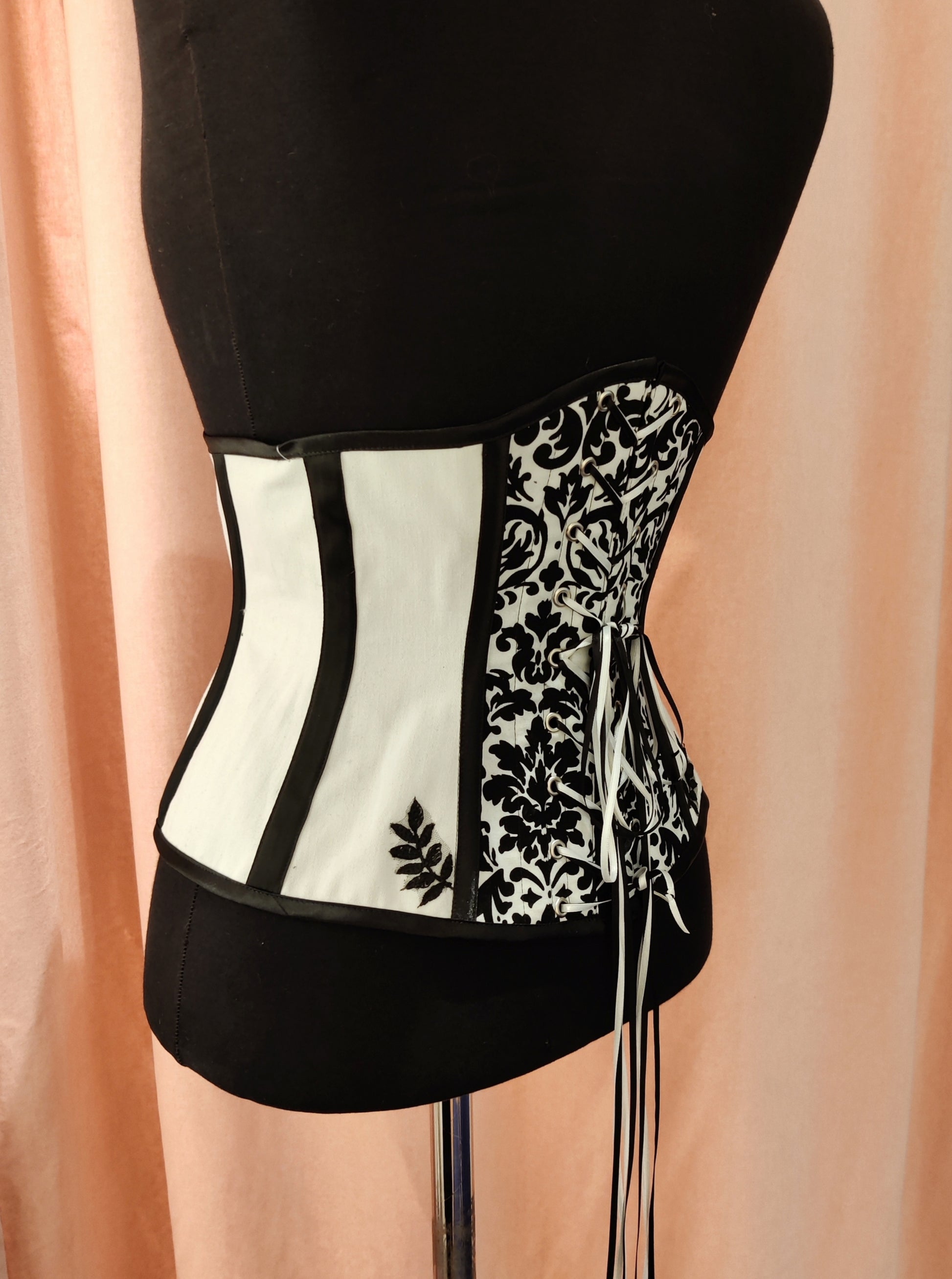 Mono on kaunis kaksivärinen vyötärökorsetti upeilla kuvioinneilla! Tämä korsetti on 100% puuvillaa, joten se on todella mukava ja hengittävä. Edessä ja takana olevat kuvionpaneelit ovat kierrätettyä kangasta, ja tämä korsetti on kuvioita lukuunottamatta one layer, joka keventää korsettia entisestään. Muu kangas korsetissa on puuvillacoutilia.