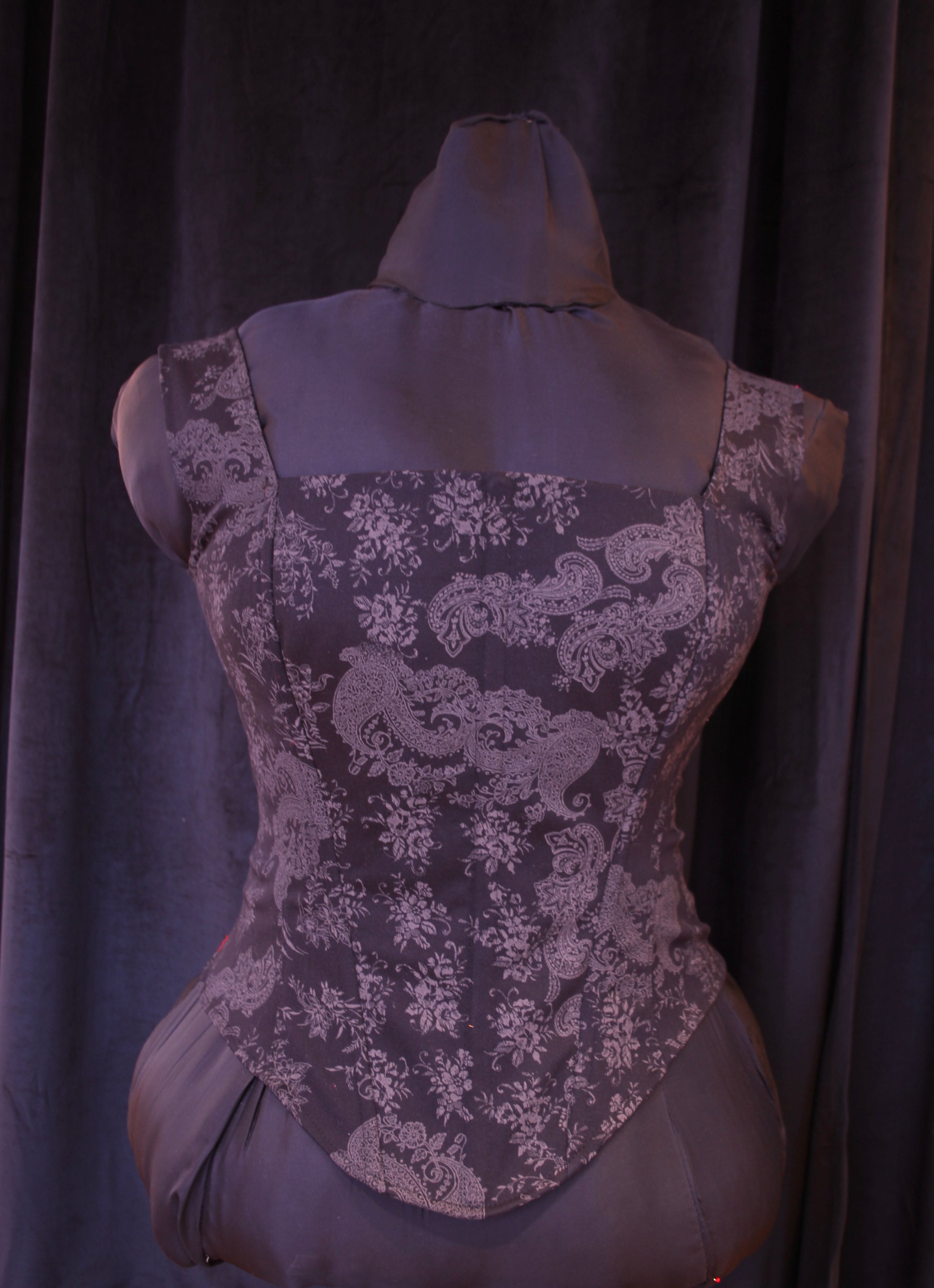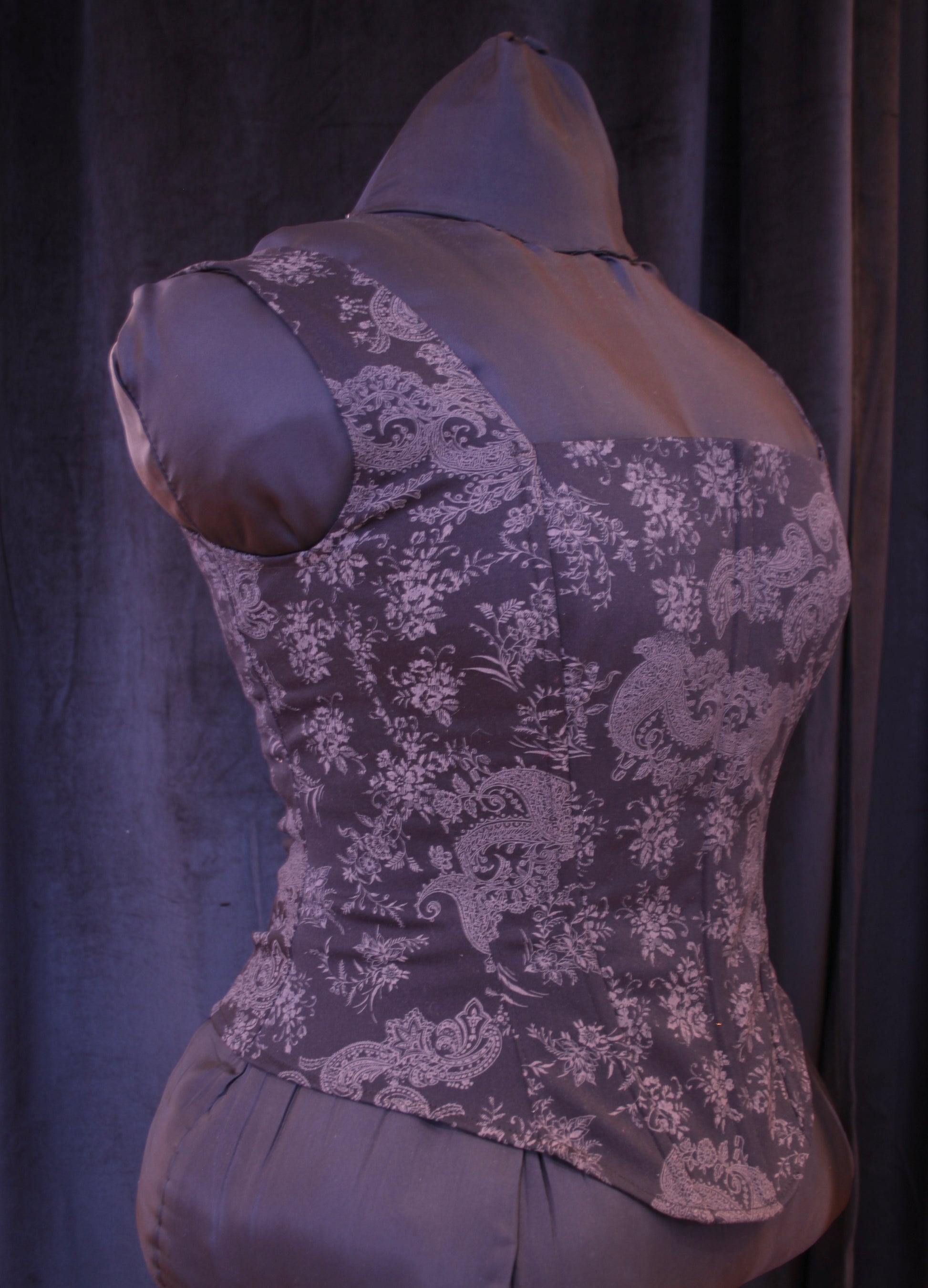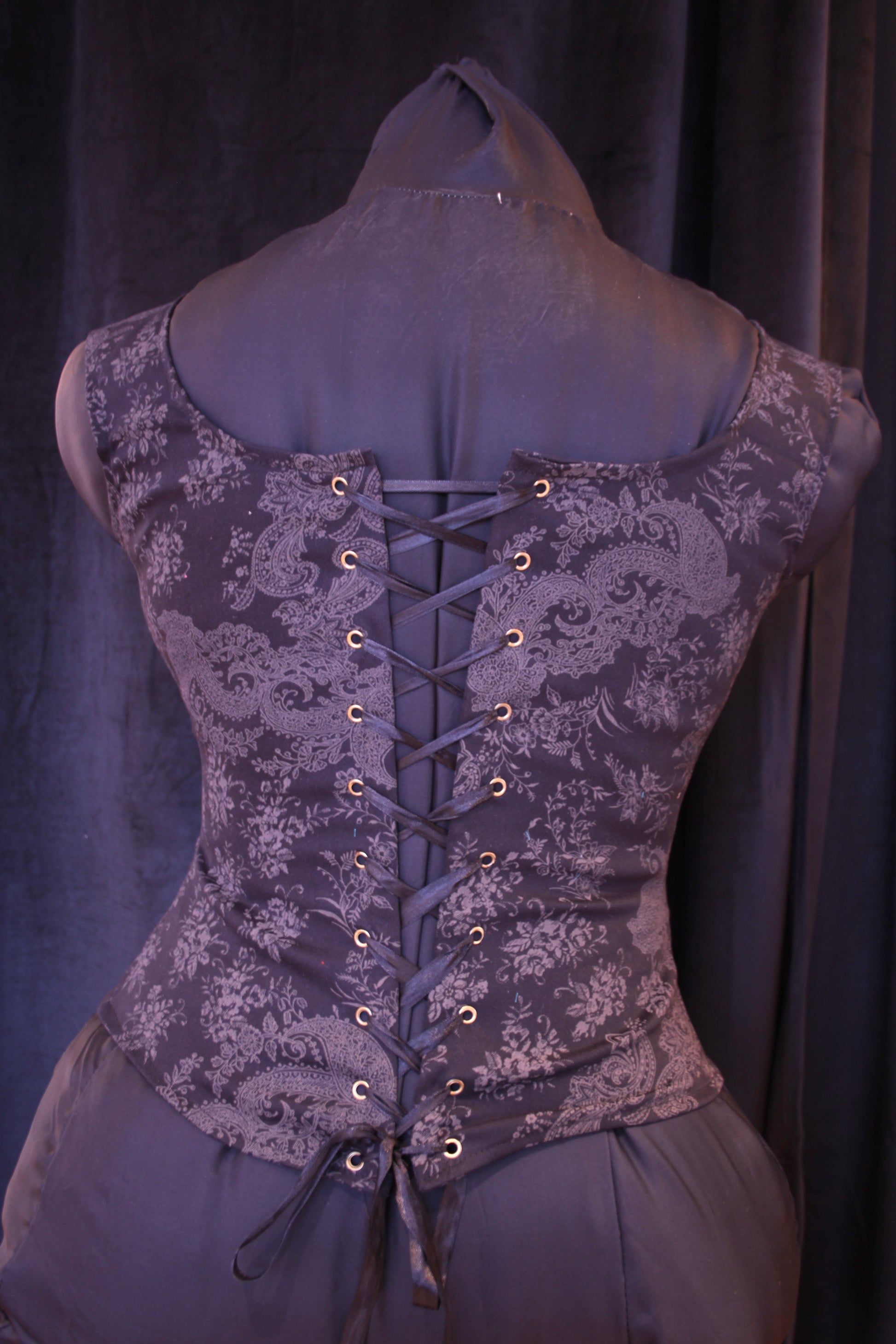 Musta toppikorsetti moneen menoon. Kuvio harmaanruskea painatus. Luutettu edestä ja takaa nyörityksessä, ei kiristämiseen.