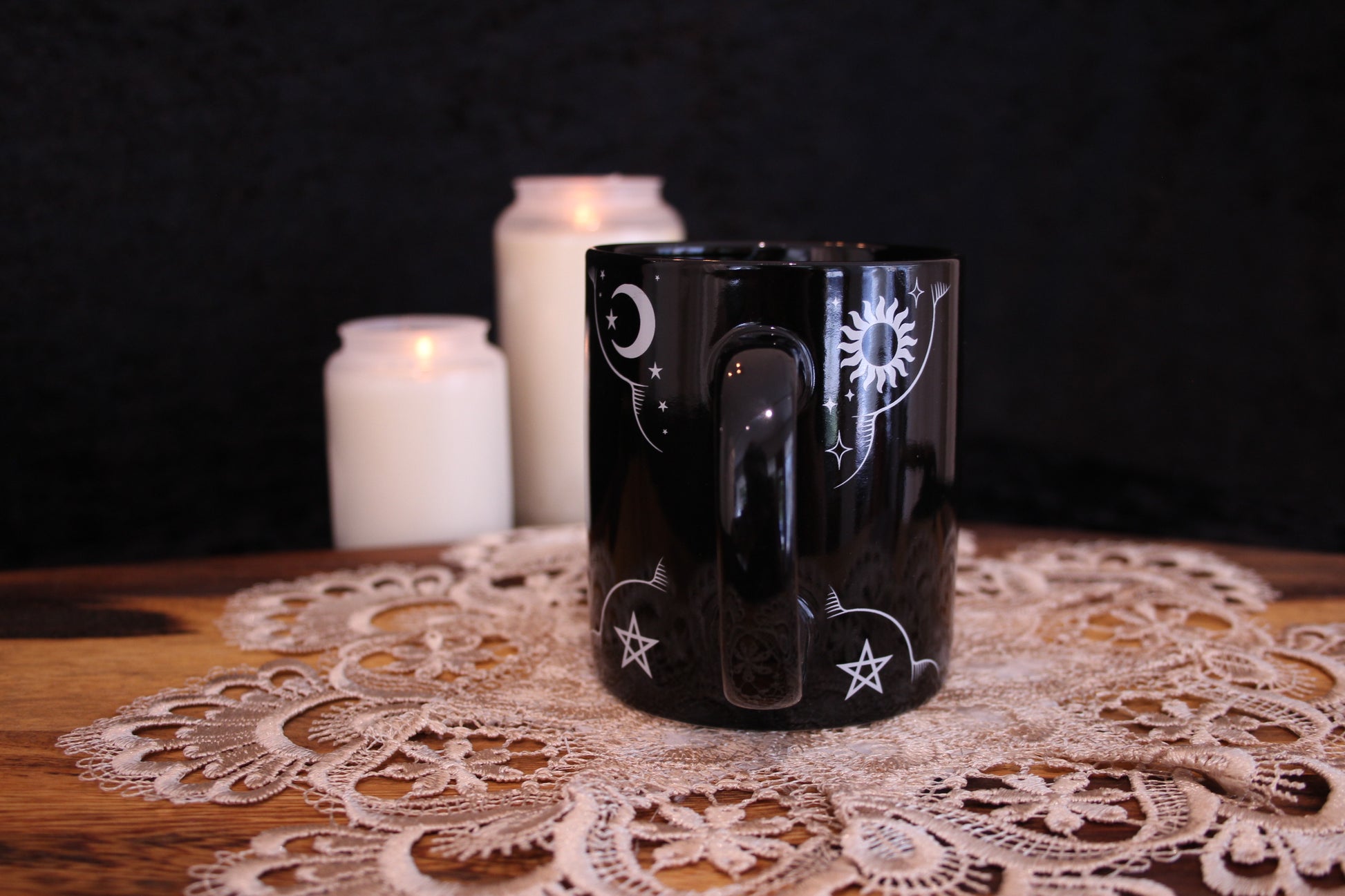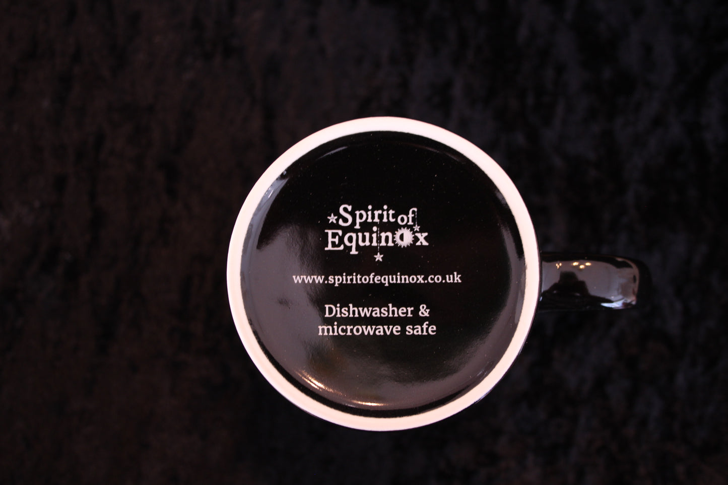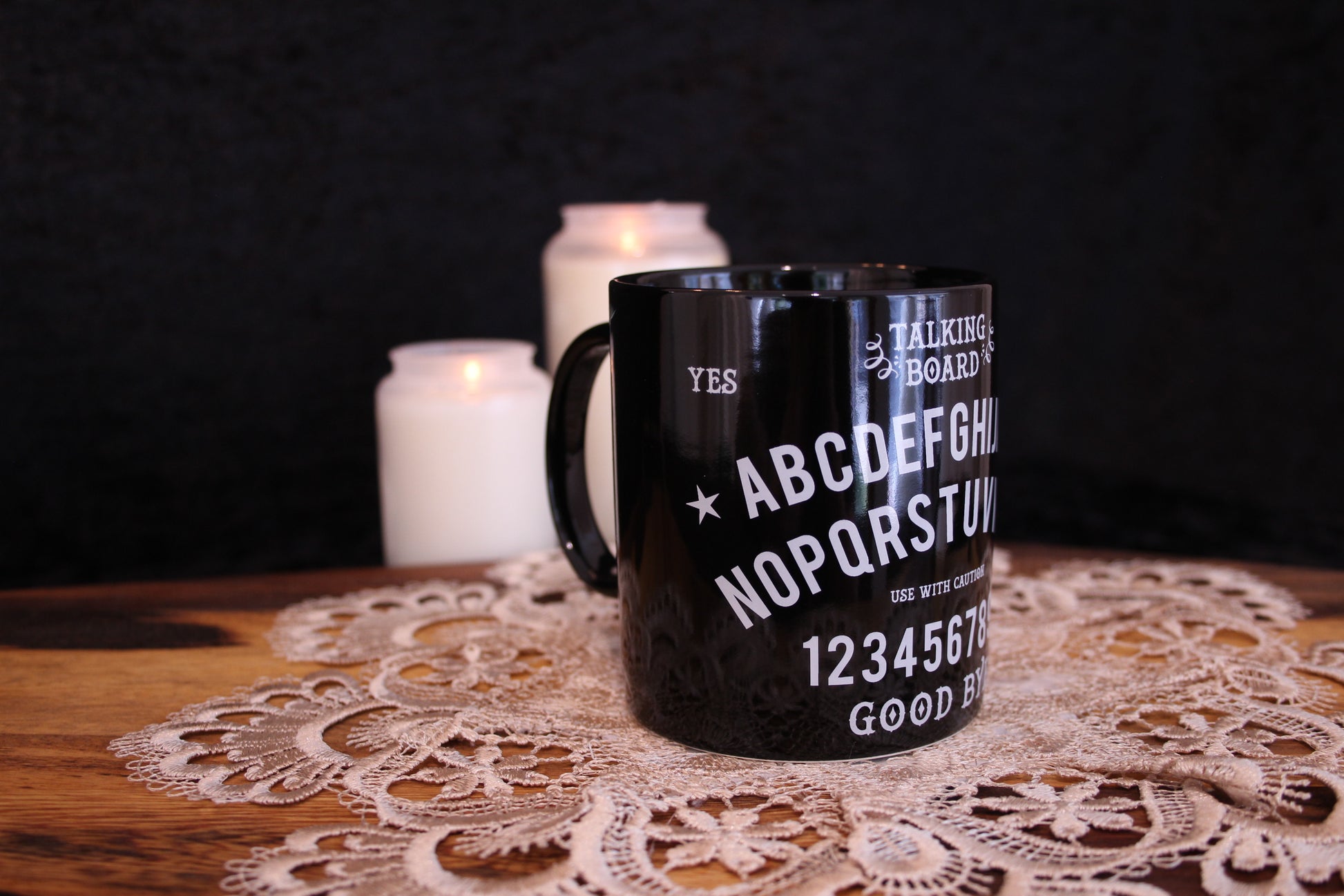 Ouija-lautakuvioinen kahvimuki kuuluu ehdottomasti tummaan keittiöön.