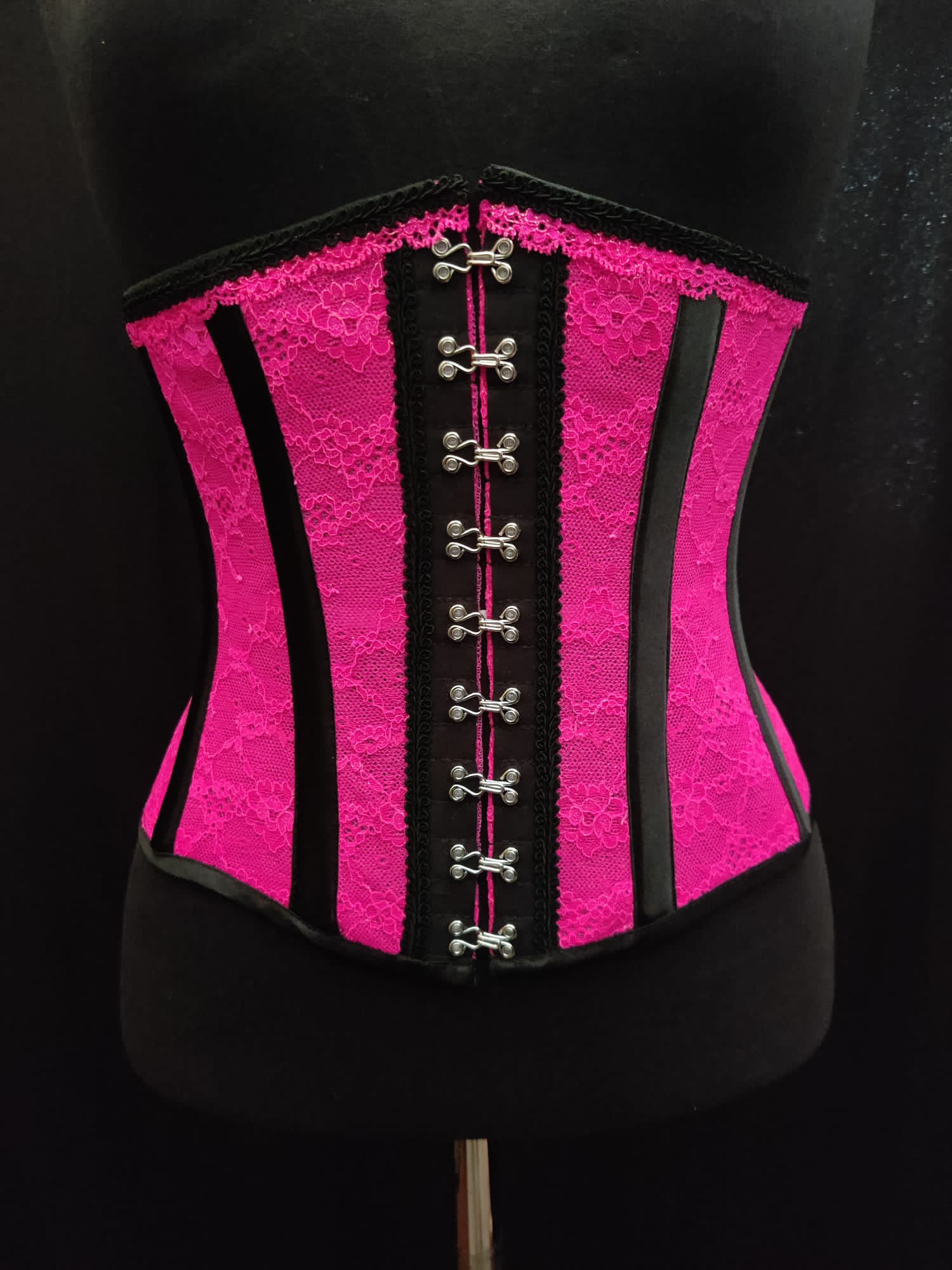 Materiaali pitsi ja alla tylli, läpikuultava. Shokkipinkki väritys.