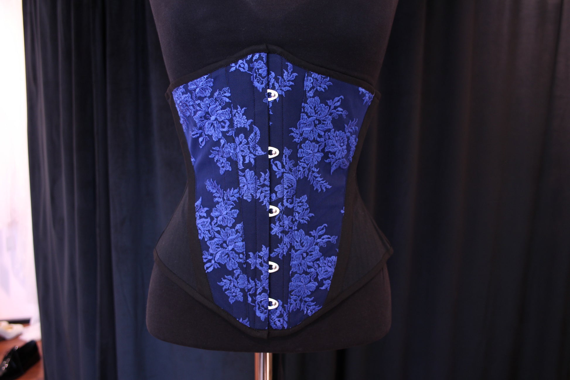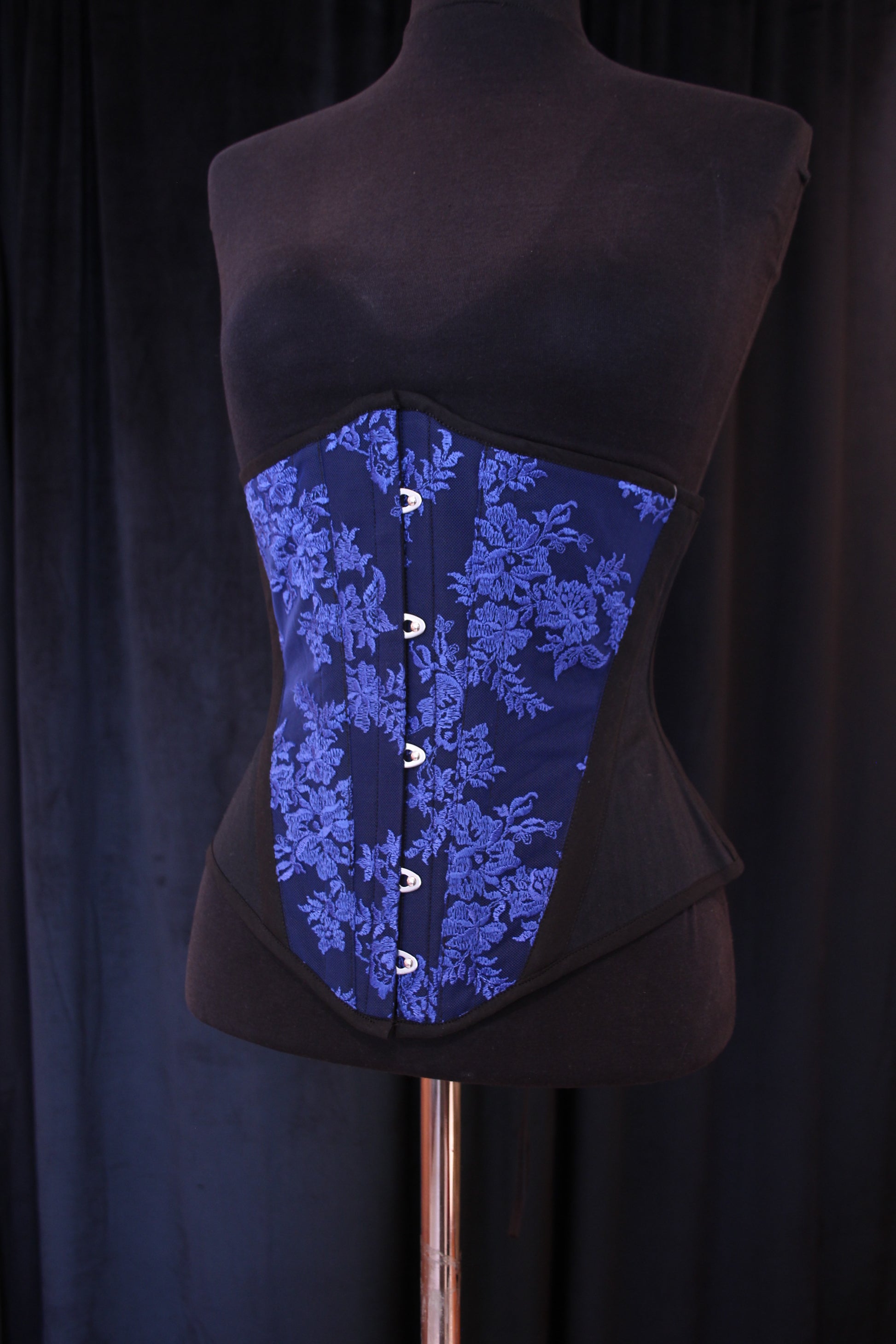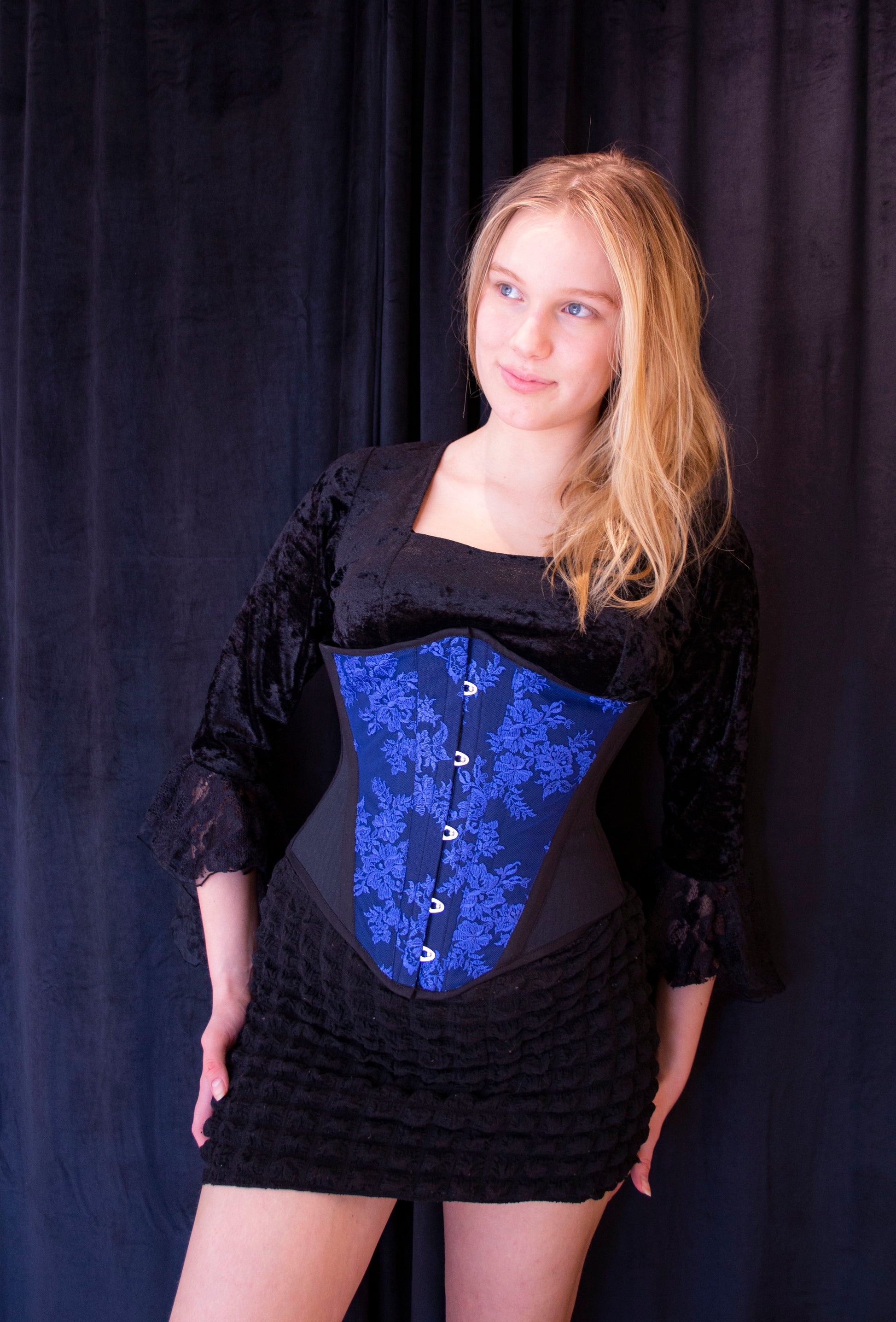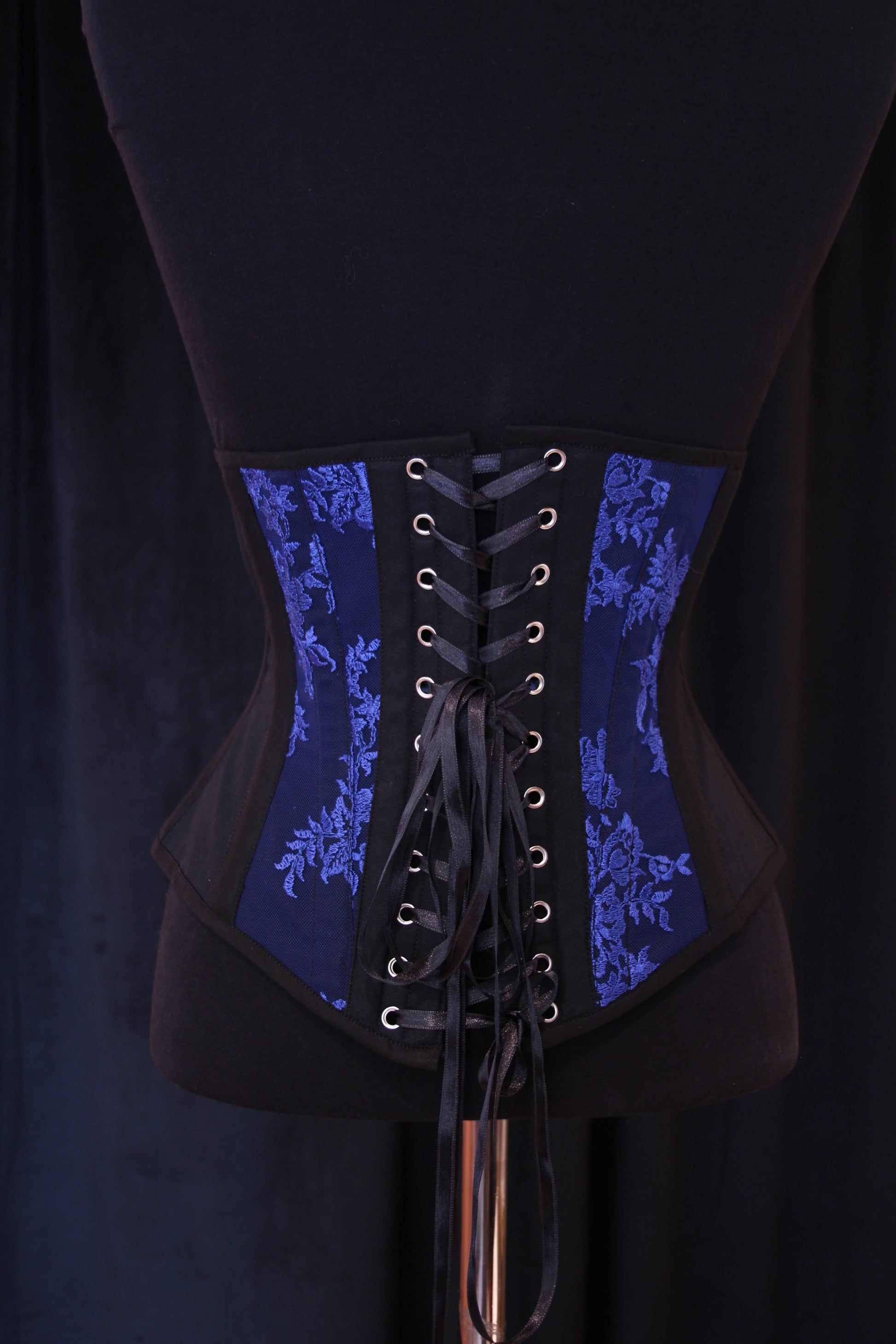 Plansetillinen kaunis mustasininen vyötärökorsetti. Tämä korsetti on todella tukeva ja kaunis, saat sillä upean tiimalasi vartalon! Musta kangas on 100% puuvillaista coutil-kangasta, ja pitsi on polyesteria. Korsetti on hengittävä ja mukava, sillä se on luutettu synteettisellä valaanluulla.