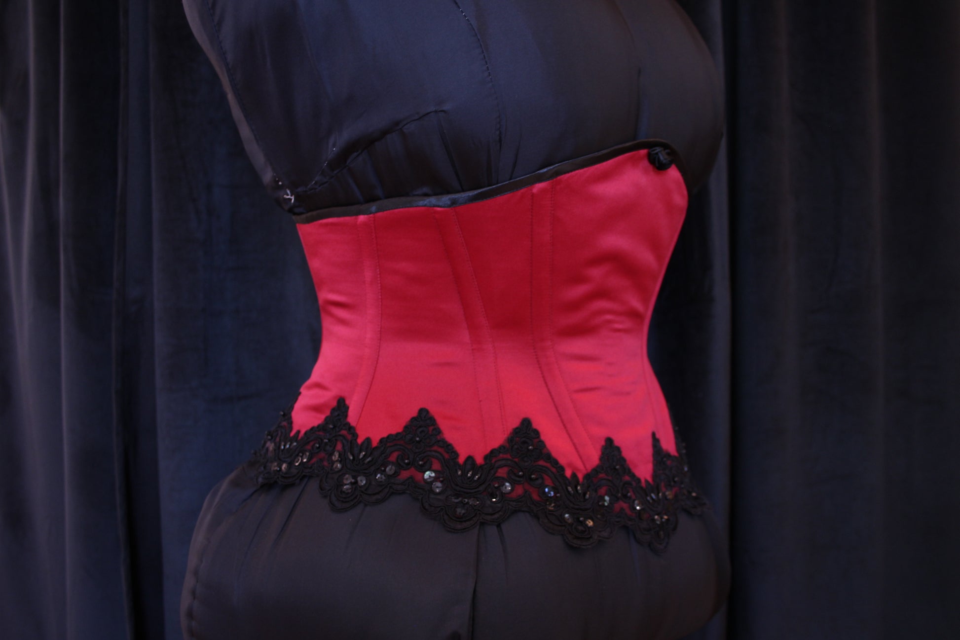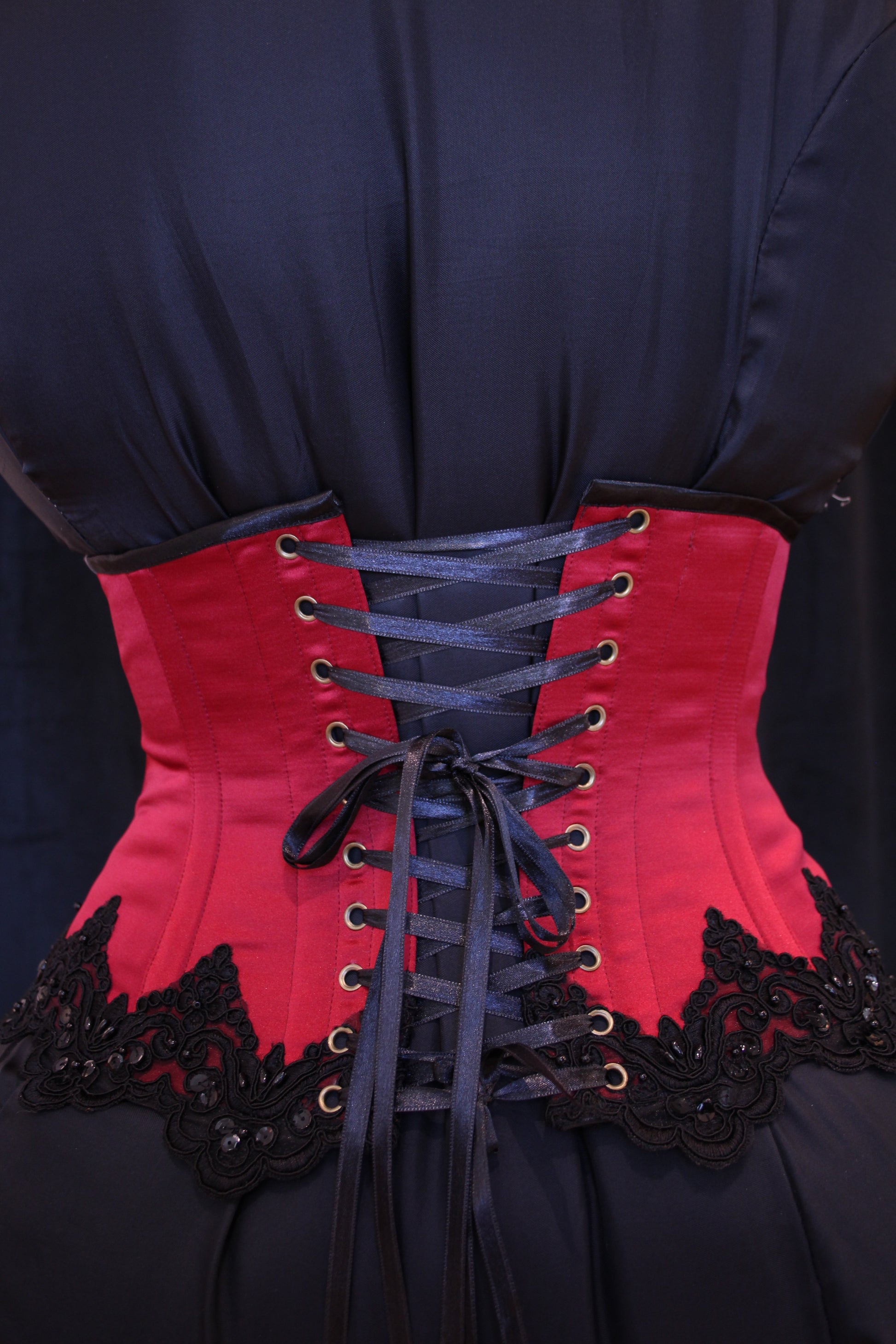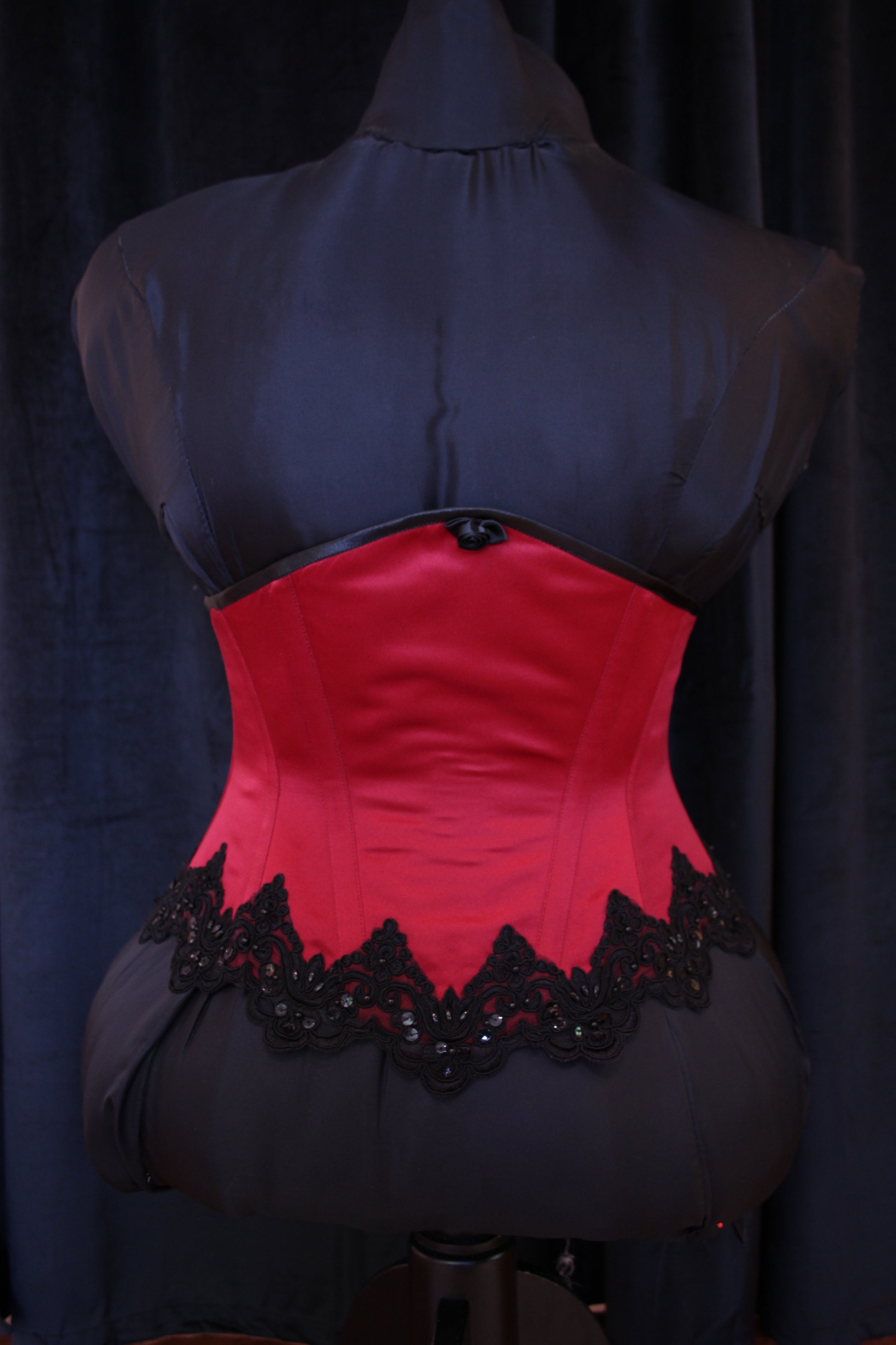 Bloody Mary-kaavalla tehty upea punainen korsetti. Yleellinen ja näyttävä punainen kangas sopii niin arkeen kuin juhlaan. Kaava tekee näyttävän tiimalasi-siluetin, mutta on kuitenkin mukava päällä. Pitsi yksityiskohdat ja musta pieni ruusu ovat näyttävä lisä ja tuovat juhlallisuutta.