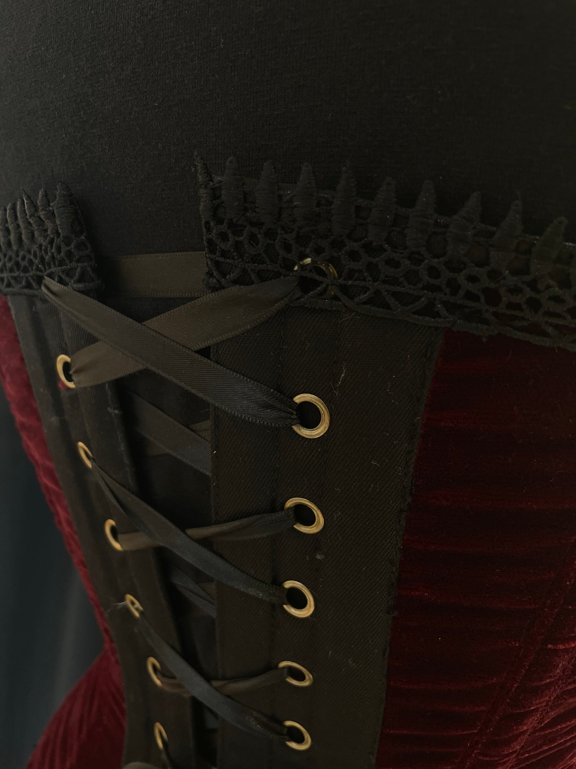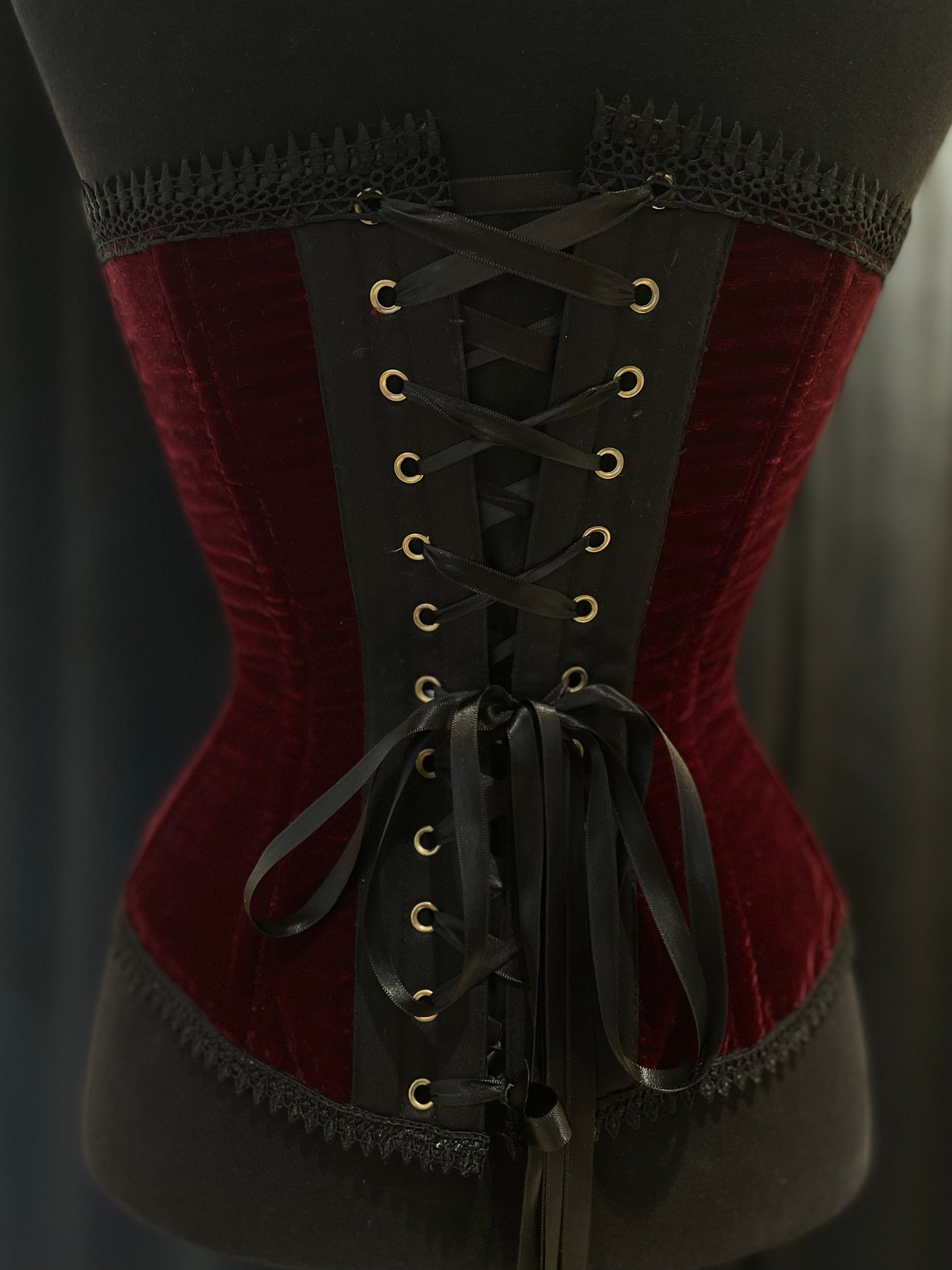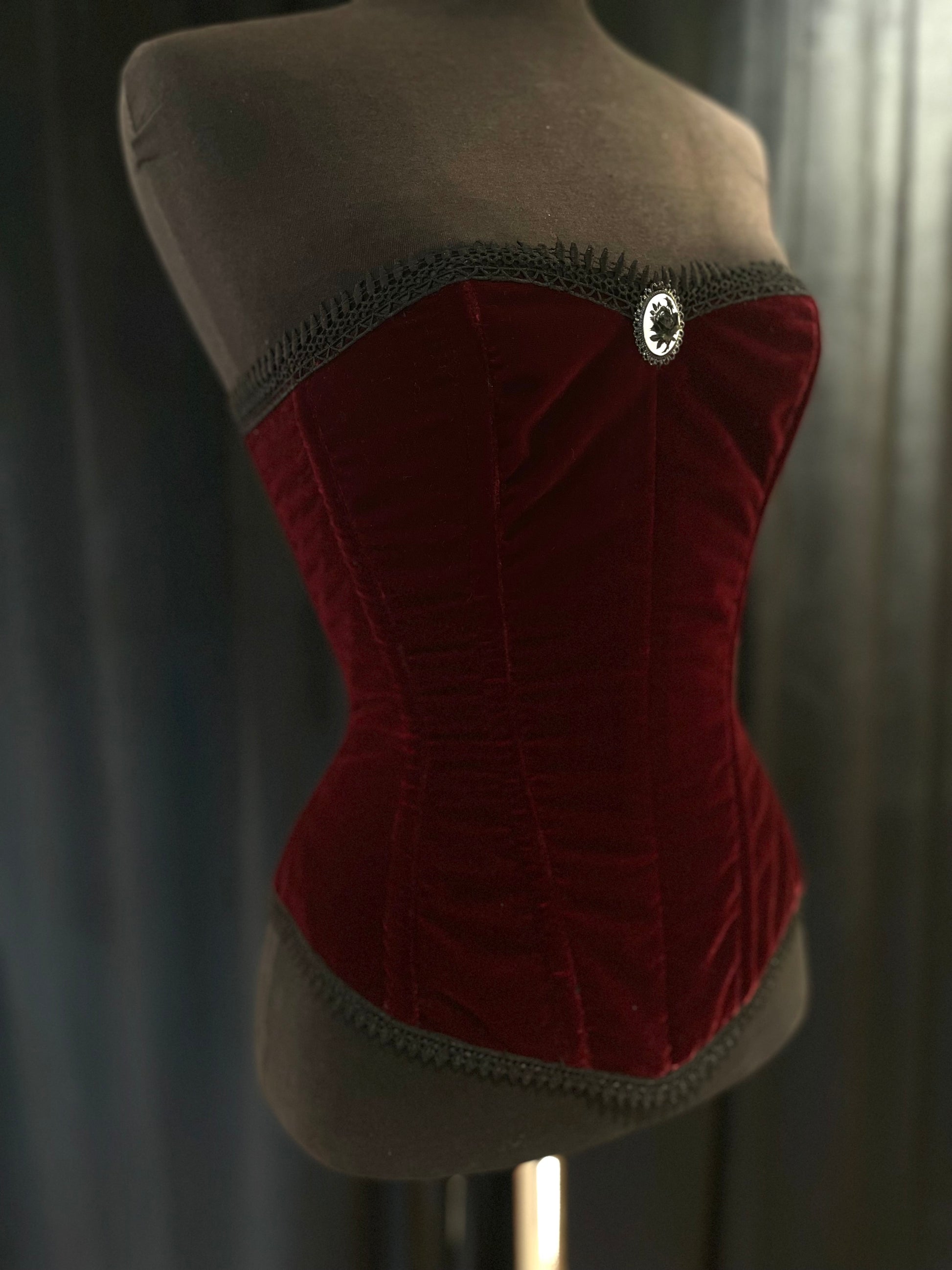Todella ylellinen ja lumoava viinin värisestä sametista tehty Bernadette! Tämä korsetti näyttää ja tuntuu hyvältä! Valo uppoaa sametin nukkaan tehden väristä todella täyteläisen ja kauniin Reunojen pitsiset yksityiskohdat sekä koru tuovat Korsettien luksusta ja kauneutta. Tämän kanssa menet arvokkaana vaikka tanssiaisiin, mihin vain juhliin, ruokakauppaan, tai saat vampyyrin tavoin ympärillä olevat ihmiset pauloihisi.