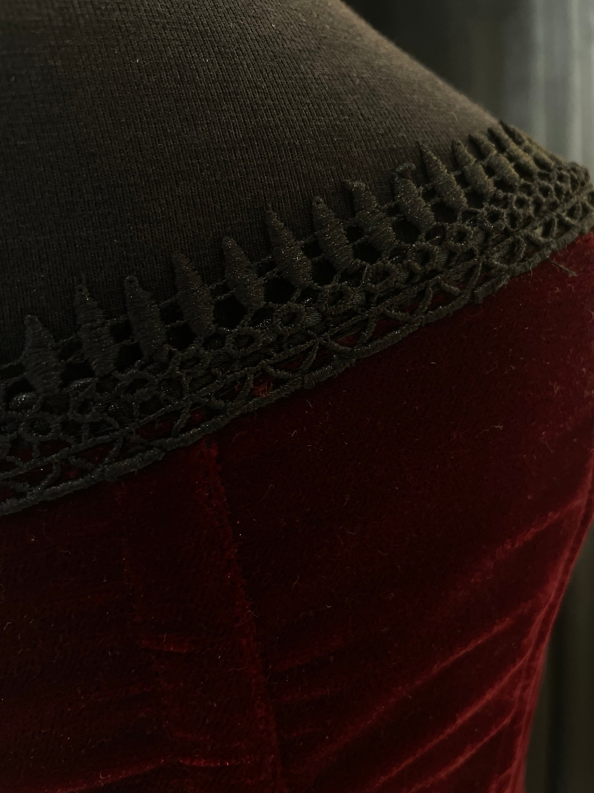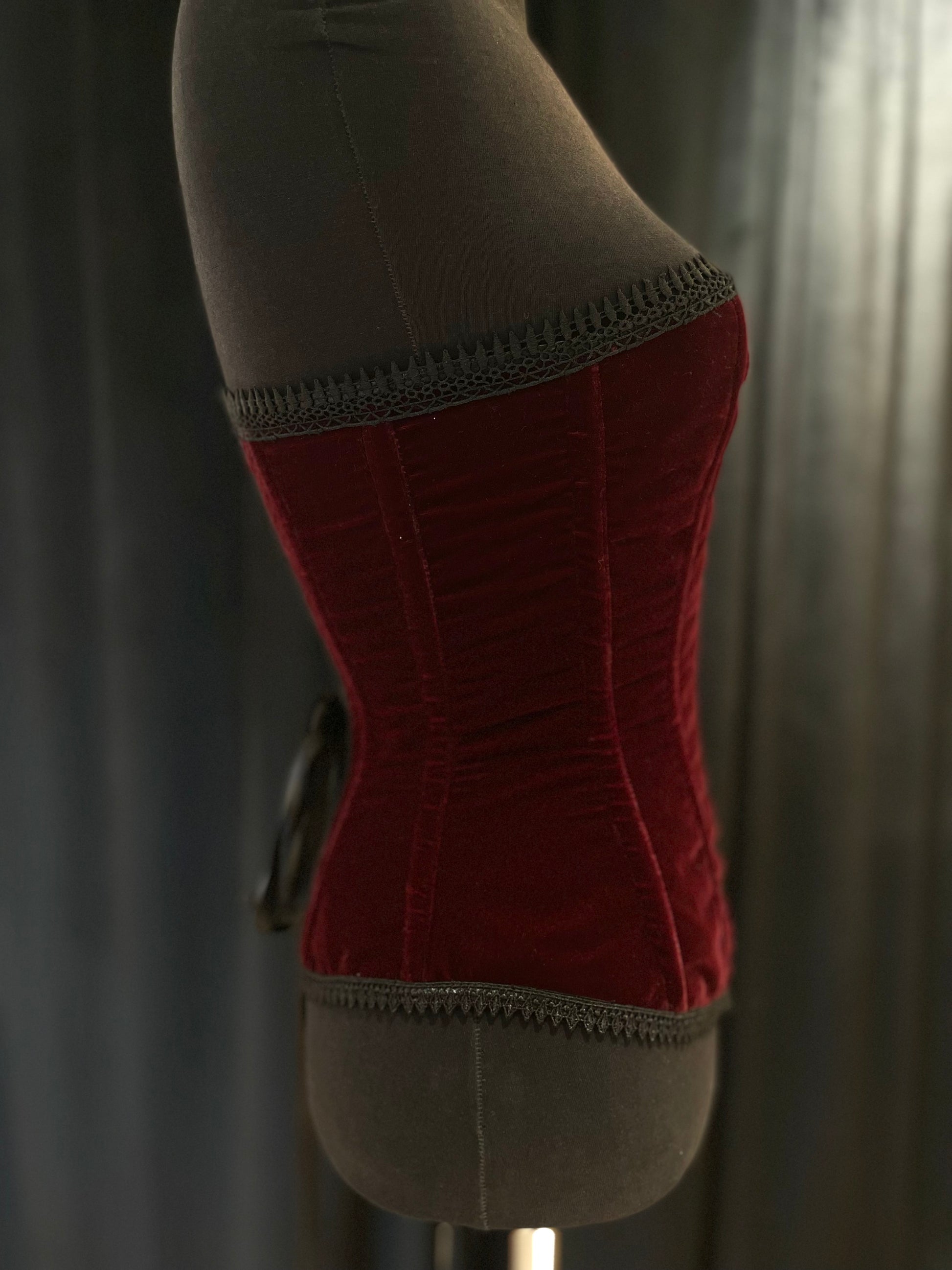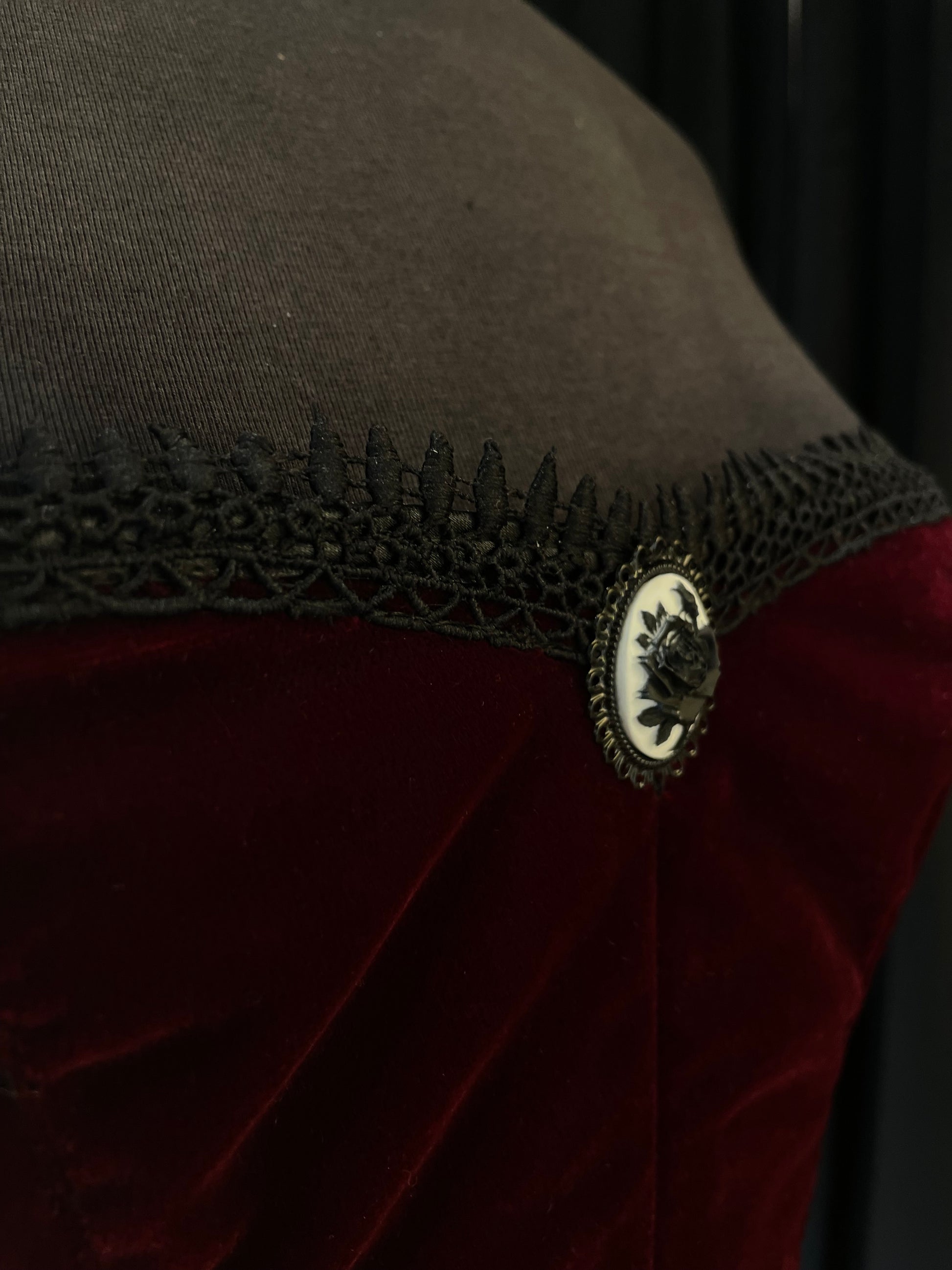 Todella ylellinen ja lumoava viinin värisestä sametista tehty Bernadette! Tämä korsetti näyttää ja tuntuu hyvältä! Valo uppoaa sametin nukkaan tehden väristä todella täyteläisen ja kauniin Reunojen pitsiset yksityiskohdat sekä koru tuovat Korsettien luksusta ja kauneutta. Tämän kanssa menet arvokkaana vaikka tanssiaisiin, mihin vain juhliin, ruokakauppaan, tai saat vampyyrin tavoin ympärillä olevat ihmiset pauloihisi.