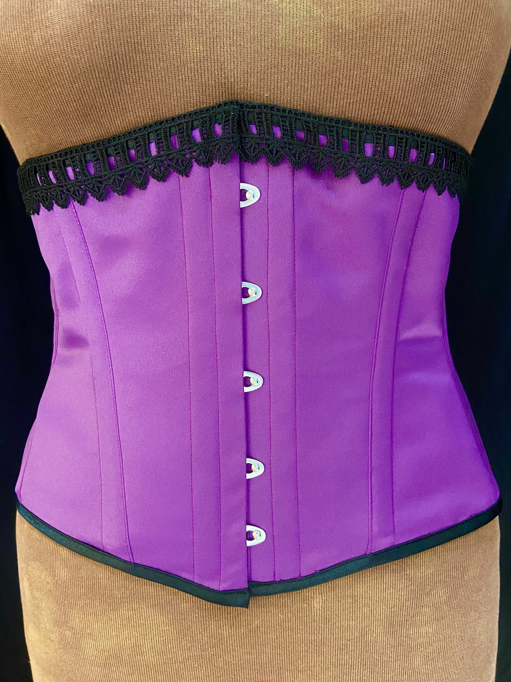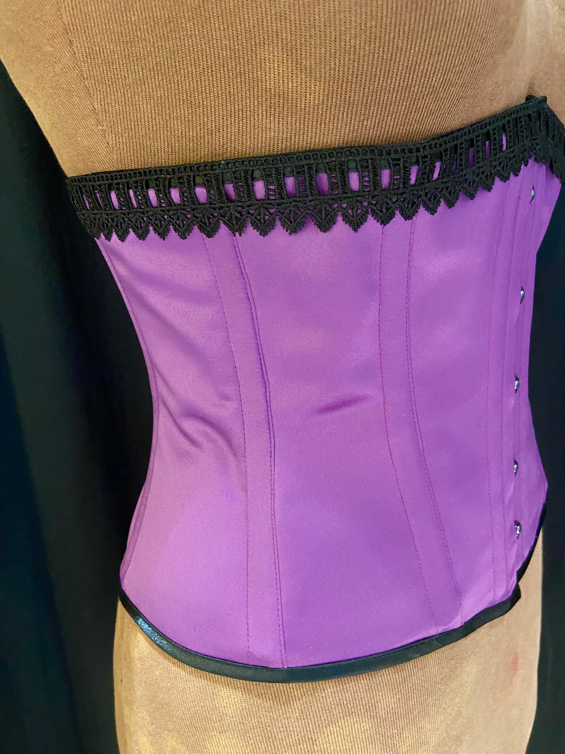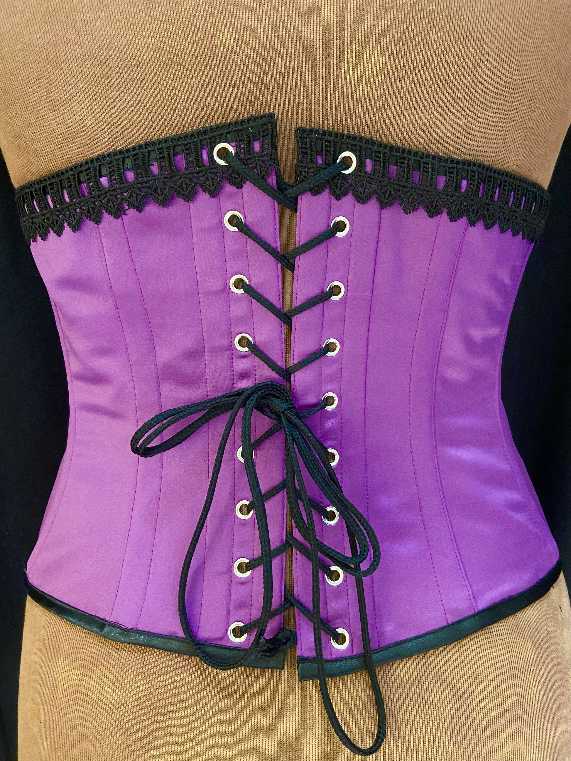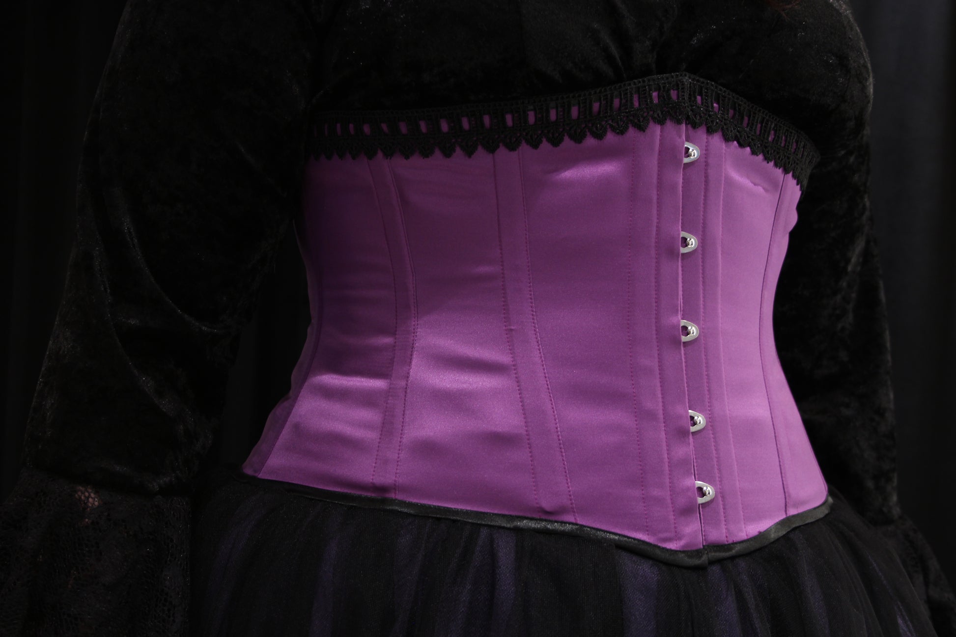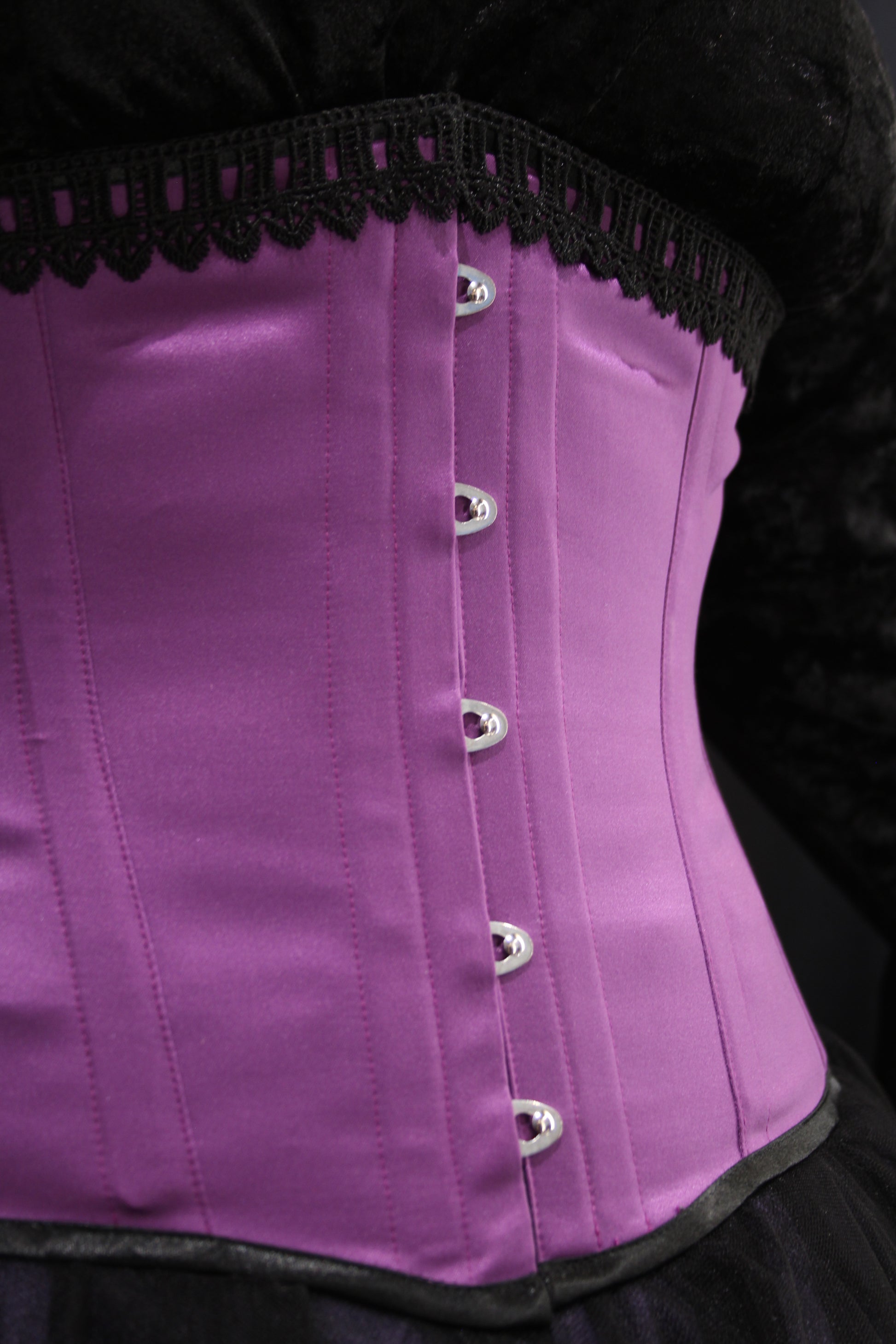 Lämmin violetti morsiussatiini, puuvillavuori. Plansetti edessä. Mustat yksityiskohdat. Soveltuu kiristämiseen.