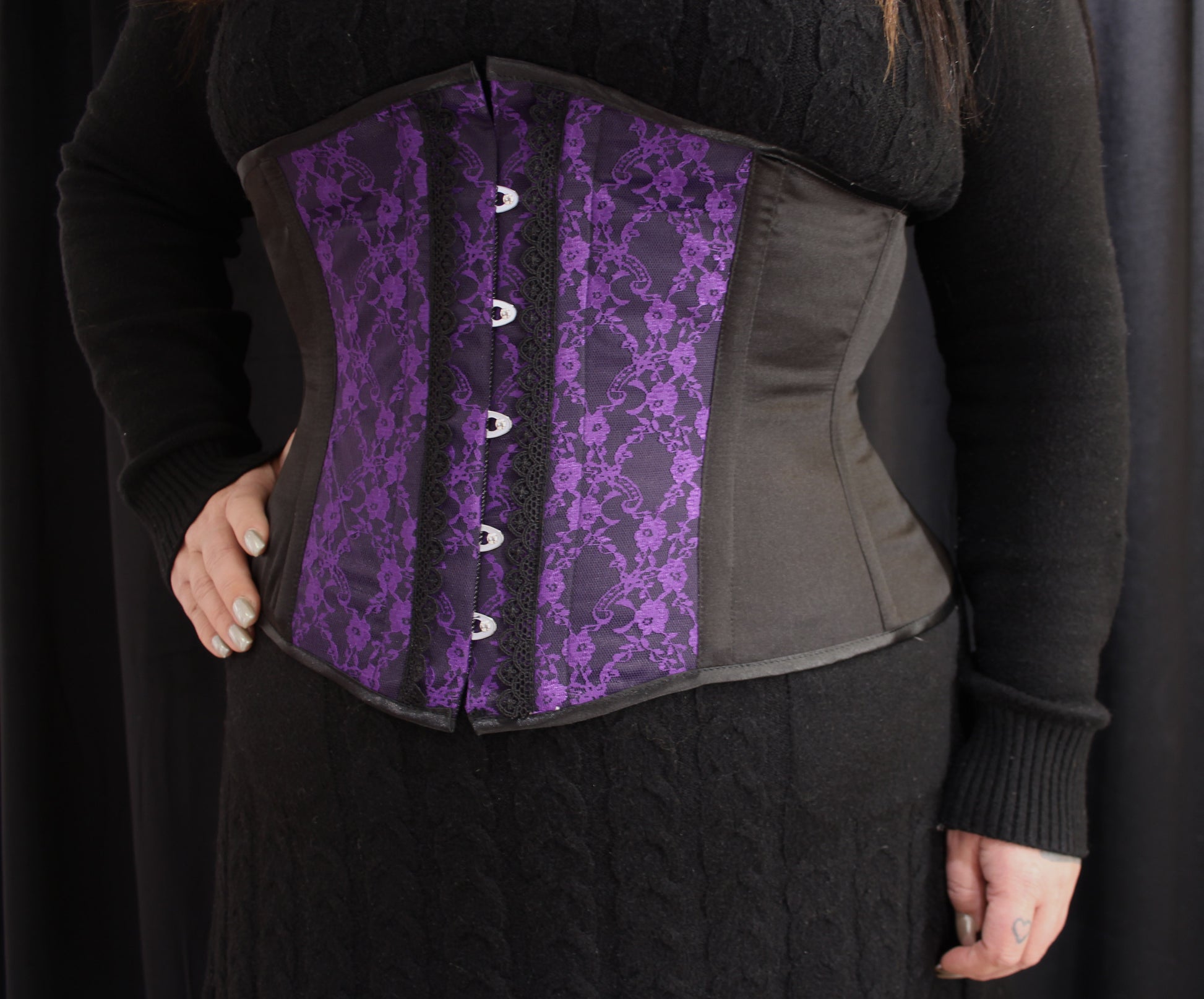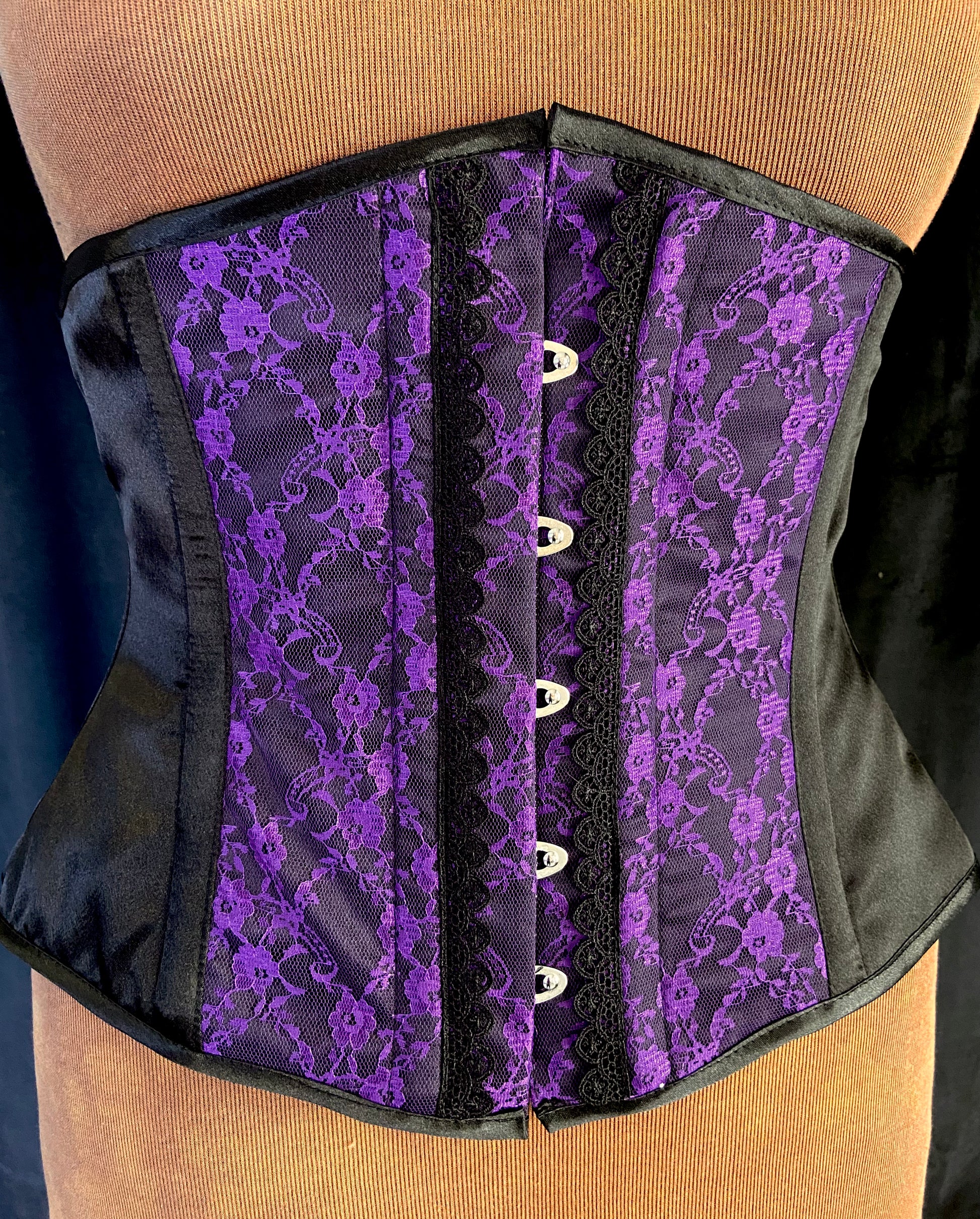 Musta satiini, violetti pitsikangas edessä. Vuoritettu tukevalla denimillä.