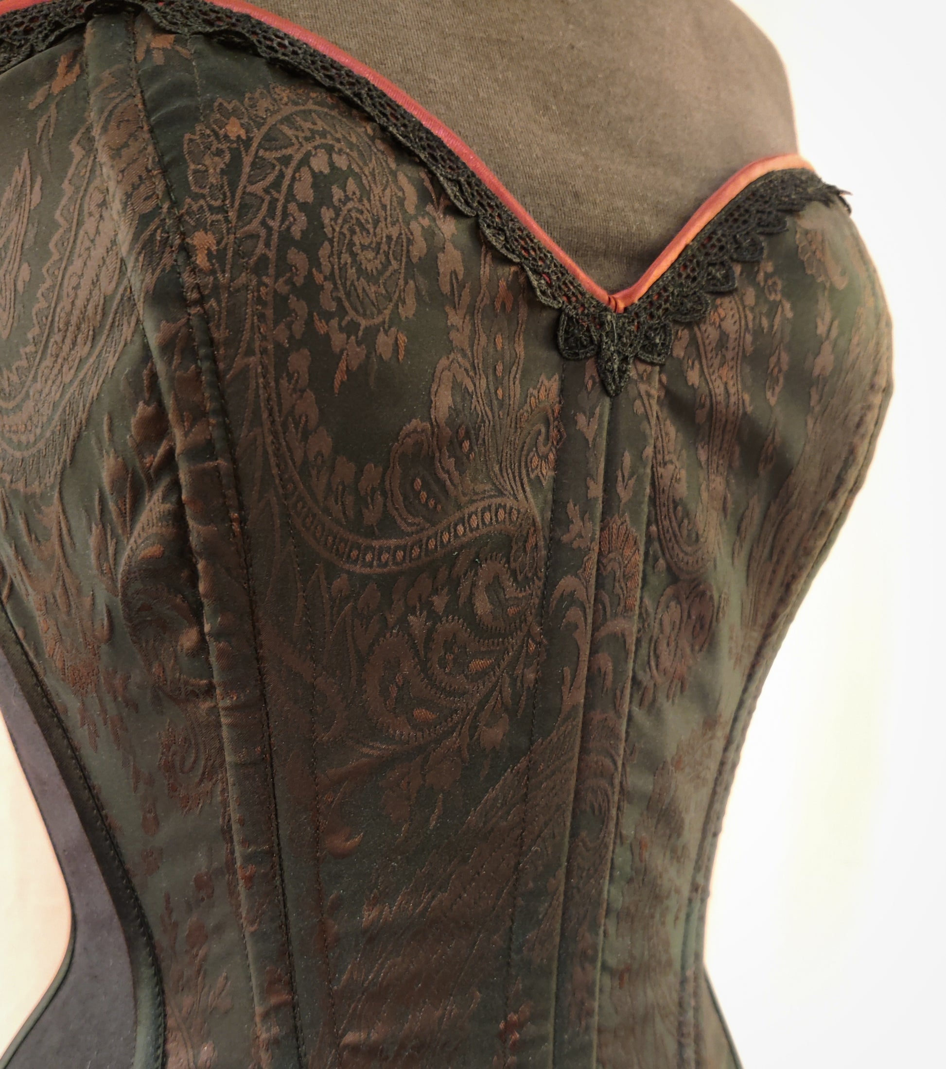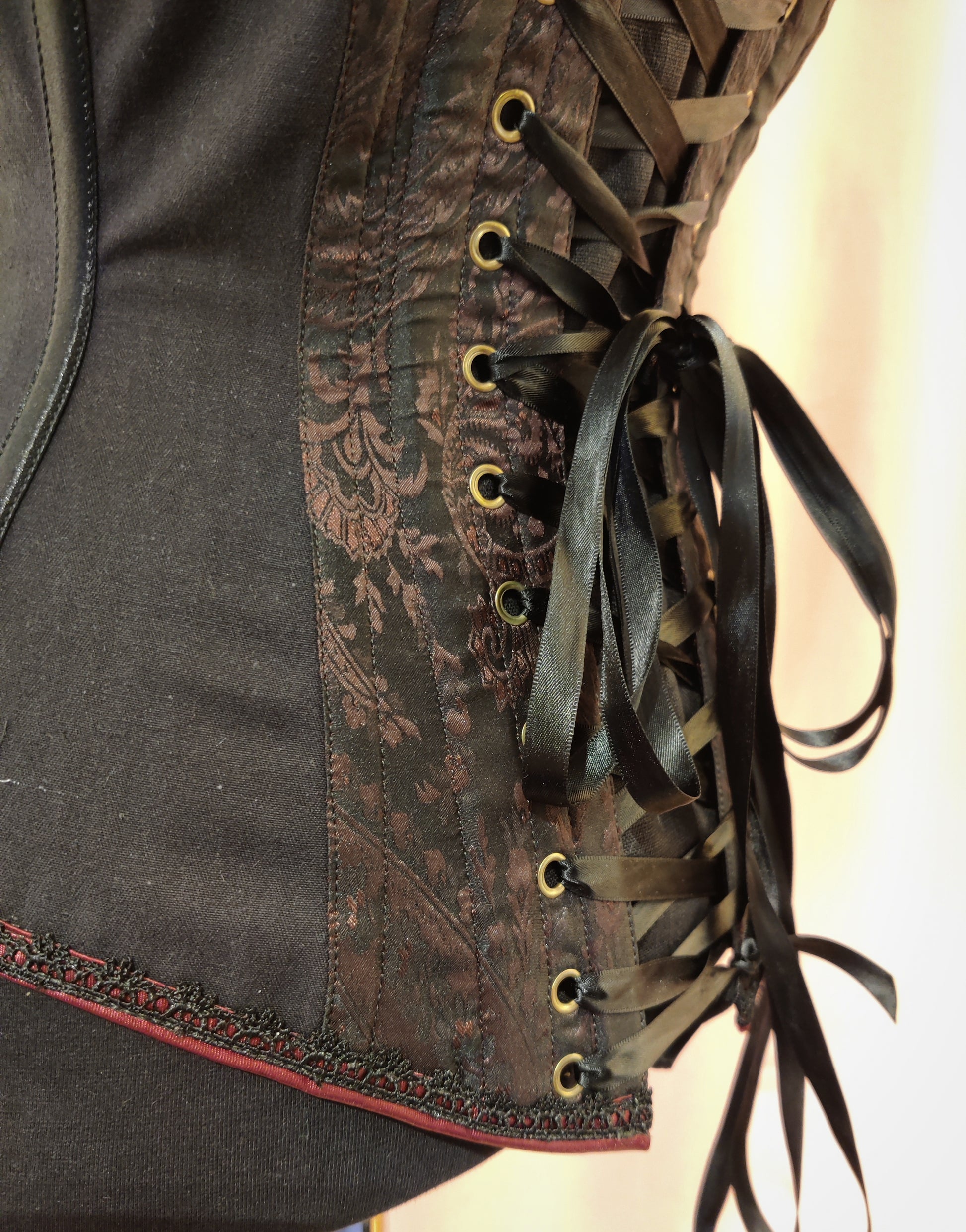 Tämä korsetti on osin kierrätettyä farkkua, kuviokangas on sekoitekangasta, ja muualla kangas on puuvillacoutilia. Korsetti on luutettu terässpiraalilla ja synteettisellä valaanluulla.