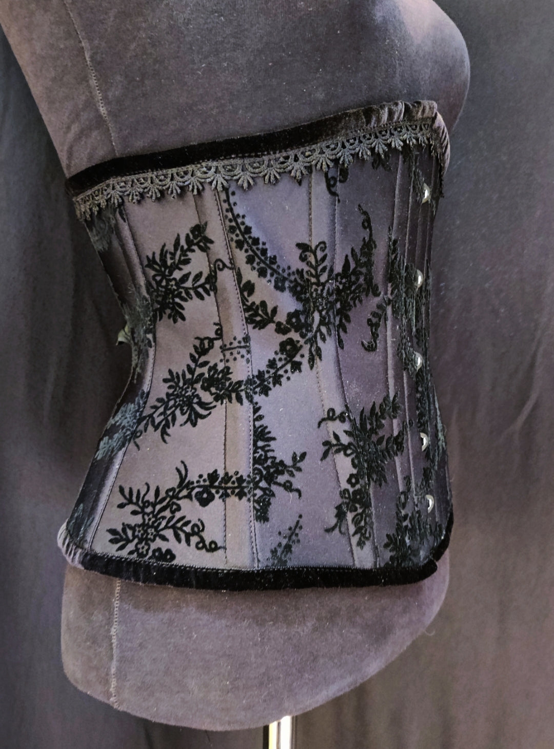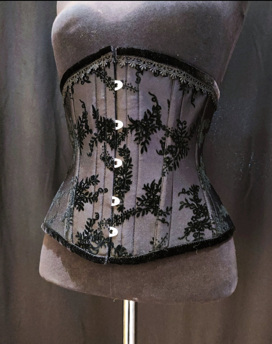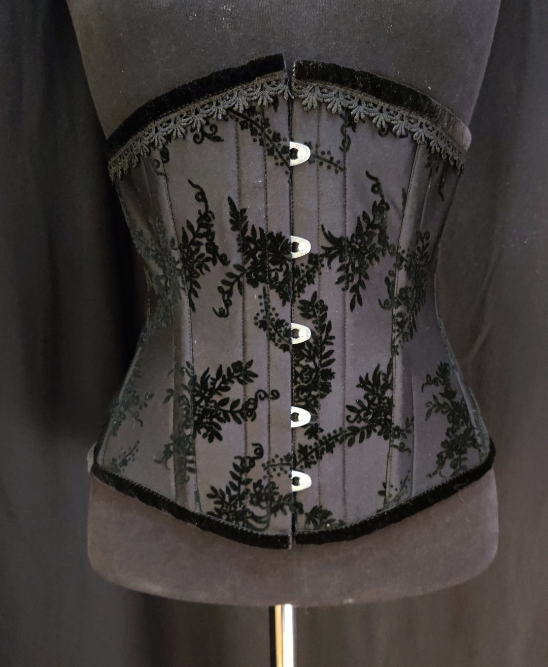 Musta sametti toimii aina! Täysluutettu musta vuorellinen vyötärökorsetti, jossa mustat samettikuviot. Toteutettu Rakel-kaavalla. Sopii noin 74cm vyötäröiselle käyttäjälle. Luutettu synteettisellä valaanluulla, soveltuu kohtalaiseen kiristykseen.