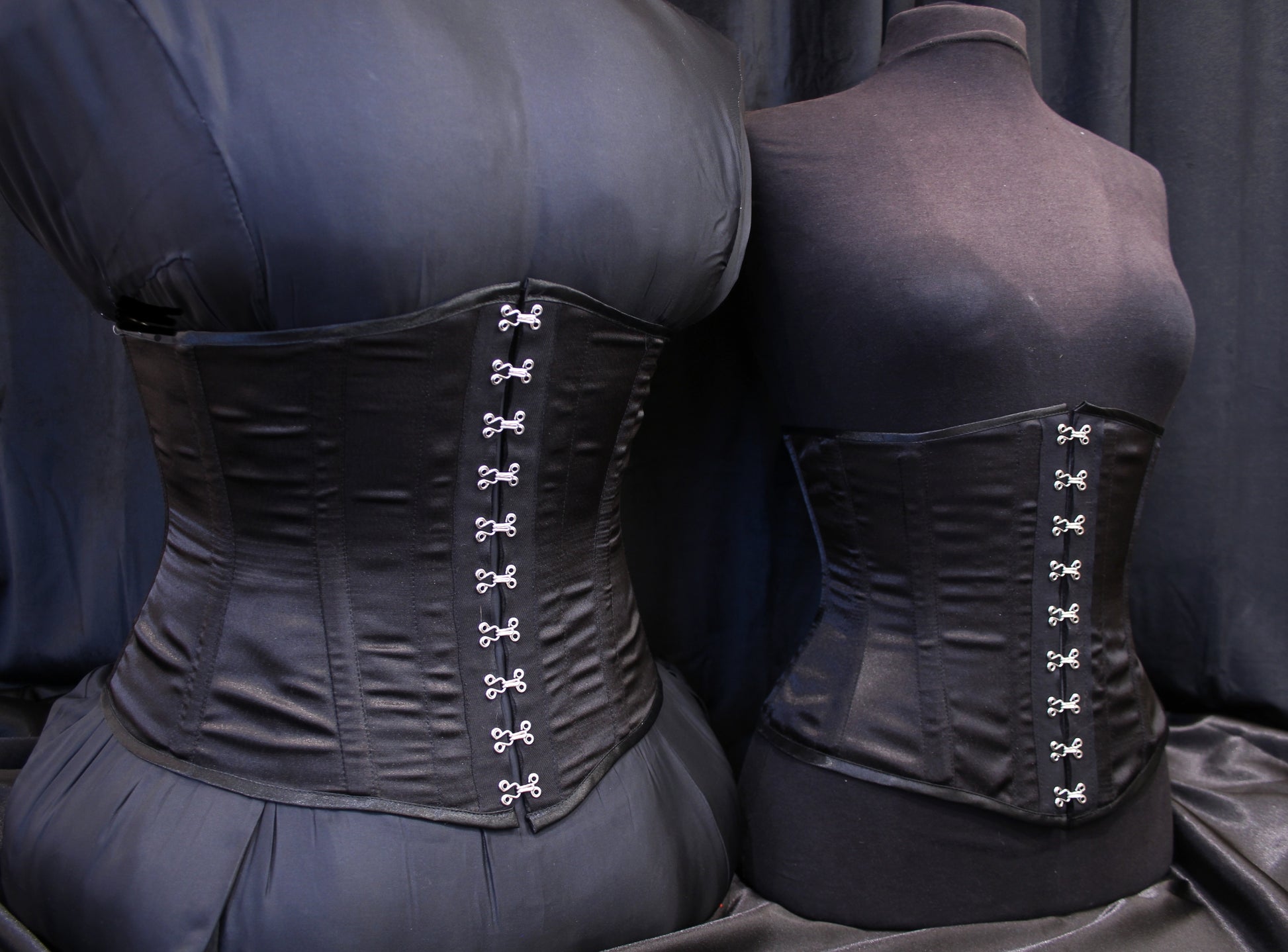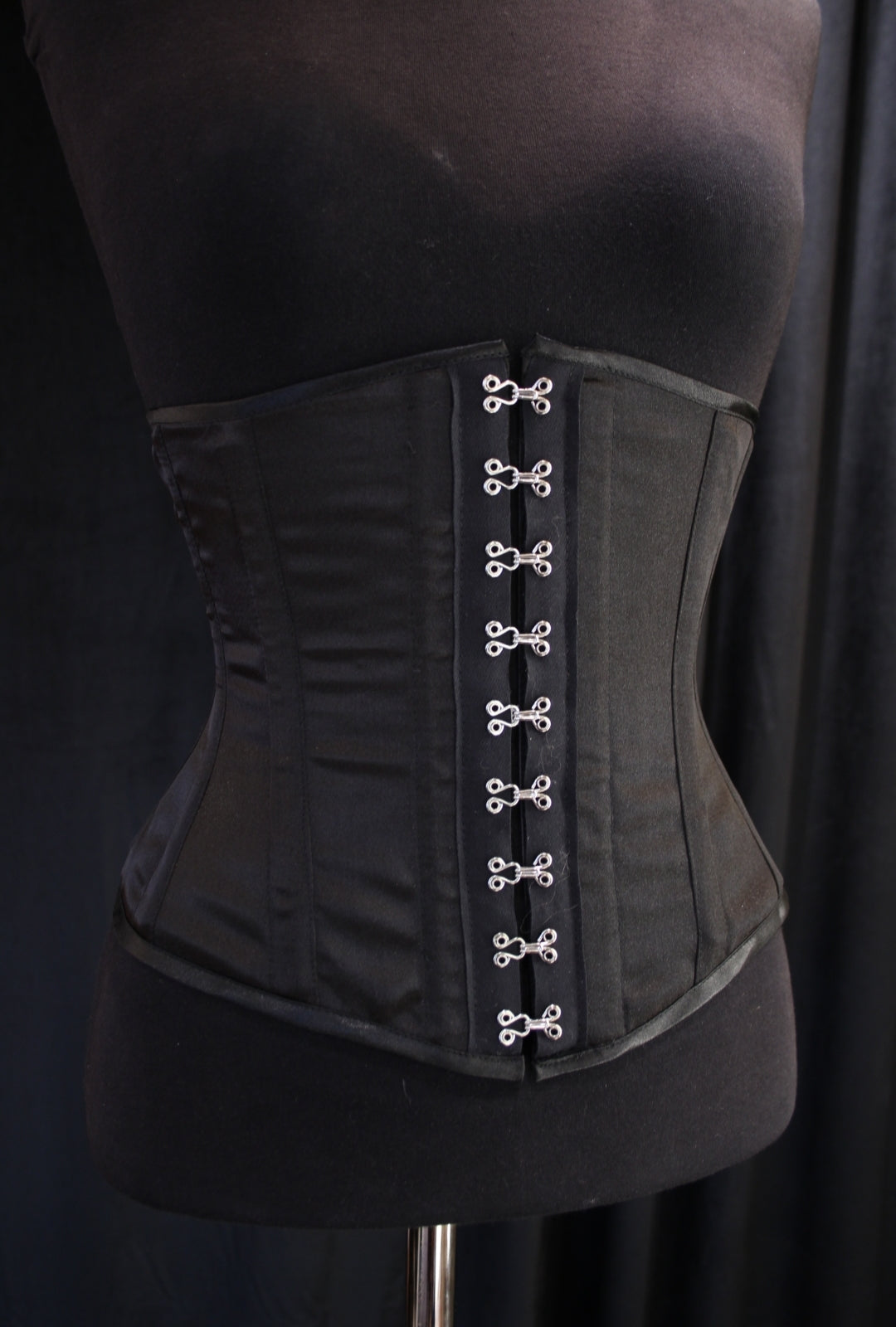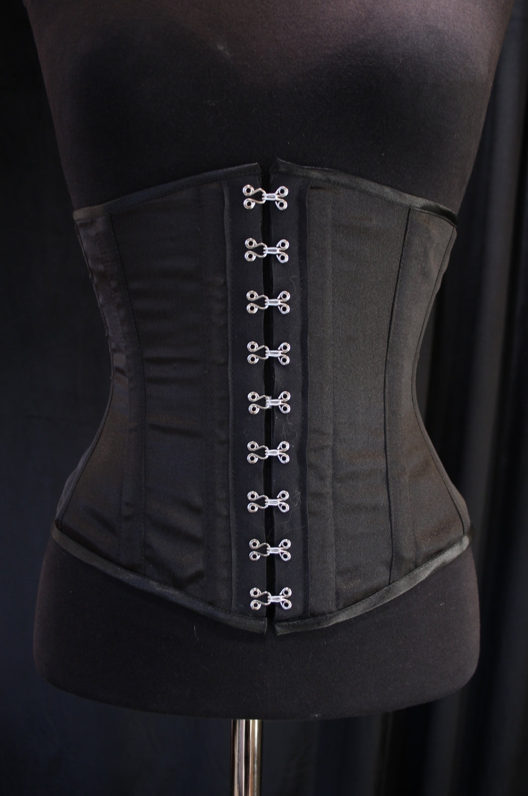 Kaunis perus musta satiininen vyötärökorsetti jonka käyttömahdollisuudet ovat loputtomat! Tähän on helppo rakentaa monta eri asukokonaisuutta, ja se sopii niin arkeen kuin juhlaan. Vuori puuvillaa. Edessä tukevat hakaset. Kokonaan luutettu synteettisellä valaanluulla, sopii kohtalaiseen kiristämiseen.