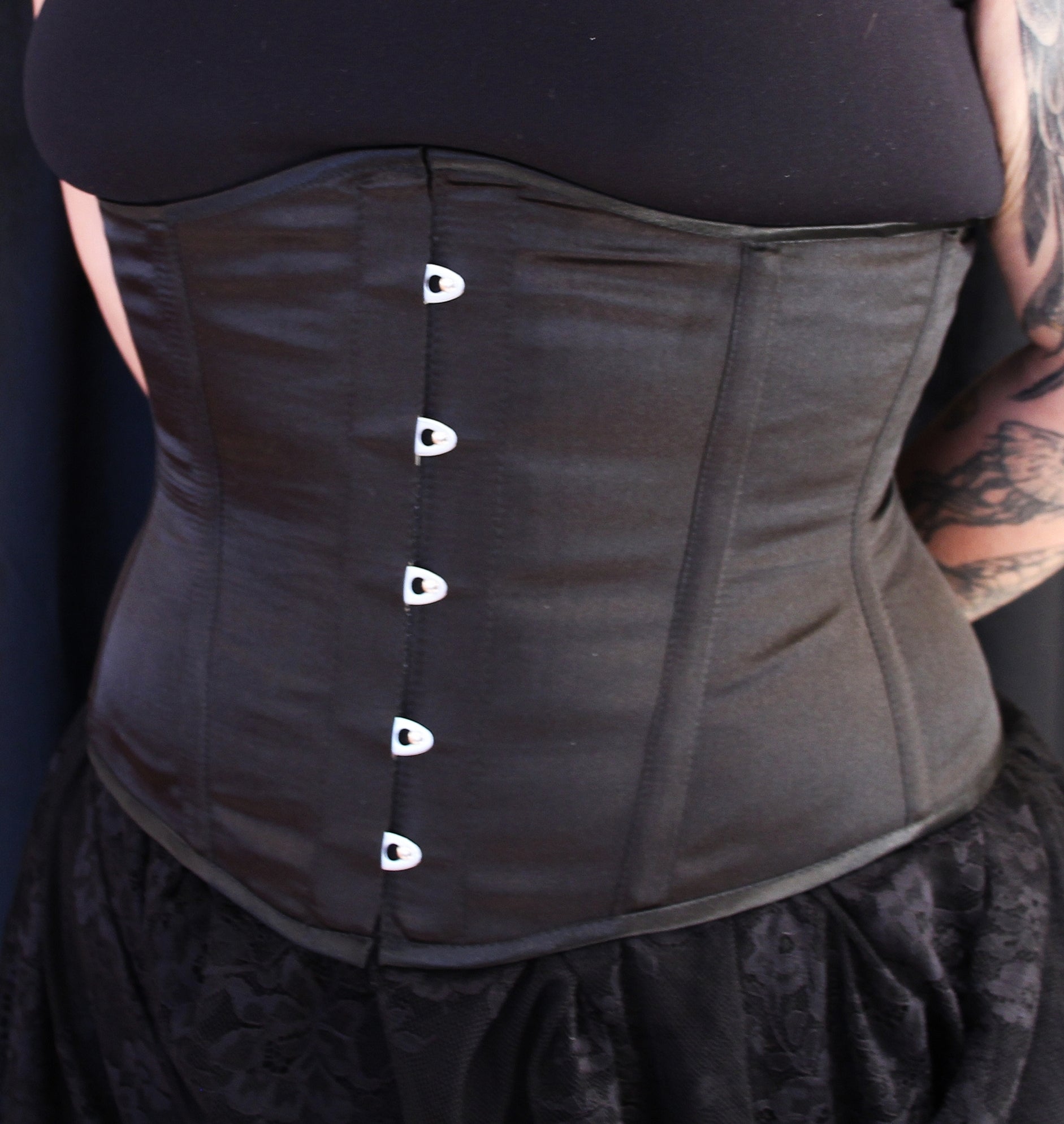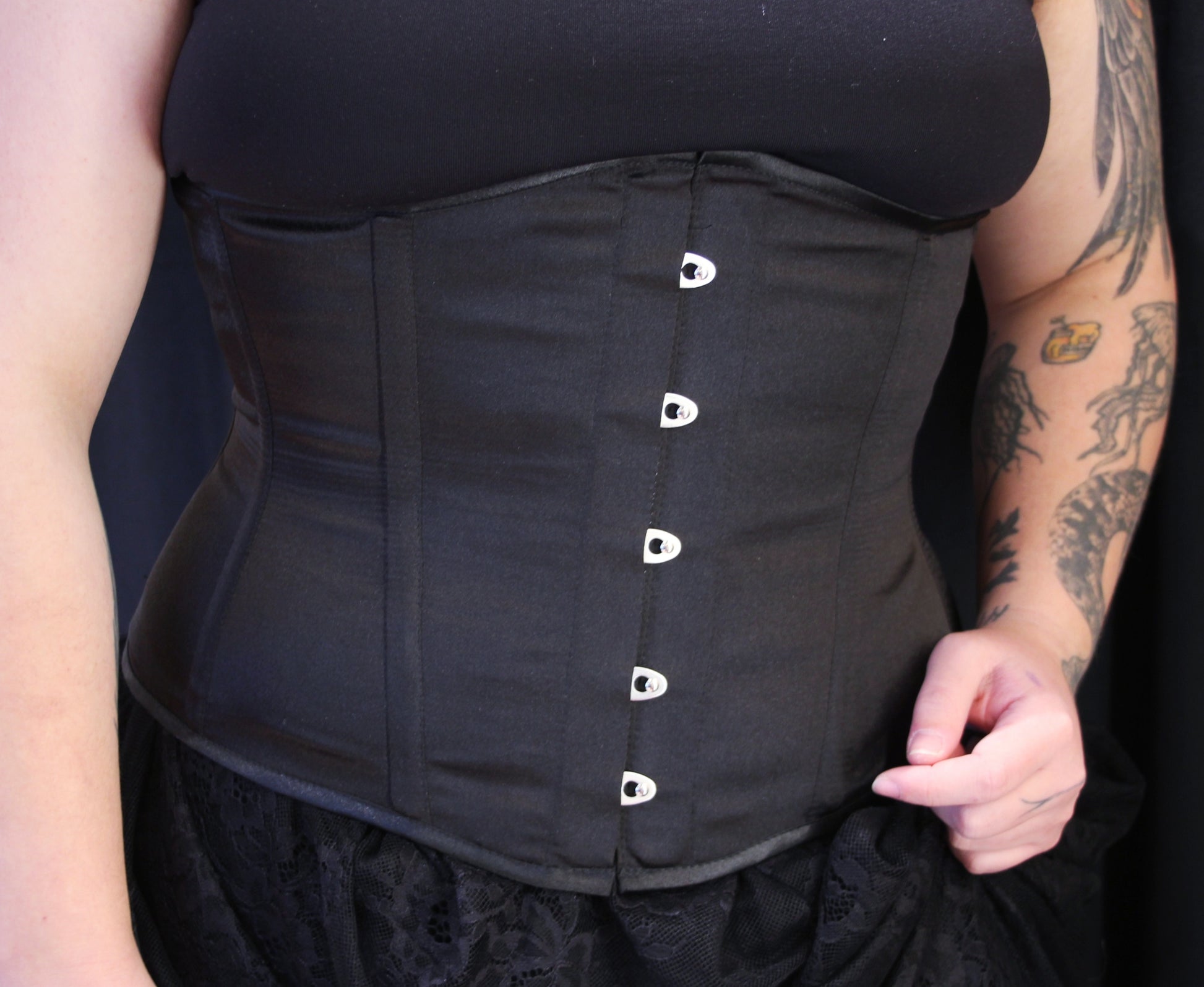 Musta vyötärökorsetti kuuluu jokaisen korsetin käyttäjän vaatevarastoon. Näyttävä kaikessa yksinkertaisuudessaan, tämän ympärille on helppo kehittää asu jos toinenkin. Soveltuu myös alusvaatteeksi tuomaan muotoja.
