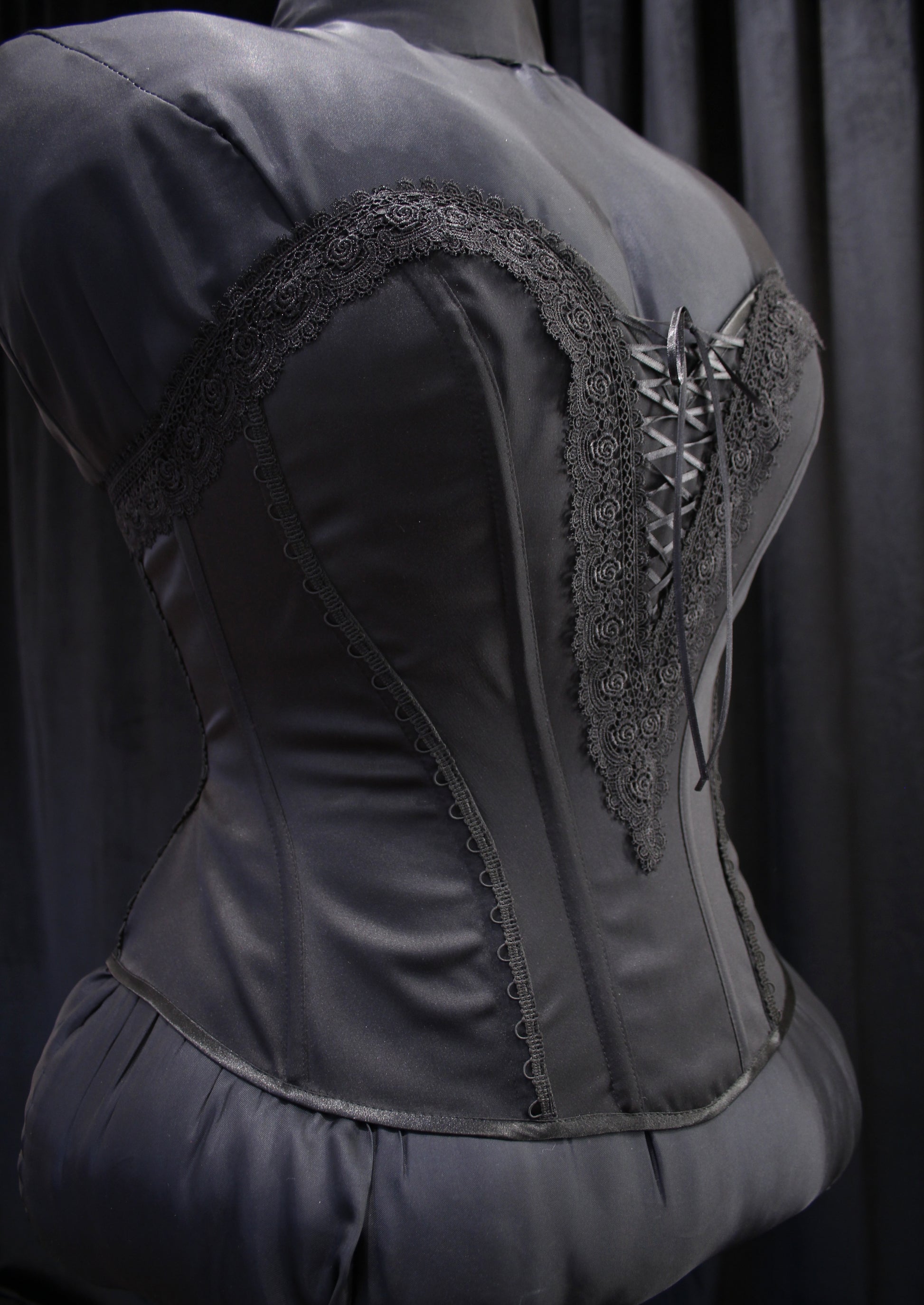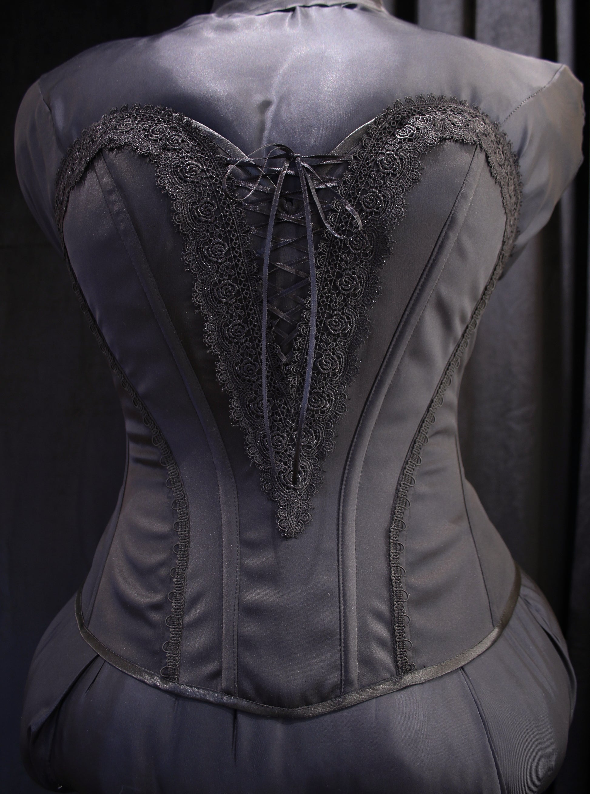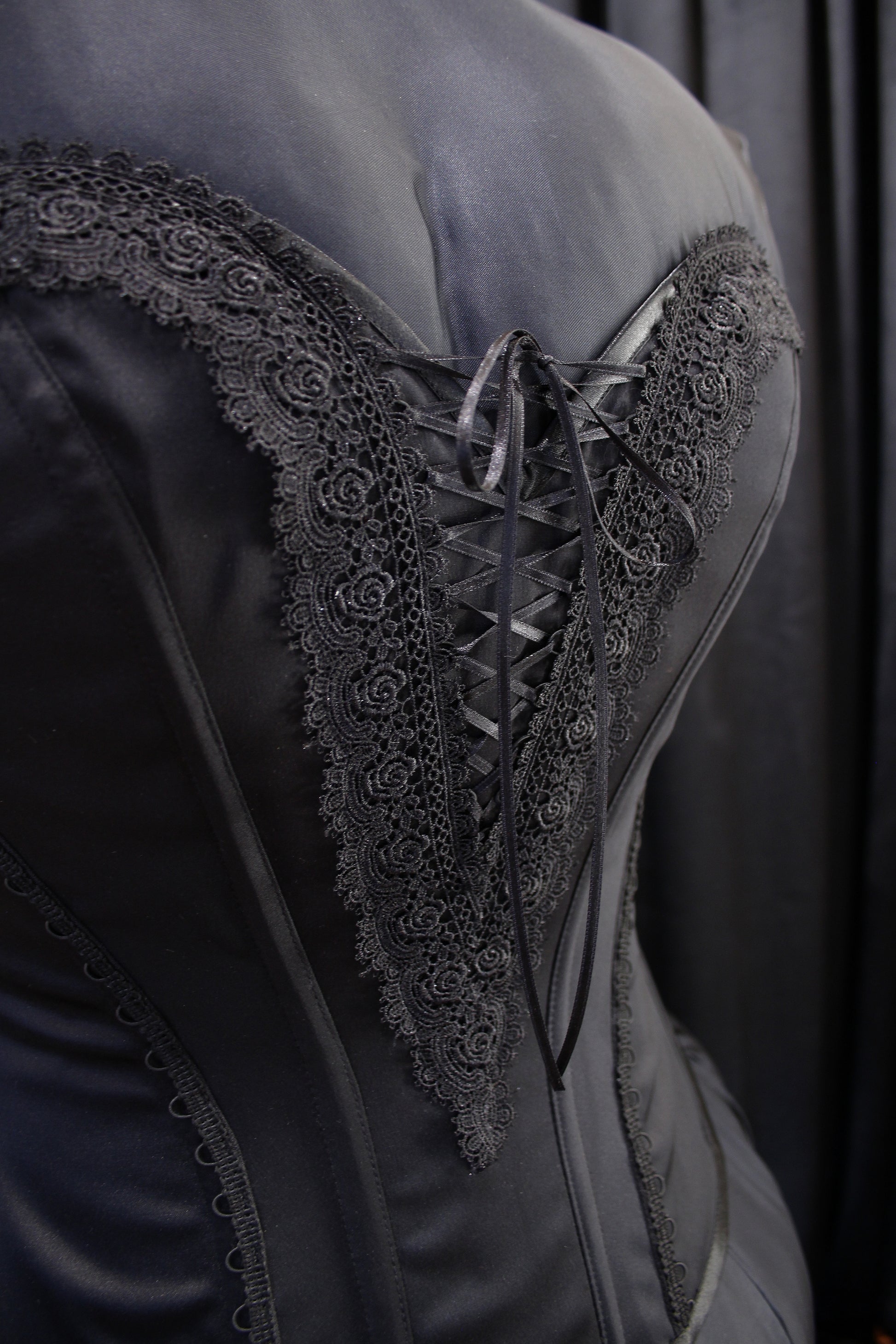 Romanttinen ja seksikäs rinnanyli korsetti kauniilla yksityiskohdilla. Soveltuu kohtalaiseen kiristämiseen. Sopii loistavasti sekä arkeen että juhlaan, tai vaikka makuukammarrin puolelle. Pitsi sekä edessä oleva nyöritys kiinnittävät katseen ja luovat todella syvän kaula-aukon illuusion. Päällikerros mustaa morsiussatiinia, vuorikangas tukevaa puuvillafarkkua. Tuettu edestään ja takaa synteettisellä valaanluulla, muissa saumoissa terässpiraalia. Sisältää varjolistan.