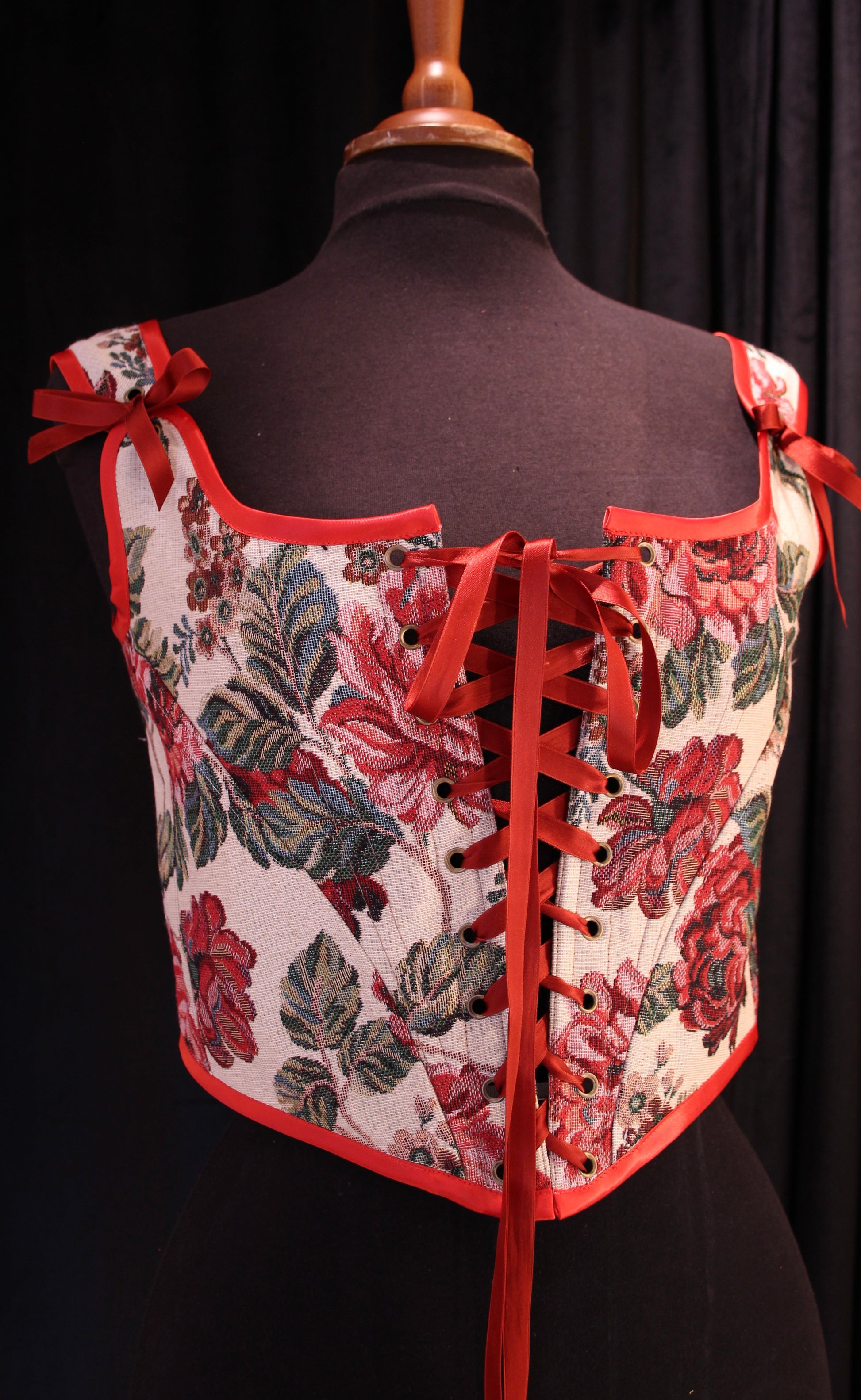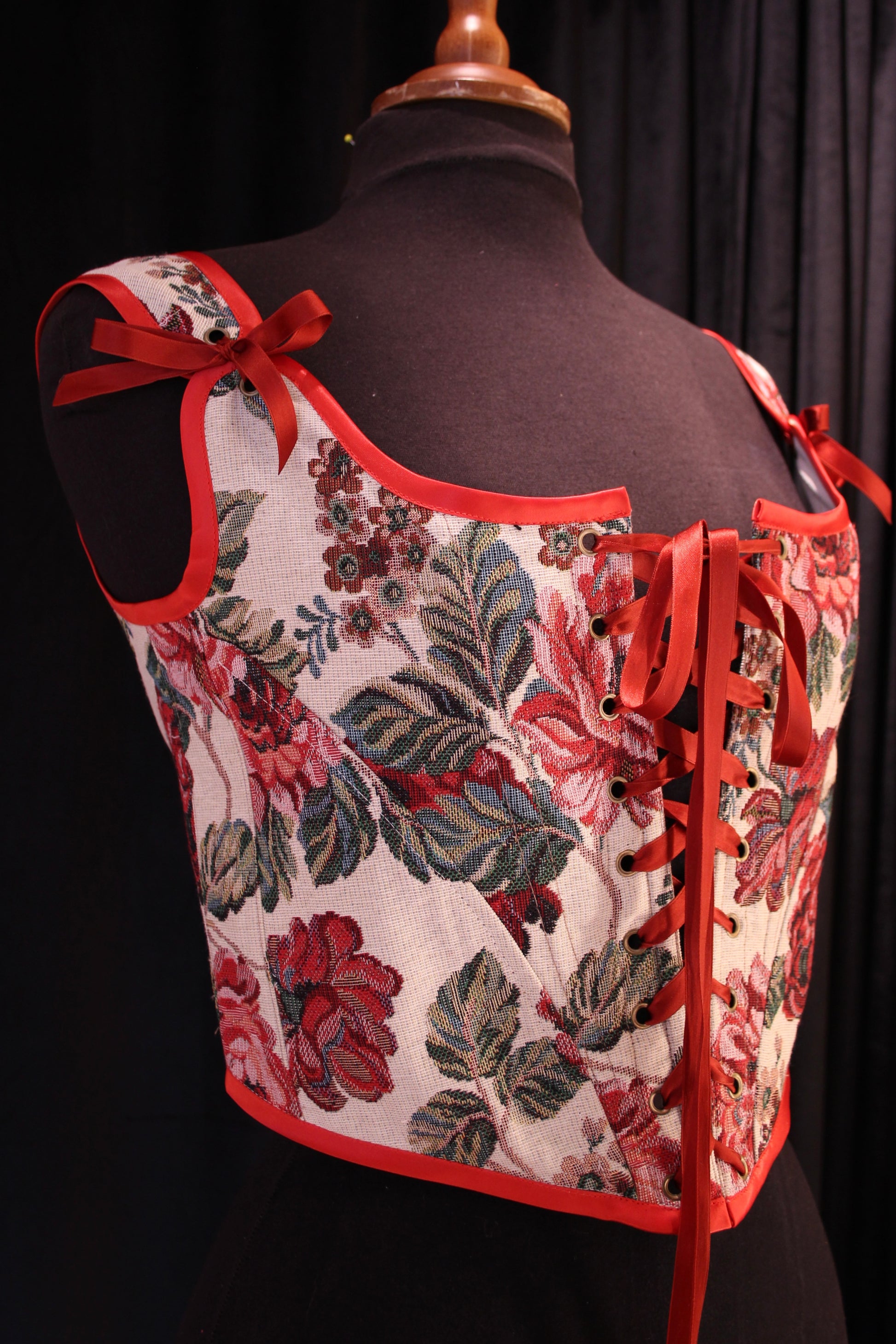 Historiasta inspiraation saanut kevyt toppikorsetti. Kevyt luitus edessä ja muutamassa saumassa, tukien rintaa kevyesti ja tuoden ryhtiä. Tukevaa gobeliinikangasta. Alareuna loppuu vyötärölle, joten tämä kaunokainen näyttää mahtavalta niin tapahtumissa pellavamekon päällä, tai toppina farkkujen kanssa. Helppo yhdistää moneen eri asukokonaisuuteen!