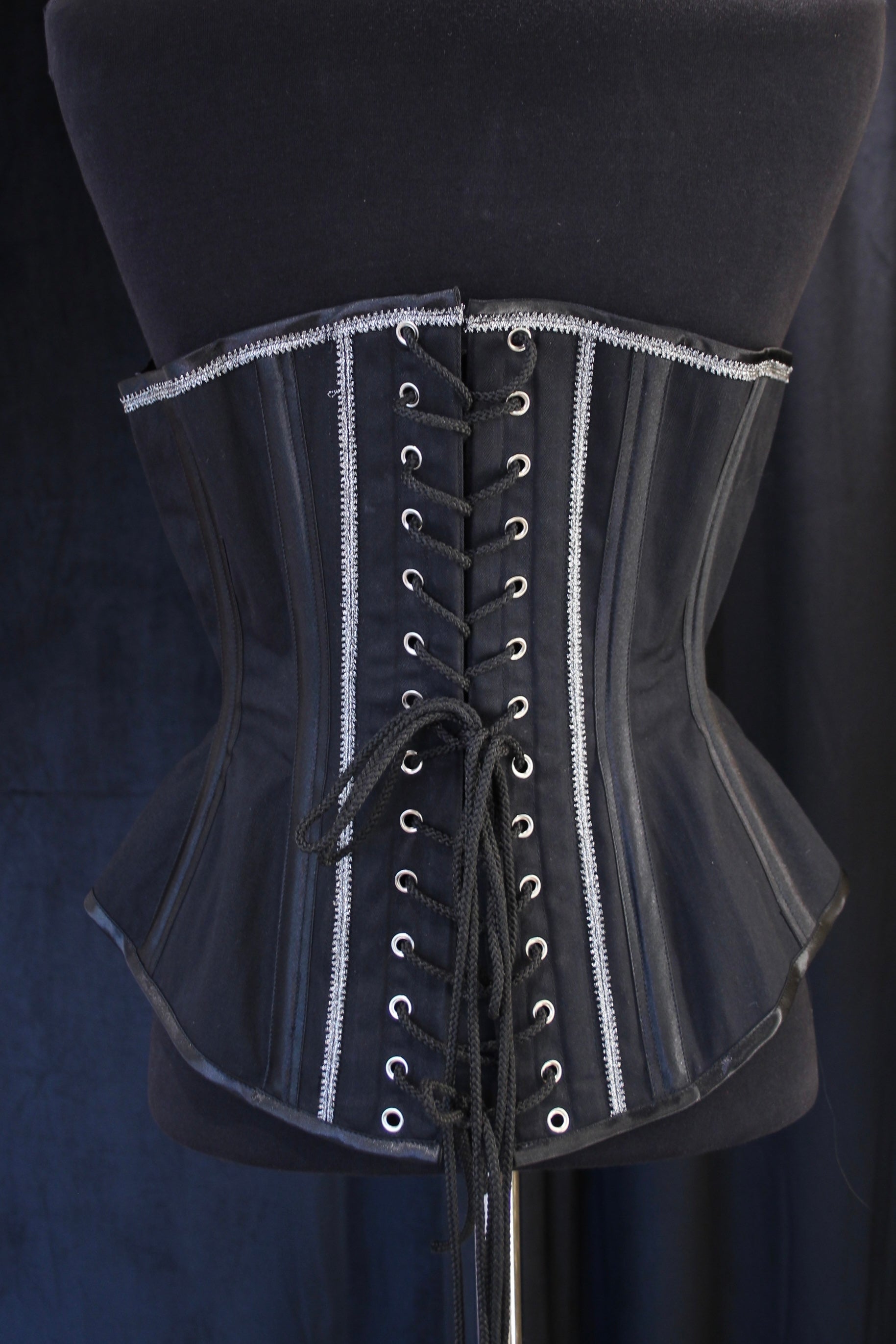 Upea hopeamustalla pitsillä koristeltu rinnan yli tuleva korsetti. Etusivuilla läpikuultavat paneelit, joista näkyy iho läpi. Sopii loistavasti eri juhlallisin tilaisuuksiin, arkeen, tai sinulle joka haluat toteuttaa itseäsi pimeyden valtiattarena.
