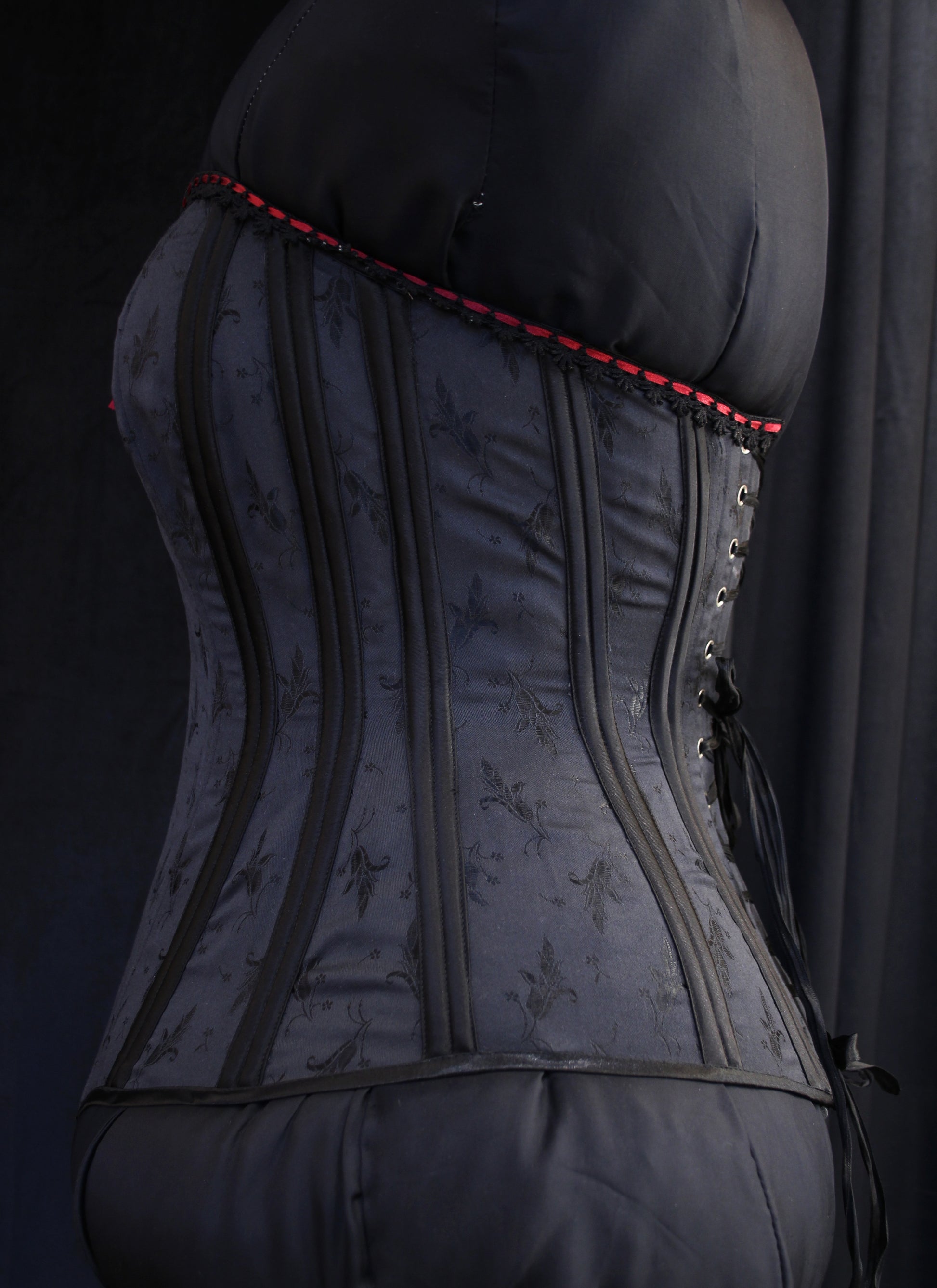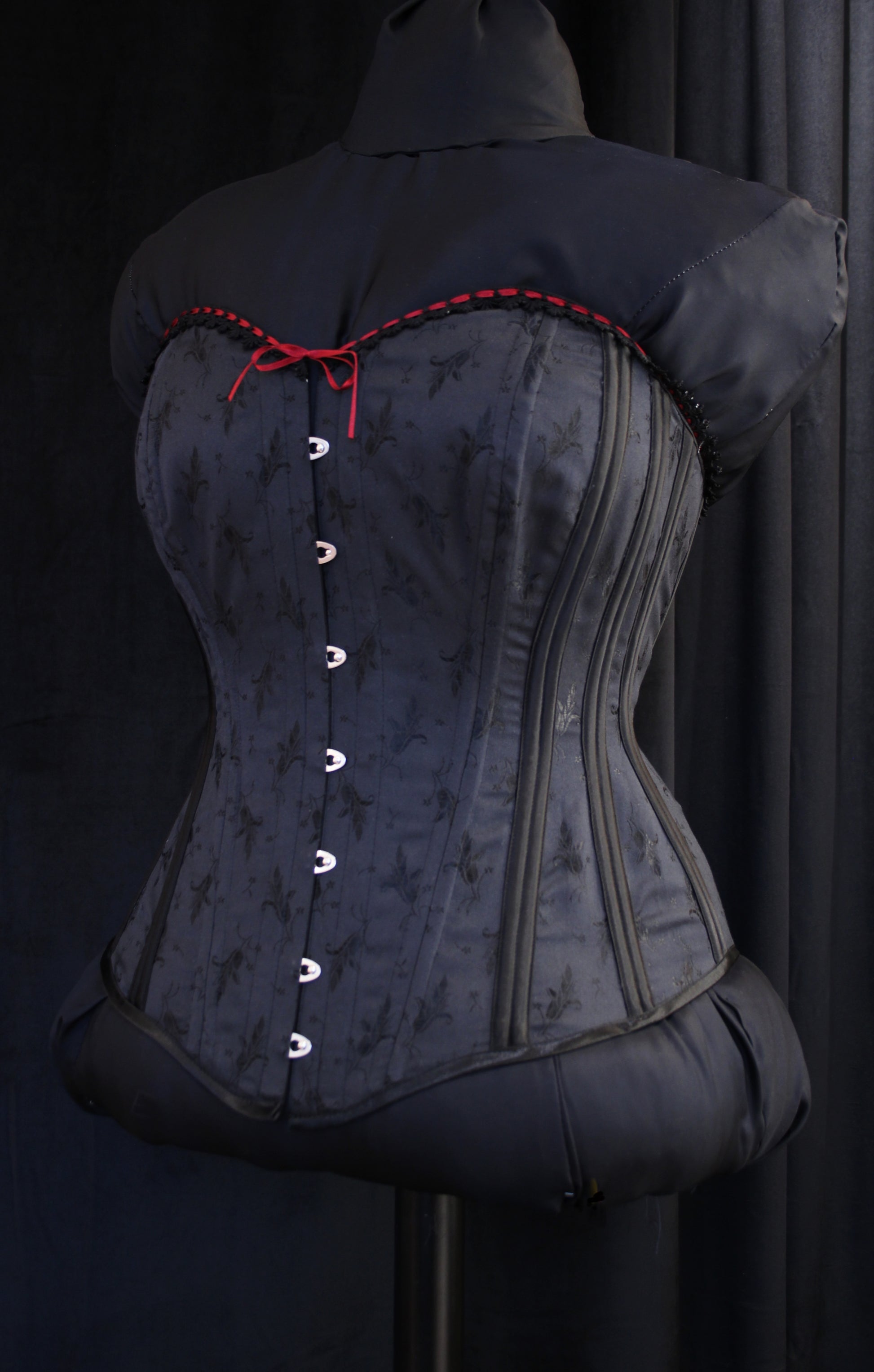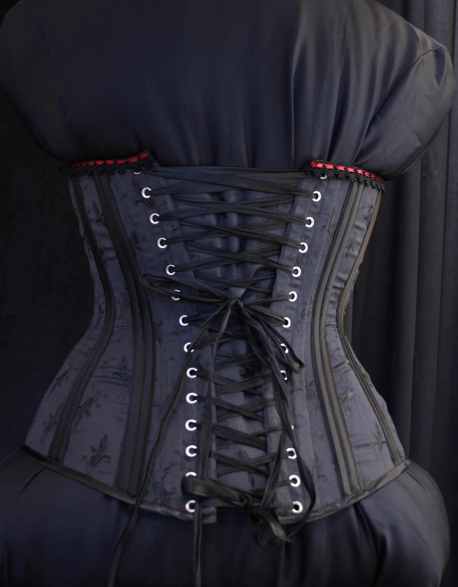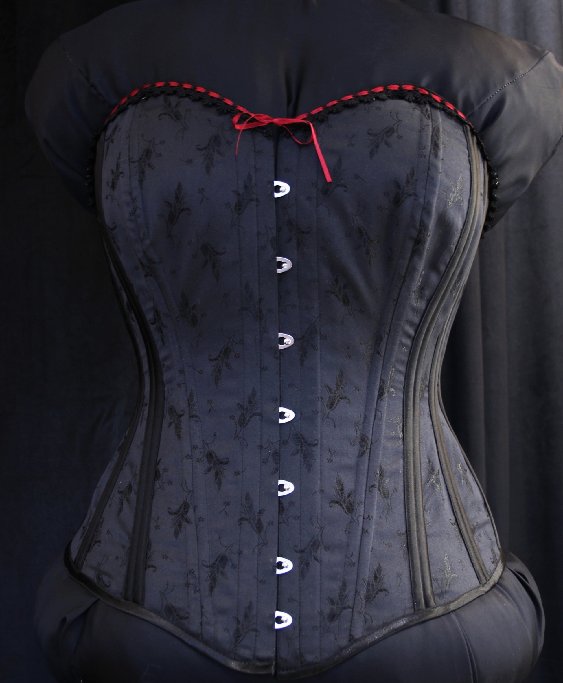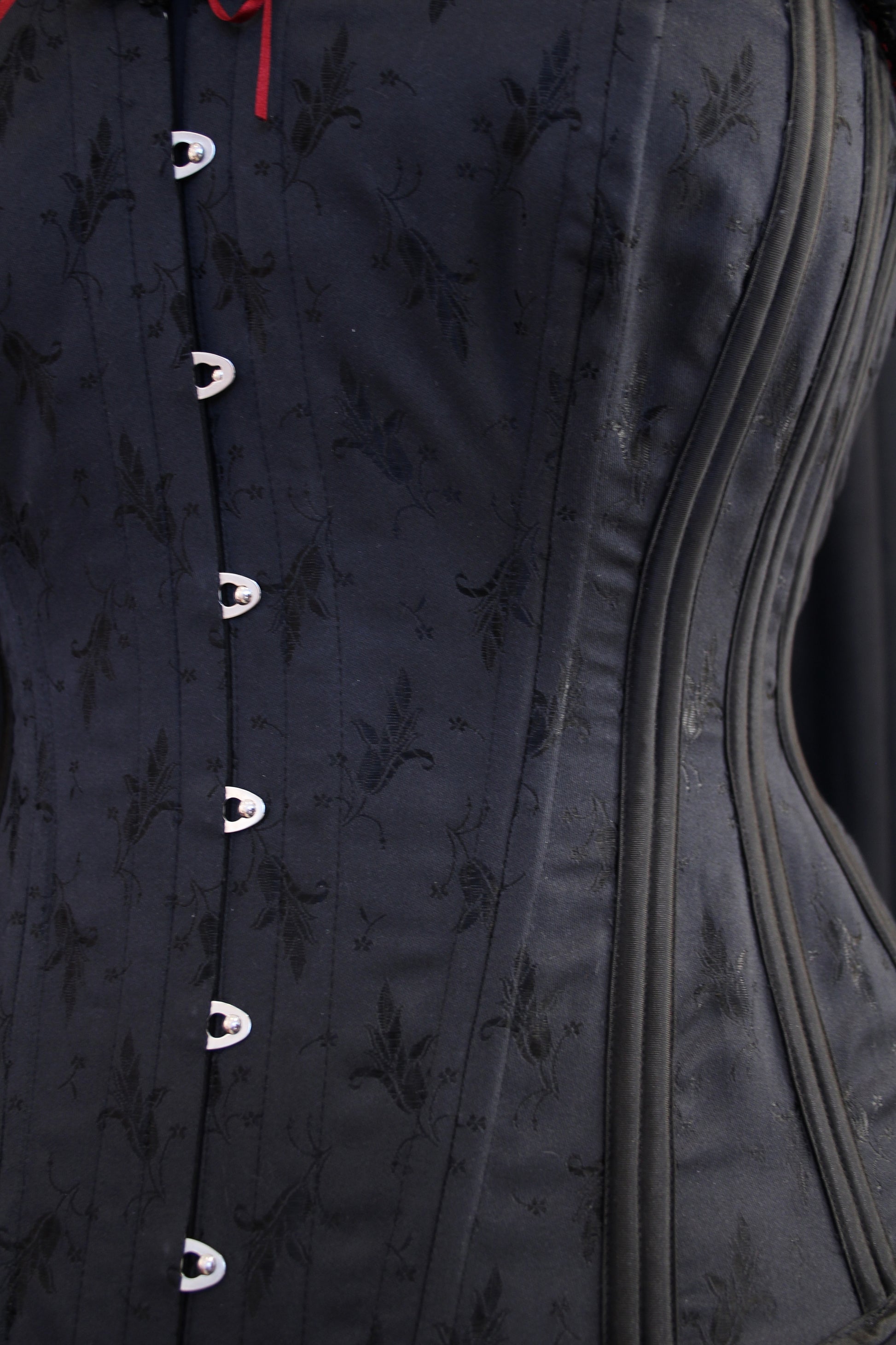 Romanttinen ja ylellinen musta onelayer korsetti. Materiaali on tukevaa koristeellista puuvillacoutilia, tuettu edestä ja takaa synteettisellä valaanluulla, muissa saumoissa terässpiraalia. Plansetti helpottaa korsetin pukemista päälle. Sopii kiristämiseen. Saumoissa on tuplaluut joka tuo näyttävyyttä sekä todentotista tukevuutta. Suunnittelu alusvaatteeksi mutta soveltuu myös osaksi asua. Halaa kurveja ja nousee reilusti rinnan päälle tuoden tukevuutta.