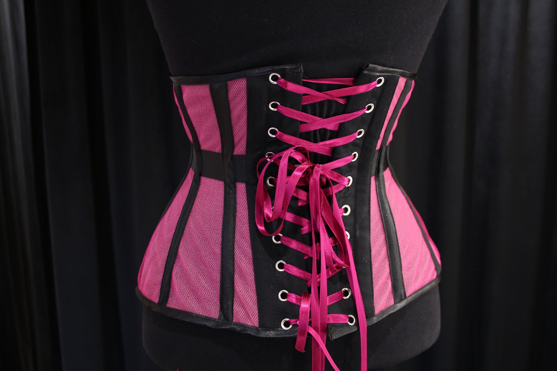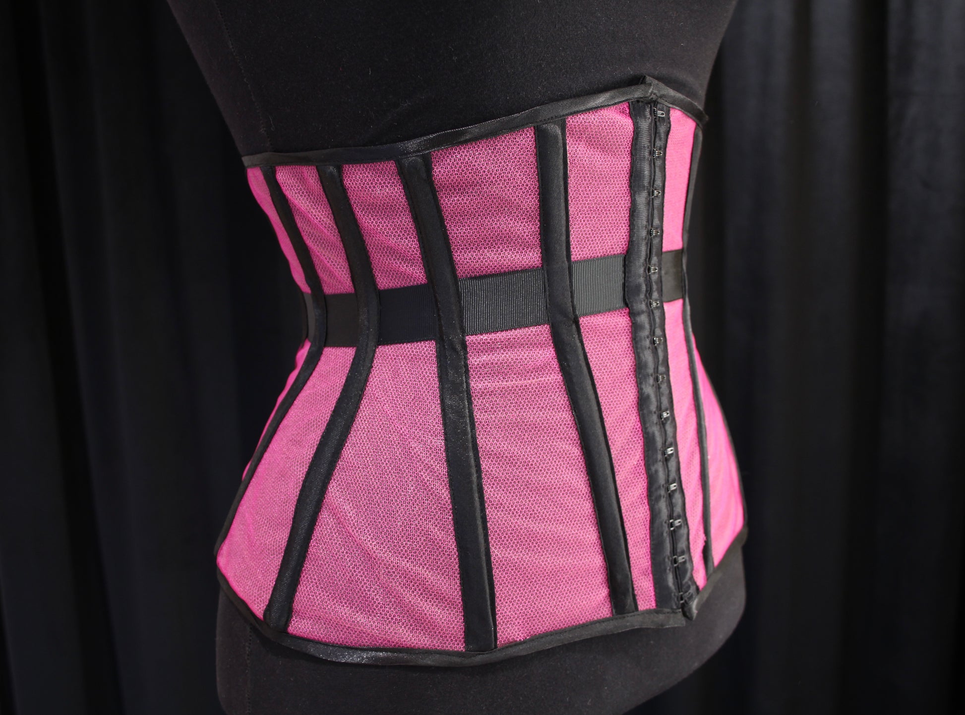 Läpikuultava tyllikorsetti. Pohjalla sileä beige kangas, pinkki kovempi tylli ja päällä pehmeä tyllikerros. Luut spiraalia. Edessä hakaskiinnitys.