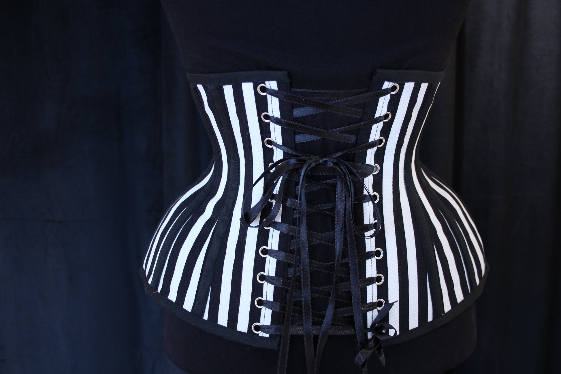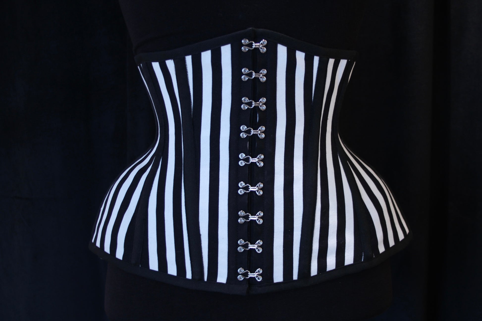 Upea mustavalkoraidallinen vyötärökorsetti hakaskiinnityksellä. Erittäin kurvikas vyötärömalli sopii erityisesti kokeneelle korsetinkäyttäjälle tai kurvikkaalle vartalolle.