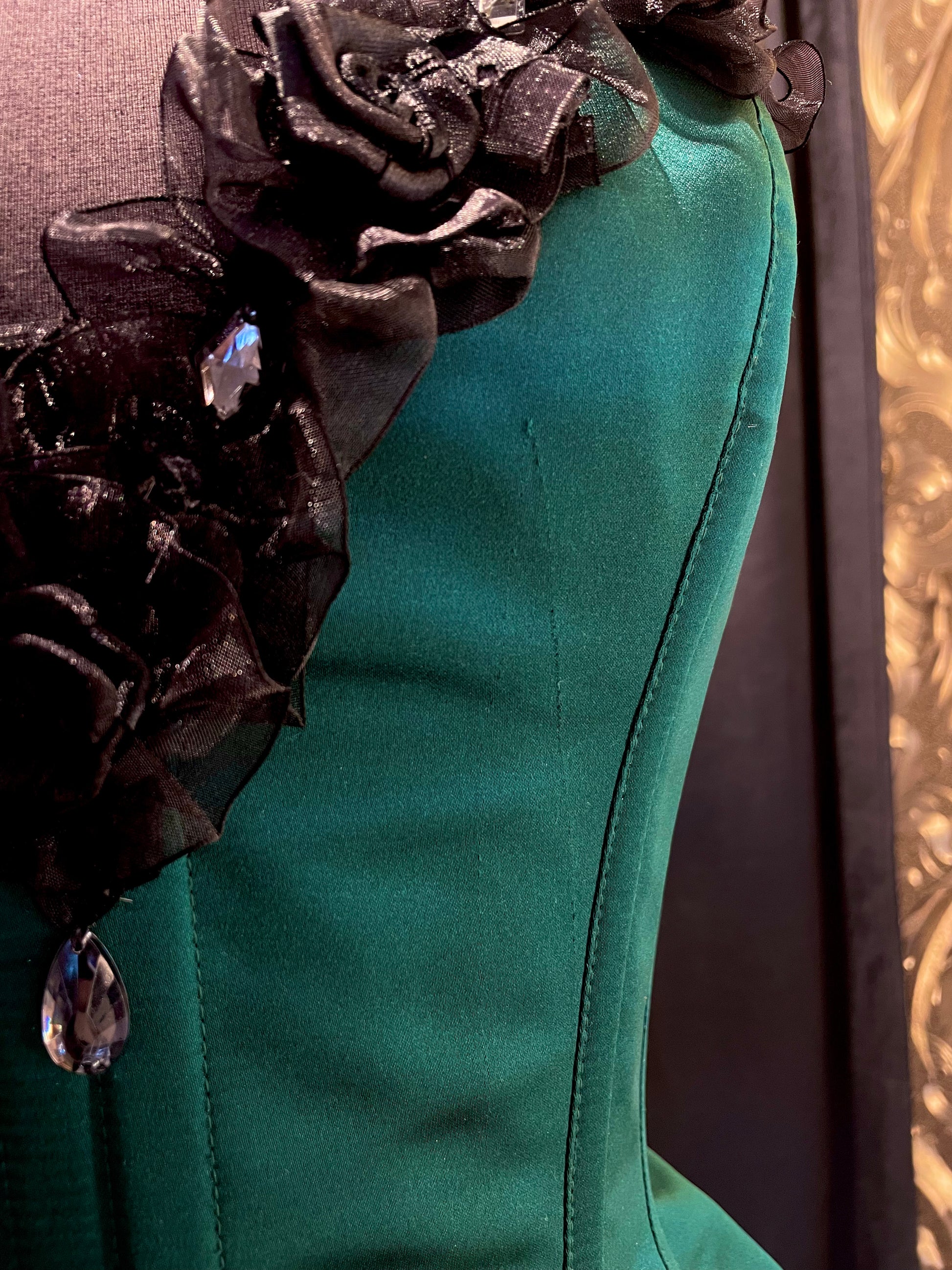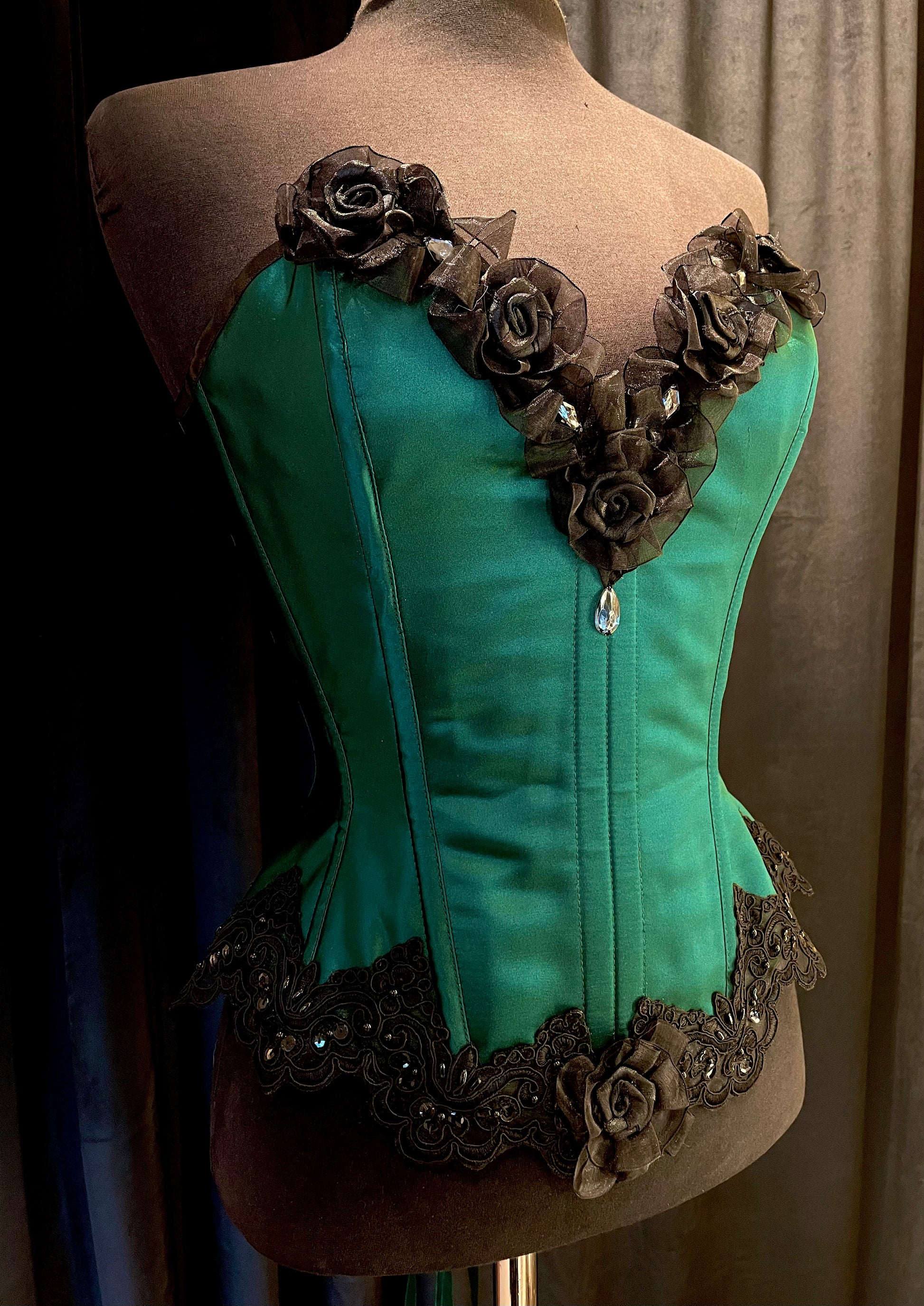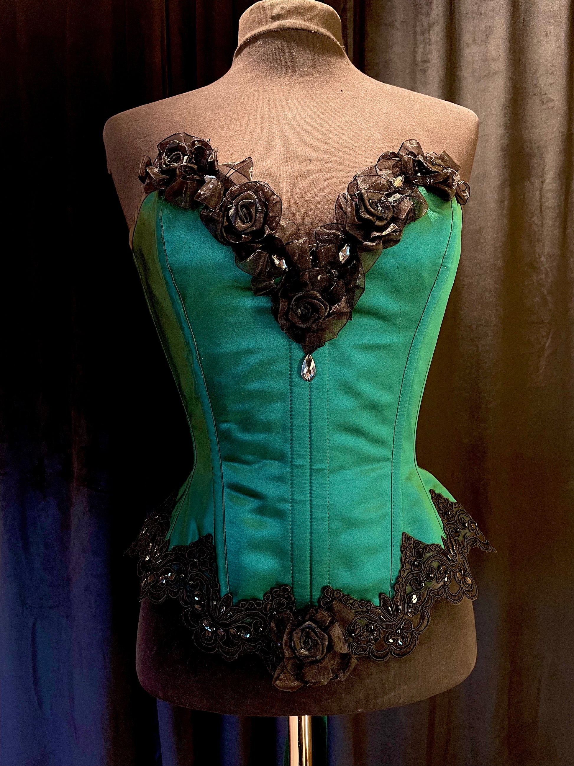 Upea ja ylellinen smaragdin vihreä ja koristeellinen korsetti! Helmikirjailtu pitsi, hennot musta ruusut ja käsin ommellut kimaltavat kivet kääntävät takuulla katseet. Sopii loistavasti burleskitapahtumiin, ylellisiin iltoihin ja vaikka makuuhuoneeseen. Korsetissa on myös "black swan" tunnelmaa ja tuo mieleen pimeyden kuningattaren.