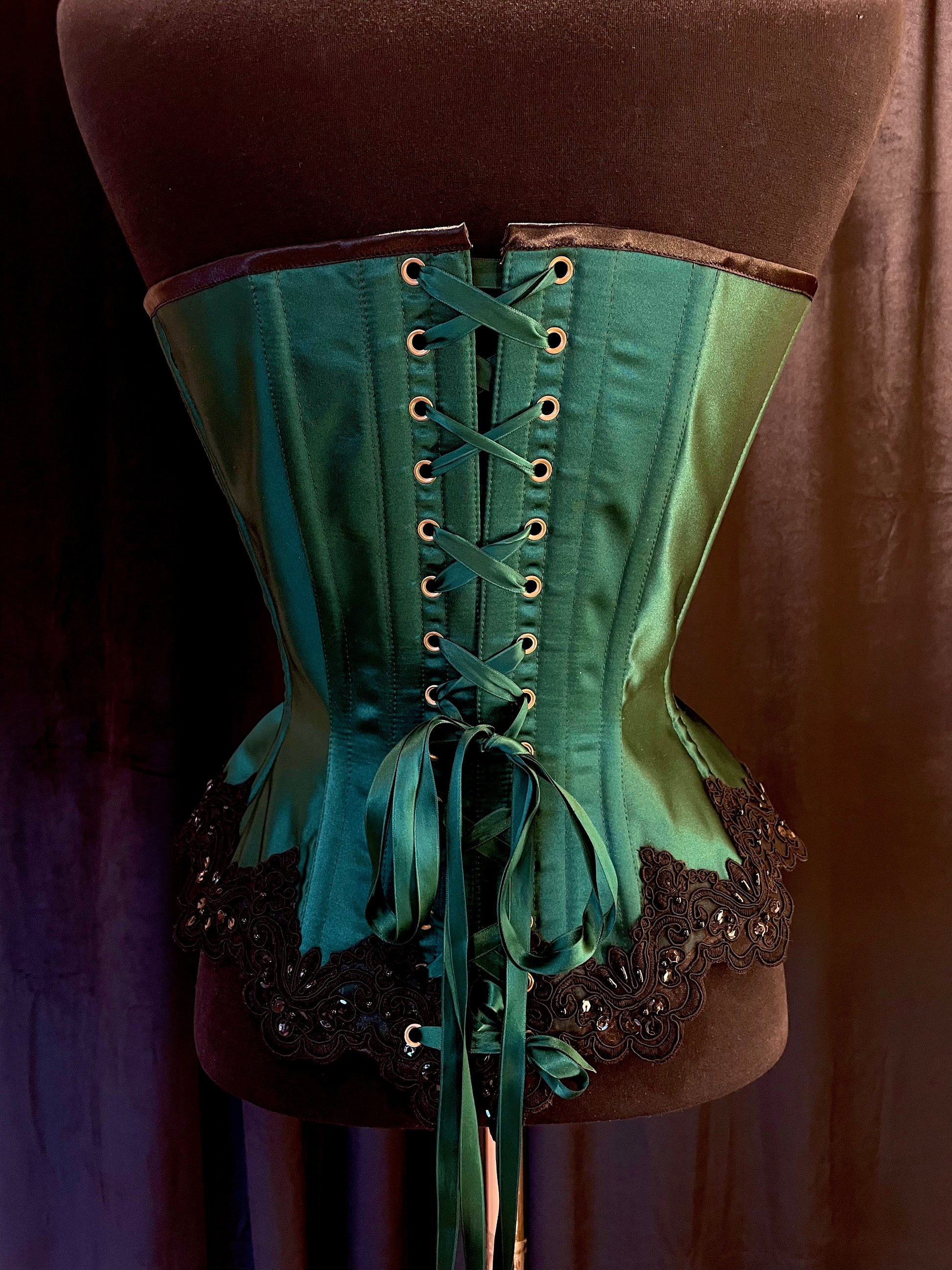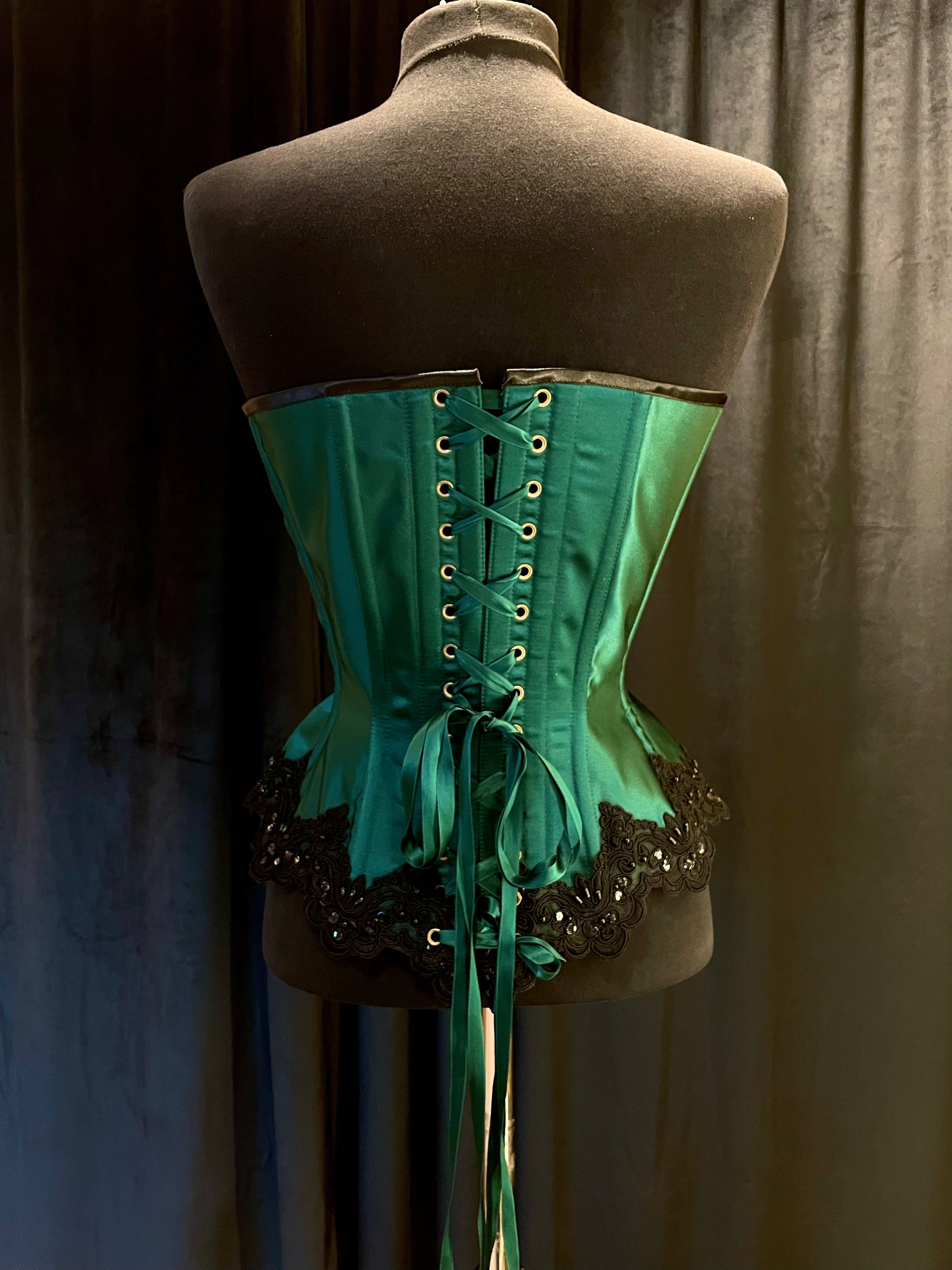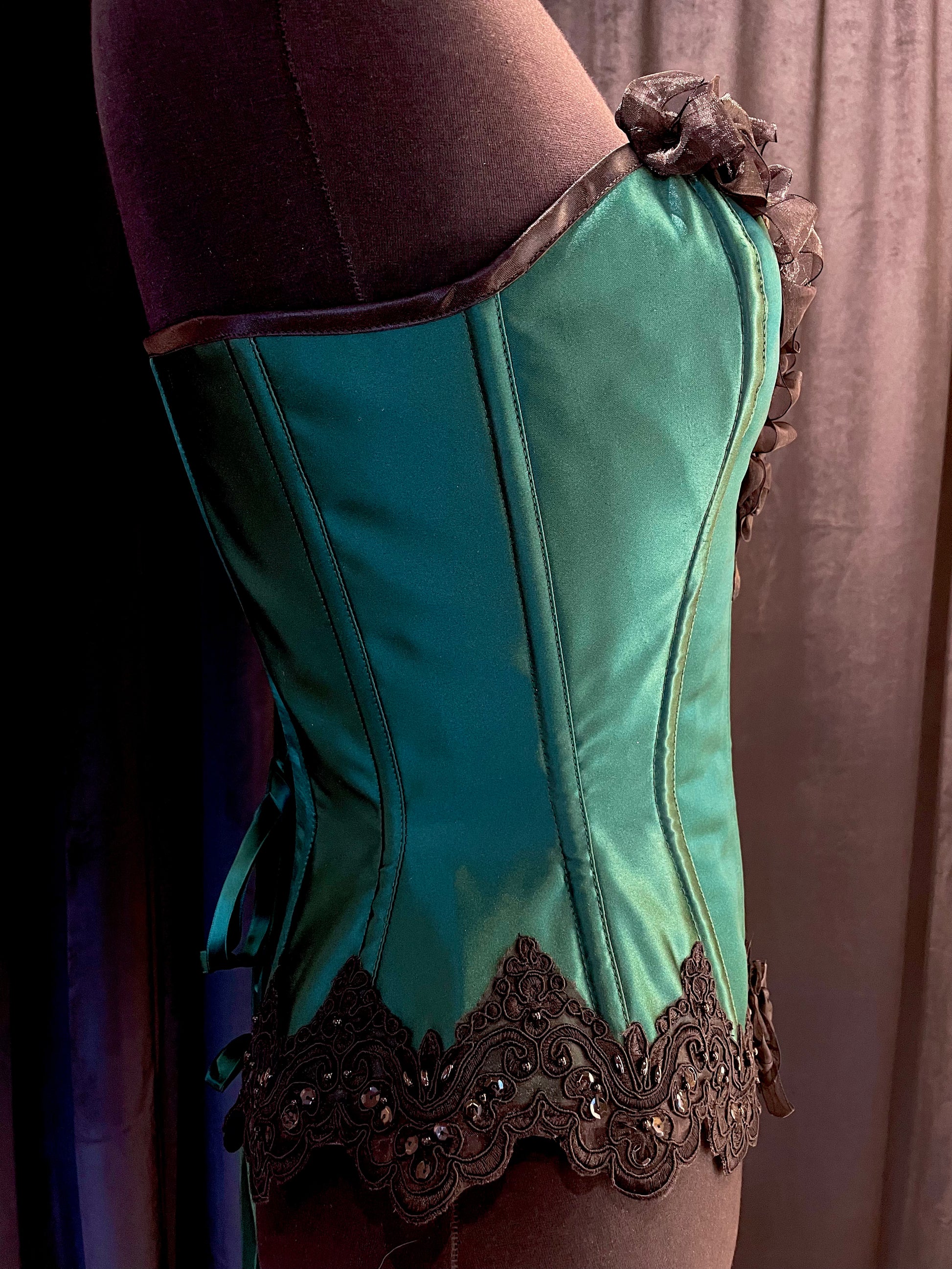 Upea ja ylellinen smaragdin vihreä ja koristeellinen korsetti! Helmikirjailtu pitsi, hennot musta ruusut ja käsin ommellut kimaltavat kivet kääntävät takuulla katseet. Sopii loistavasti burleskitapahtumiin, ylellisiin iltoihin ja vaikka makuuhuoneeseen. Korsetissa on myös "black swan" tunnelmaa ja tuo mieleen pimeyden kuningattaren.