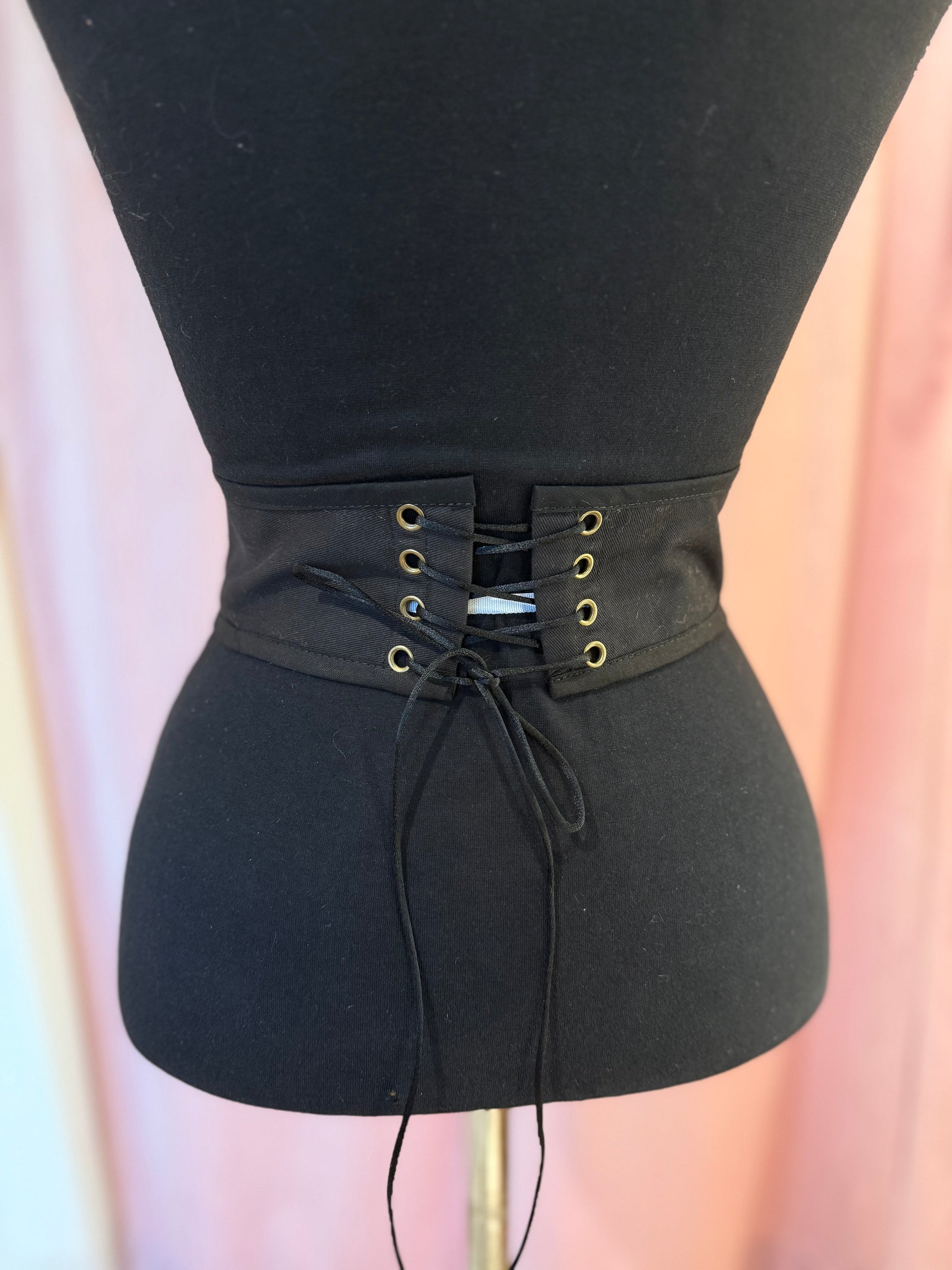 Soveltuu vaikka mekon päälle ja voi nauhaa vaihtamalla jättää reilustikin auki. Ota mitatessa huomioon alle tulevat vaatteet.