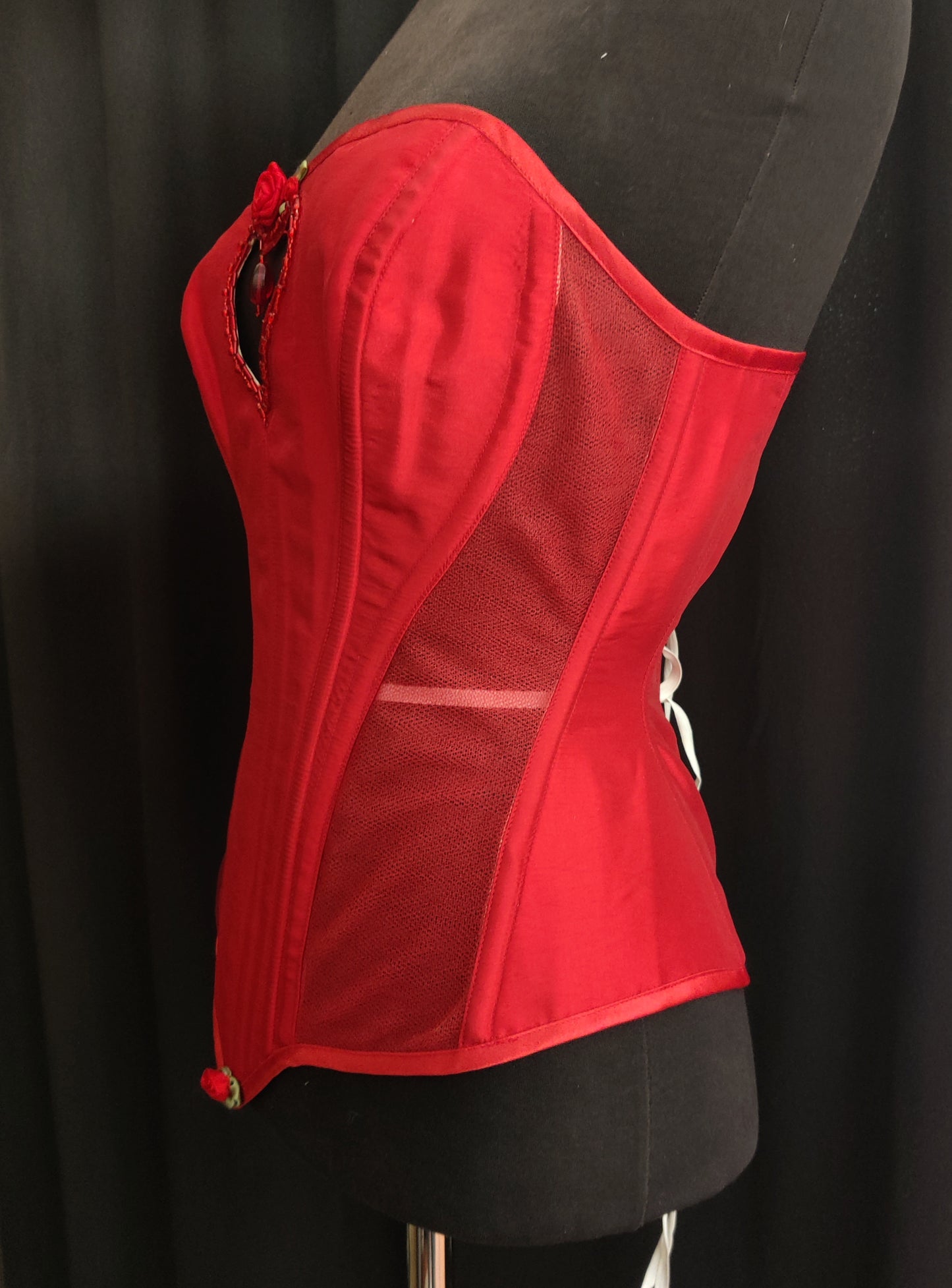 Romanttinen punainen korsetti sydänikkunalla ja helmikirjailulla. Sivuissa on myös läpikuultavat paneelit. Oivallinen teemapäiviin ja rakkautta kumpuaviin hetkiin! Korsetin idea tuli sosiaalisessa mediassa pyörivässä "bleeding heart" trendistä, jossa paitoihin leikattiin sydämen muotoinen reikä, ja tämä kirjailtiin punaisilla helmillä.