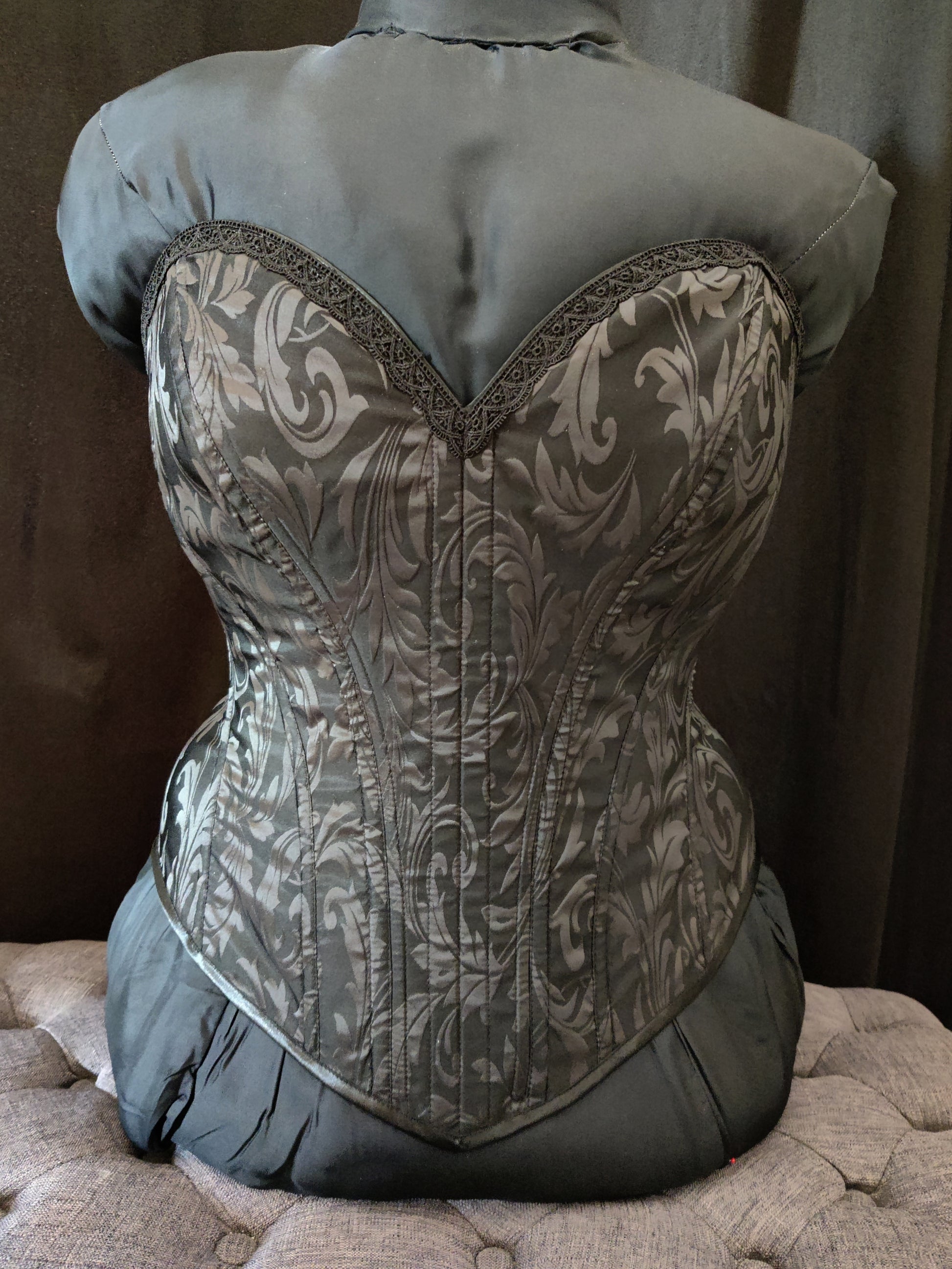 Asiakkaalle tehty mittamuutoskorsetti. Tähän yhdistettiin elementtejä valmiista tuotteista, pohjana oli Vanisha korsettimme, johon asiakas halusi toisesta korsetista kankaan, ja kolmannesta korsetista pitsin. Tällä tavalla voit itse yhdistellä haluamiasi elementtejä, joista tehdään sinulle uniikki korsetti!