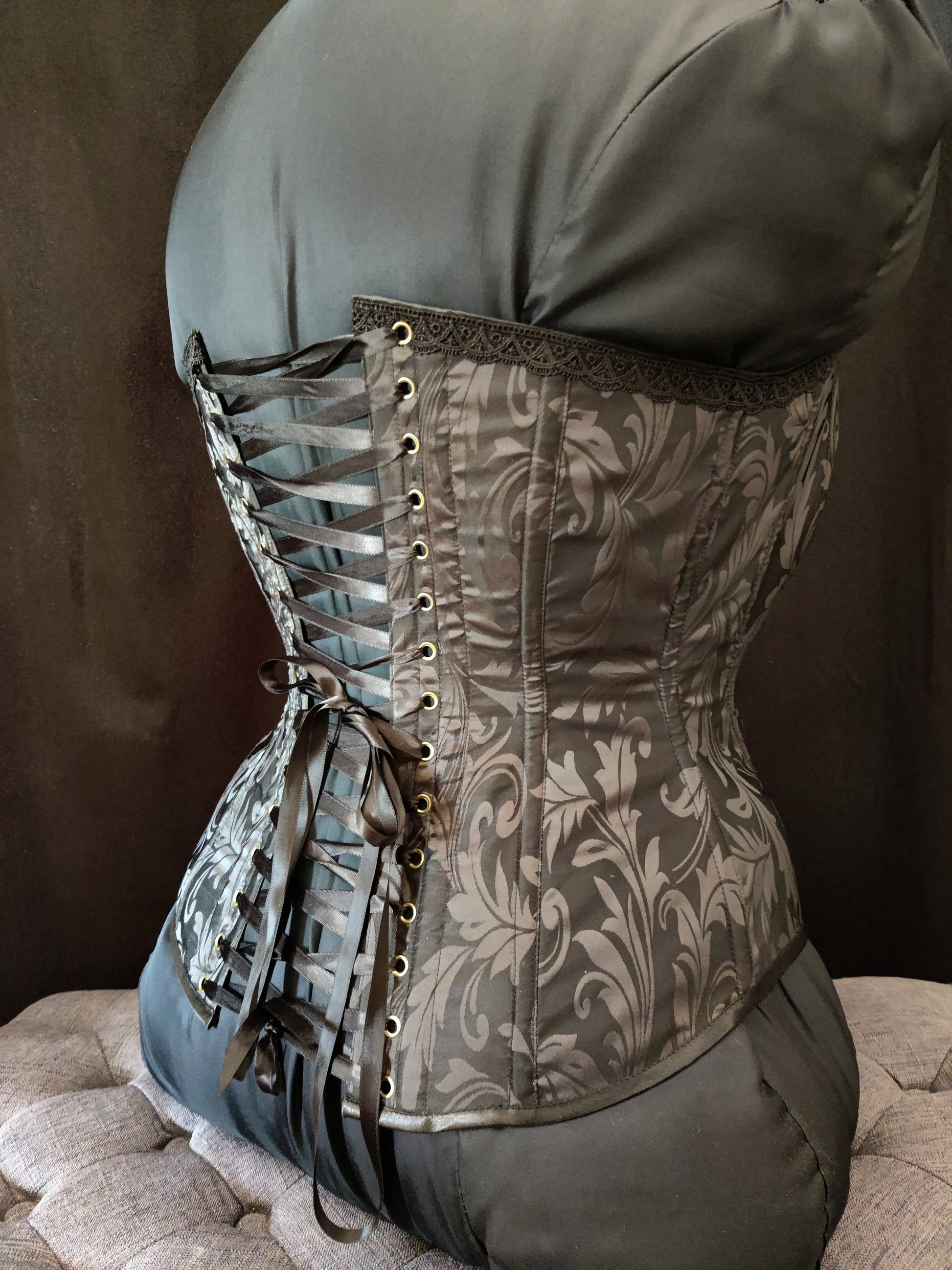 Korsetti on vuoritettu puuvillacoutililla, ja päällikangas on koristeellista polyesteria. Luut ovat synteettistä valaanluuta sekä terässpiraalia.