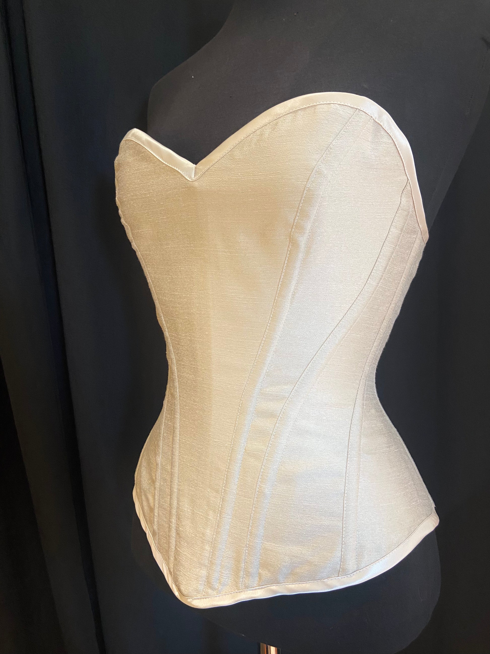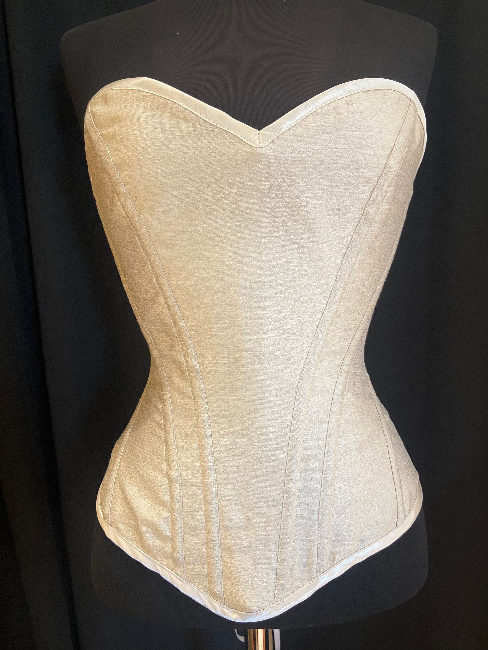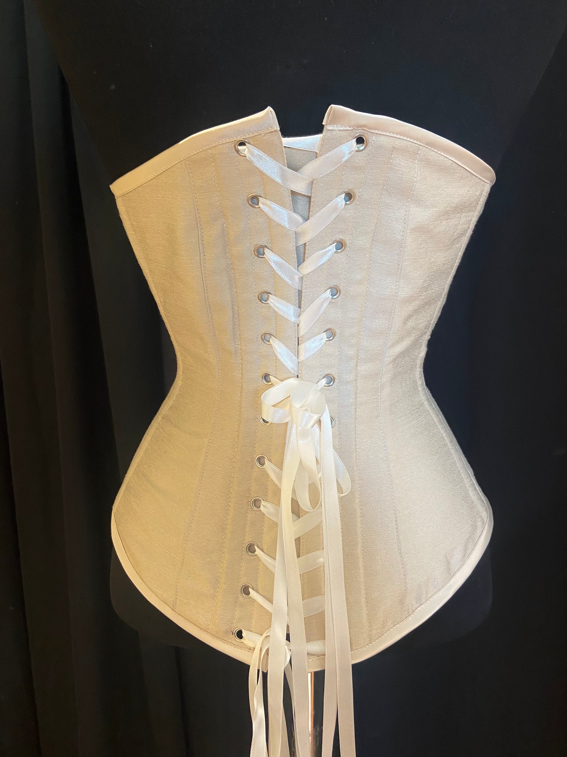 Vaalean hiekan sävyinen, pellavanväriä muistuttava rinnan yli korsetti. Kokonaan luutettu synteettisellä valaanluulla ja spiraalilla. Soveltuu kohtalaiseen kiristykseen.