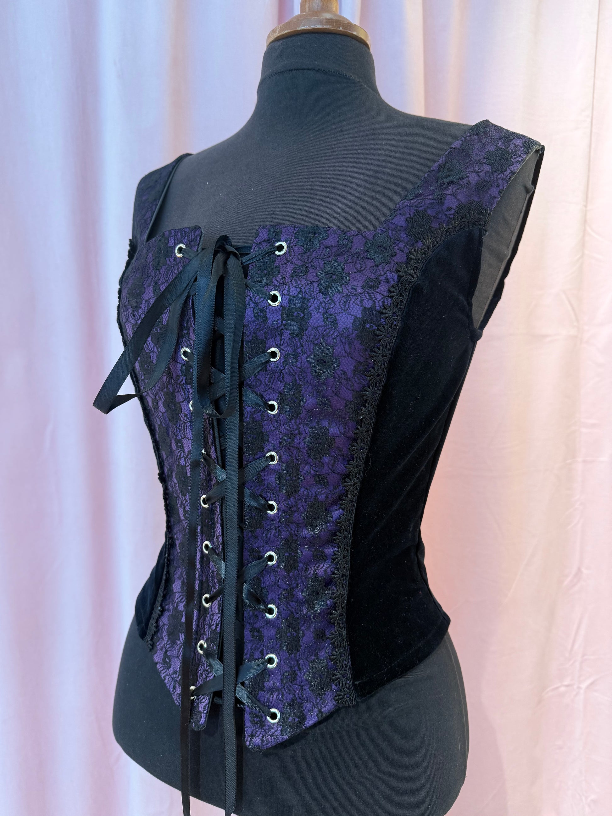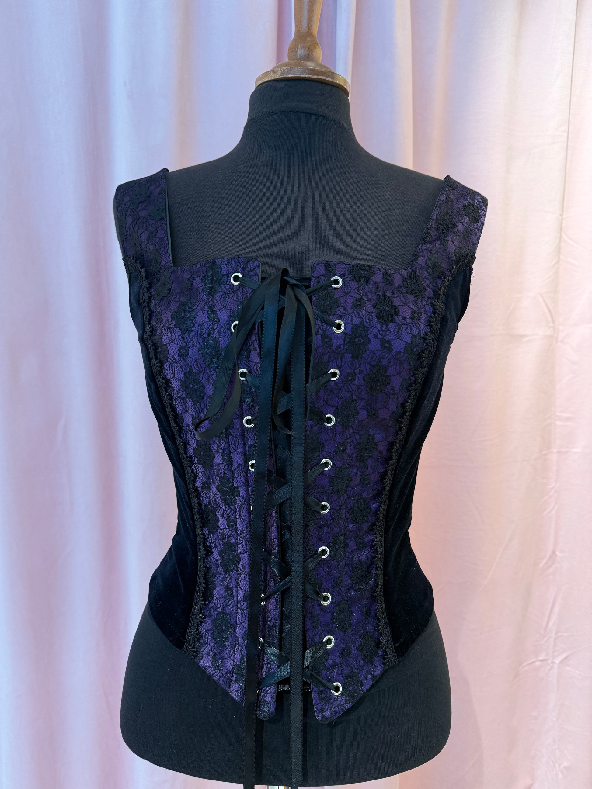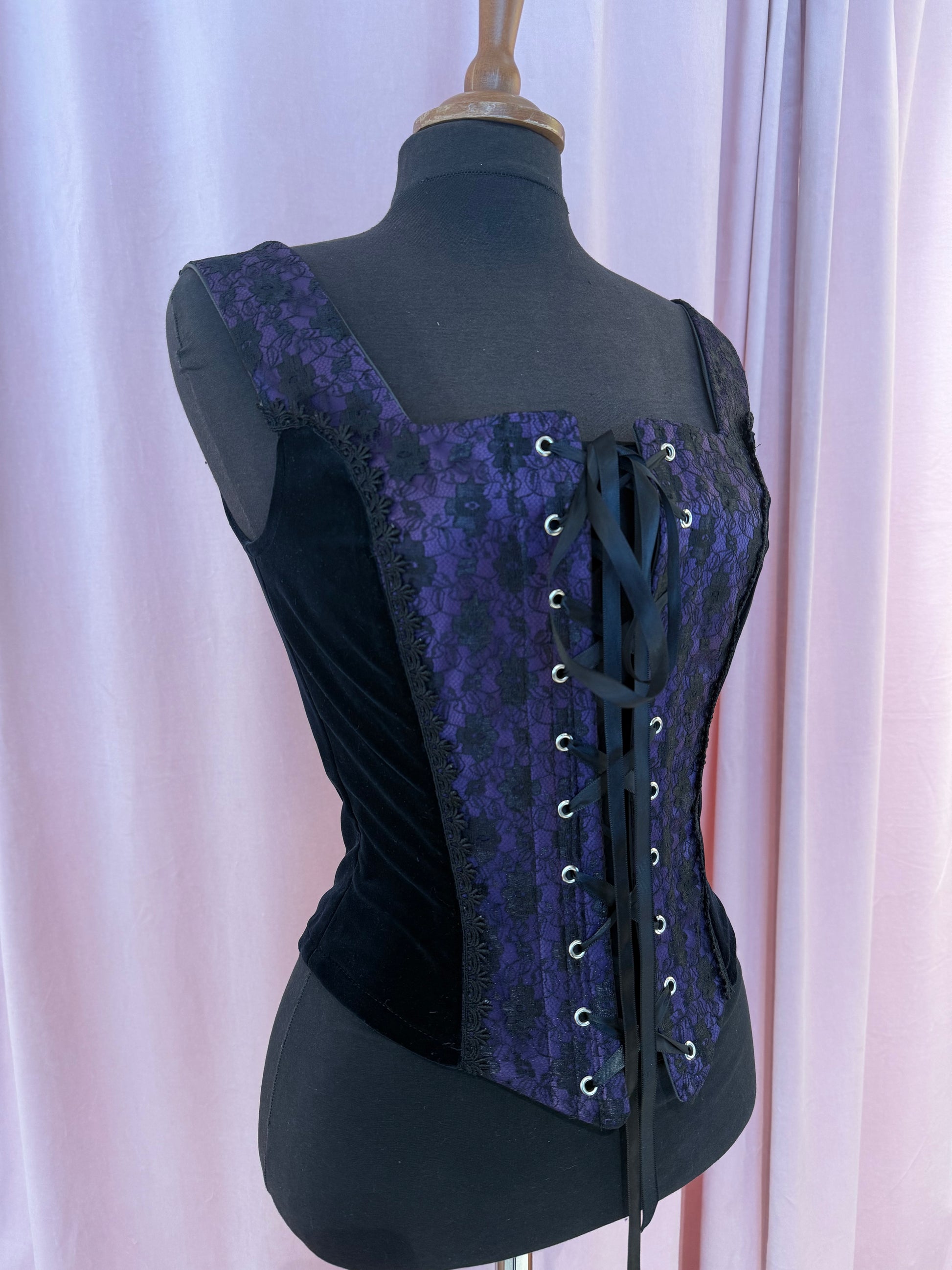 Ylellistä puuvillasamettia. Edessä lilaa morsiussatiinia, jonka päällä musta pitsi. Nyörityksen alla varjolista.