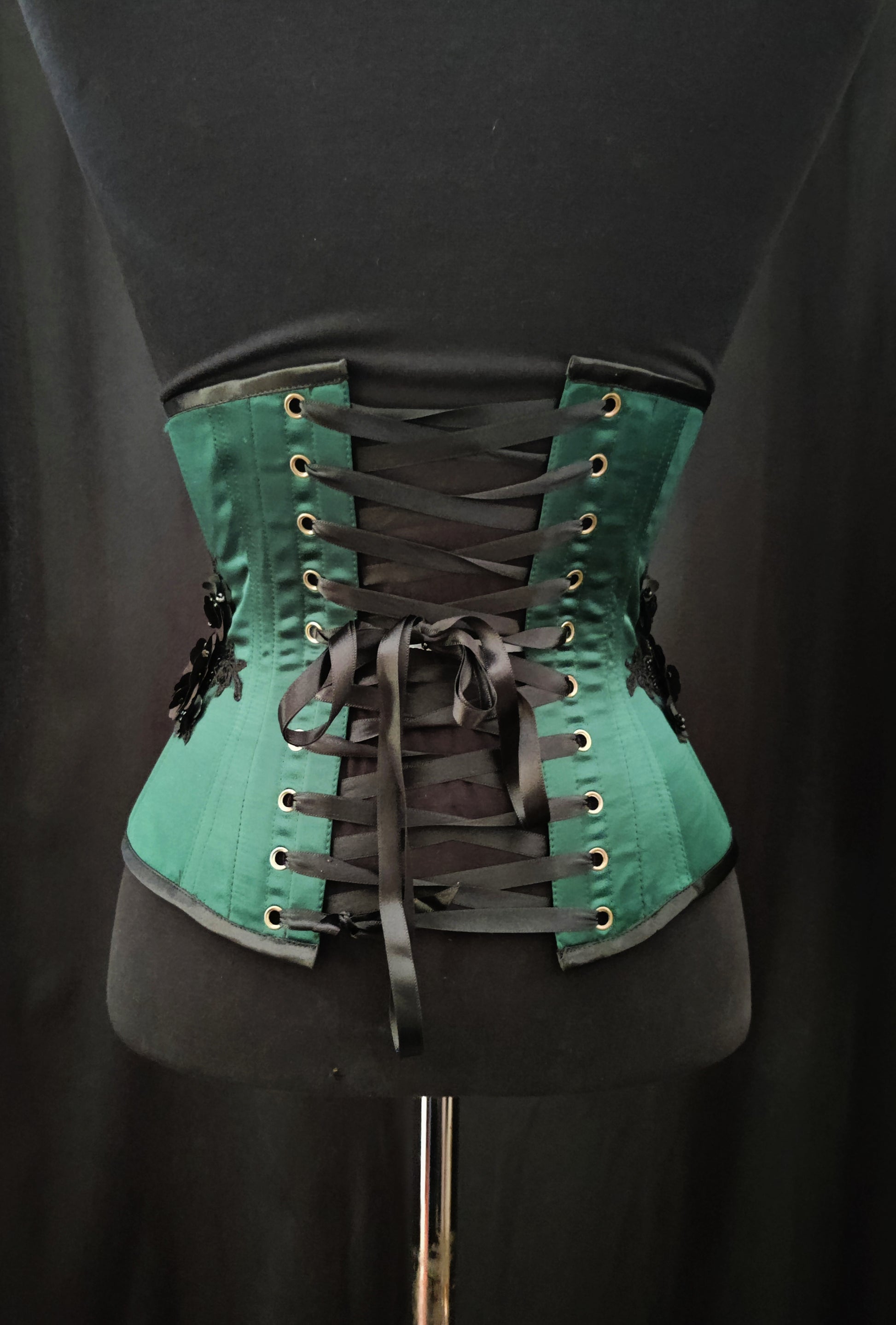 Vuori on puuvillacoutilia joka on kestävä ja hengittävä korsettien tekoon kehitetty kangas. Päällikangas on vihreää morsiussatiinia, ja luut terässpiraalia joten korsetti asettuu kurveillesi upeasti halaten. Korsetti on tehty meidän Rakel-kaavallamme, joka on kurvikas mutta todella mukava peruskorsetti. Se sopii melkein jokaiselle eri kehontyypille monipuolisuutensa vuoksi. Tämän korsetin yläreuna on normaalia matalampi, joten se sopii hyvin myös lyhyempi selkäisille käyttäjille.