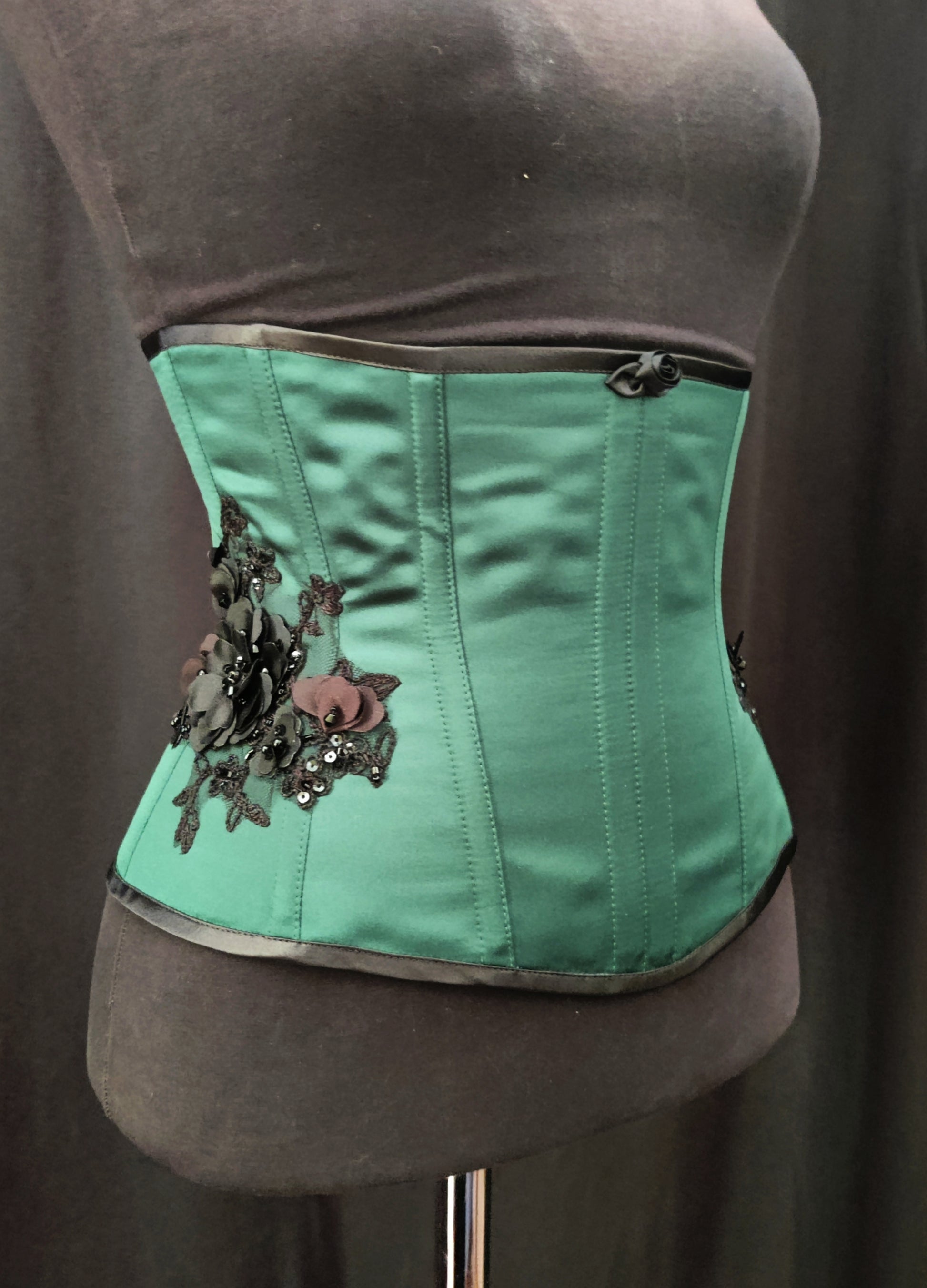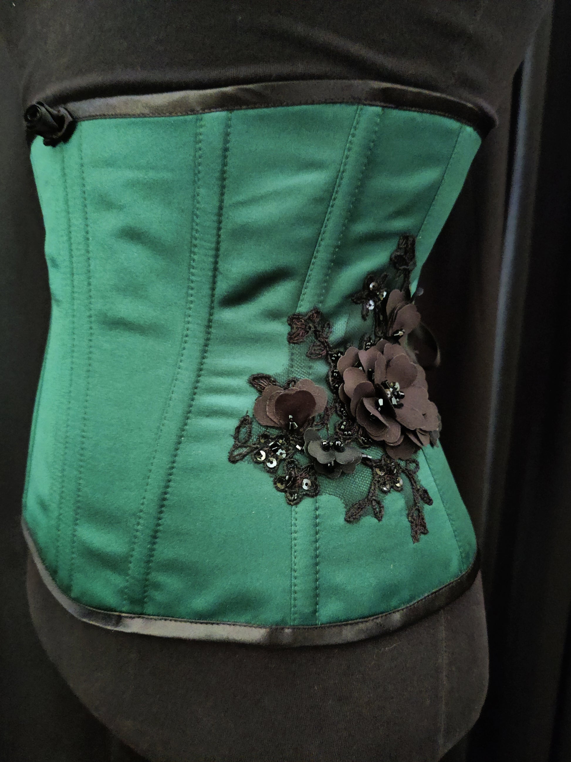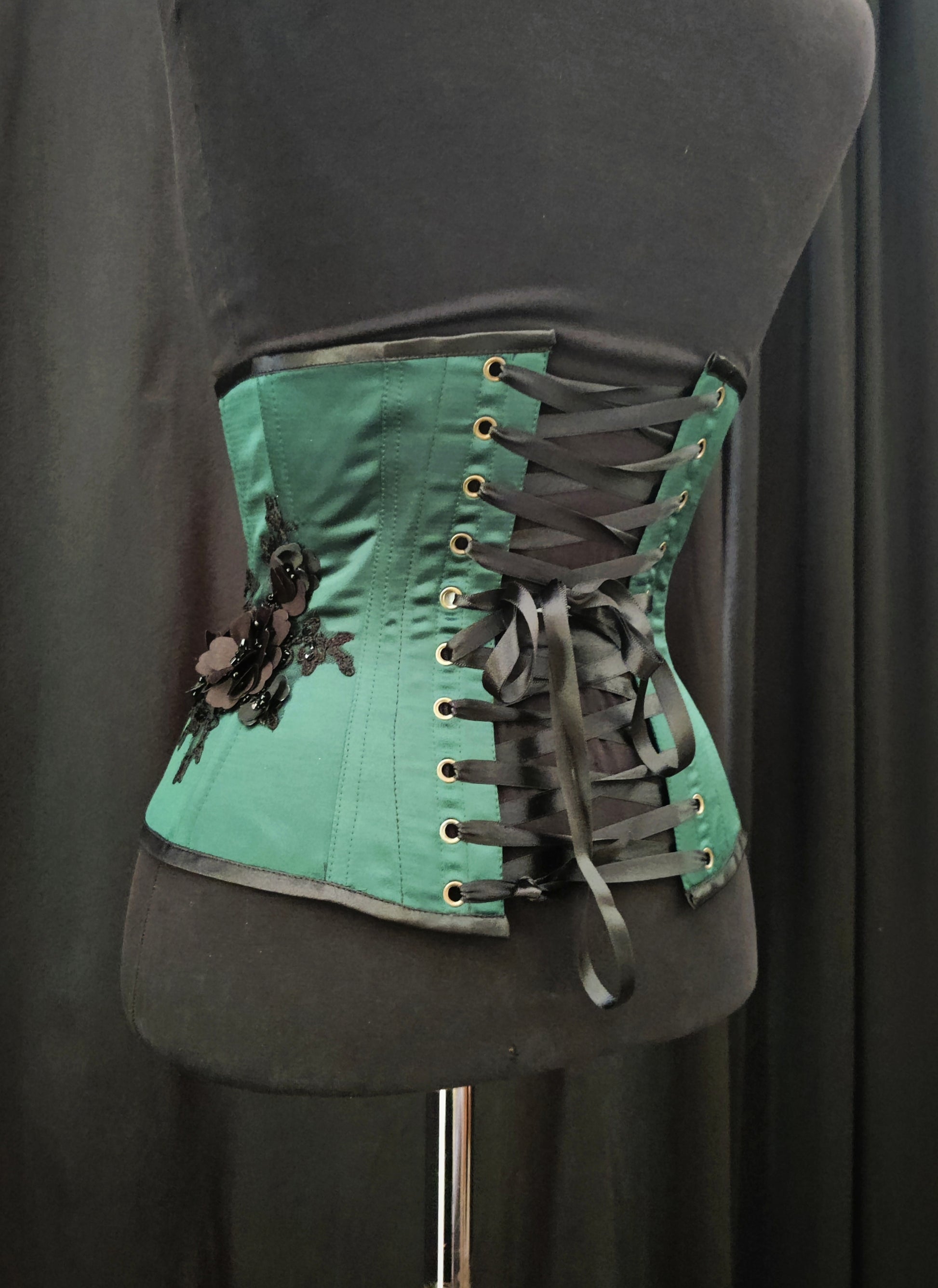 Lumoava smaragdin vihreä vyötärökorsetti mustilla yksityiskohdilla. Ylä ja ala-reuna on viimeistelty mustalla satiininauhalla, keskellä edessä yläreunassa on musta ruusu, ja vyötäröä koristaa mustat 3D kukkapitsit. Tämä korsetti tuo ylellisyyttä jokaiseen asuun.