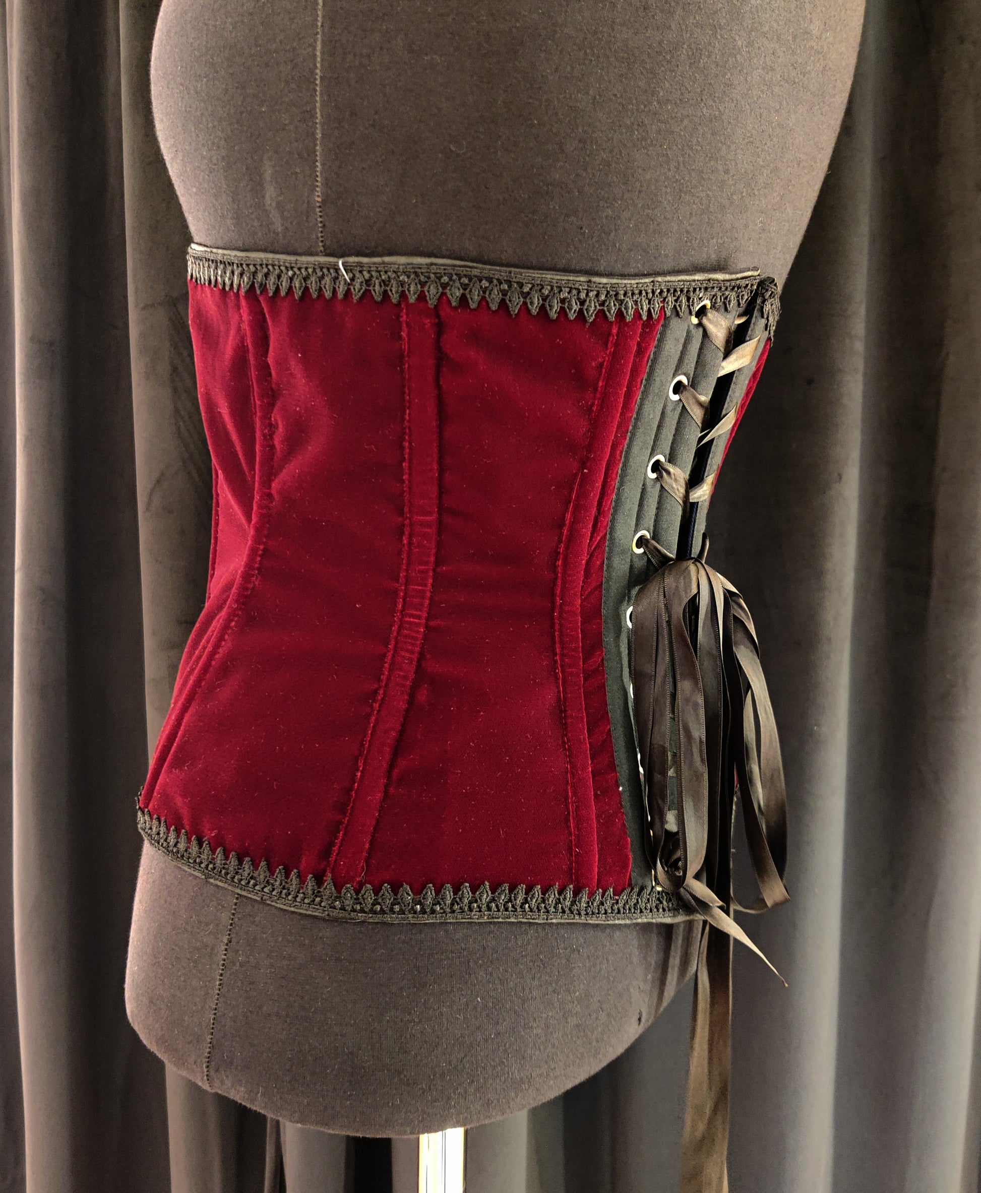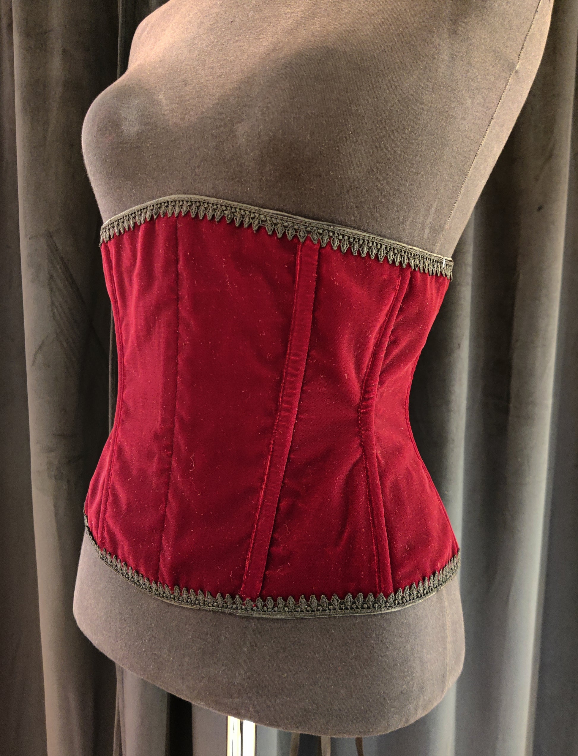 Ylellinen viininpunainen samettinen vyötärökorsetti. Sametti on todella kaunis kangas sen nukan ominaisuuden vuoksi, joka ei heijasta valoa vaan luo todella syvän värin. Tämä korsetti on tehty Rakel-kaavallamme, joka on kurvikas mutta todella mukava. Se sopii melkein jokaiselle eri kehontyypille. Tätä korsettia koristaa ylä- ja alareunassa musta pitsi, joka tuo pientä yksityiskohtaa toimien kuitenkin yksinkertaisena kokonaisuutena.